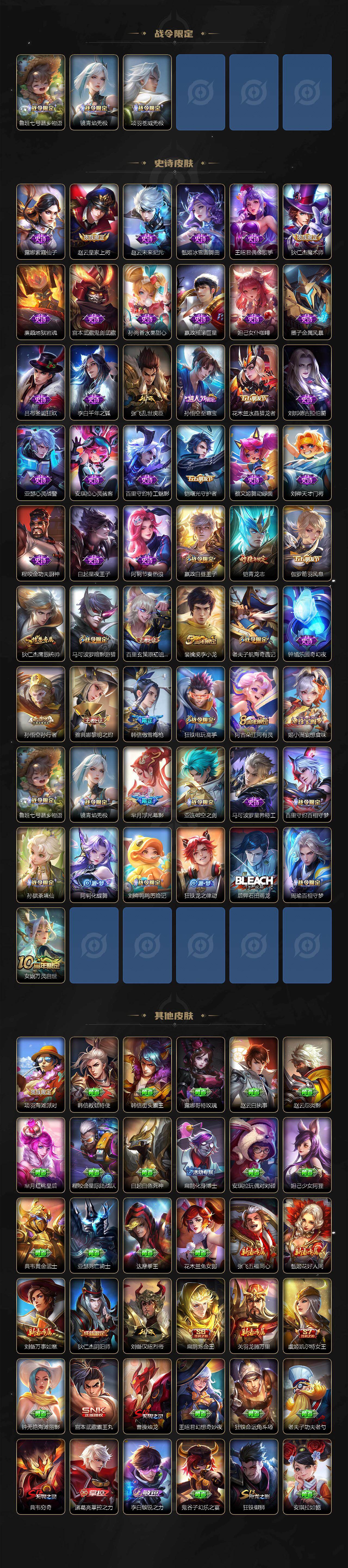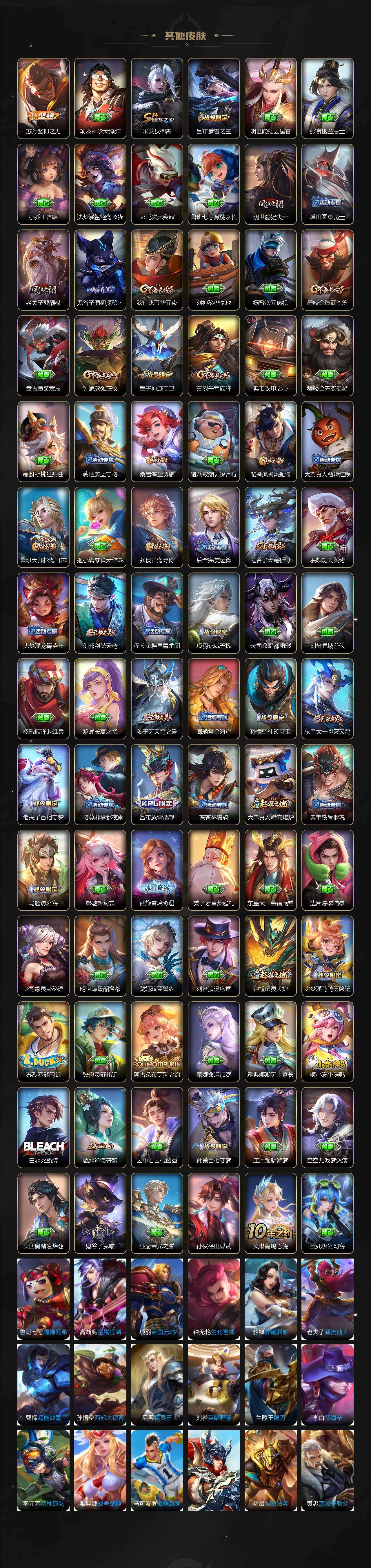 【限定皮肤】:姜子牙天穹之誓,杨戬破阵退雄兵,狄仁杰阴阳师,虞姬凯尔特女王,赵云皇家上将,墨子神
