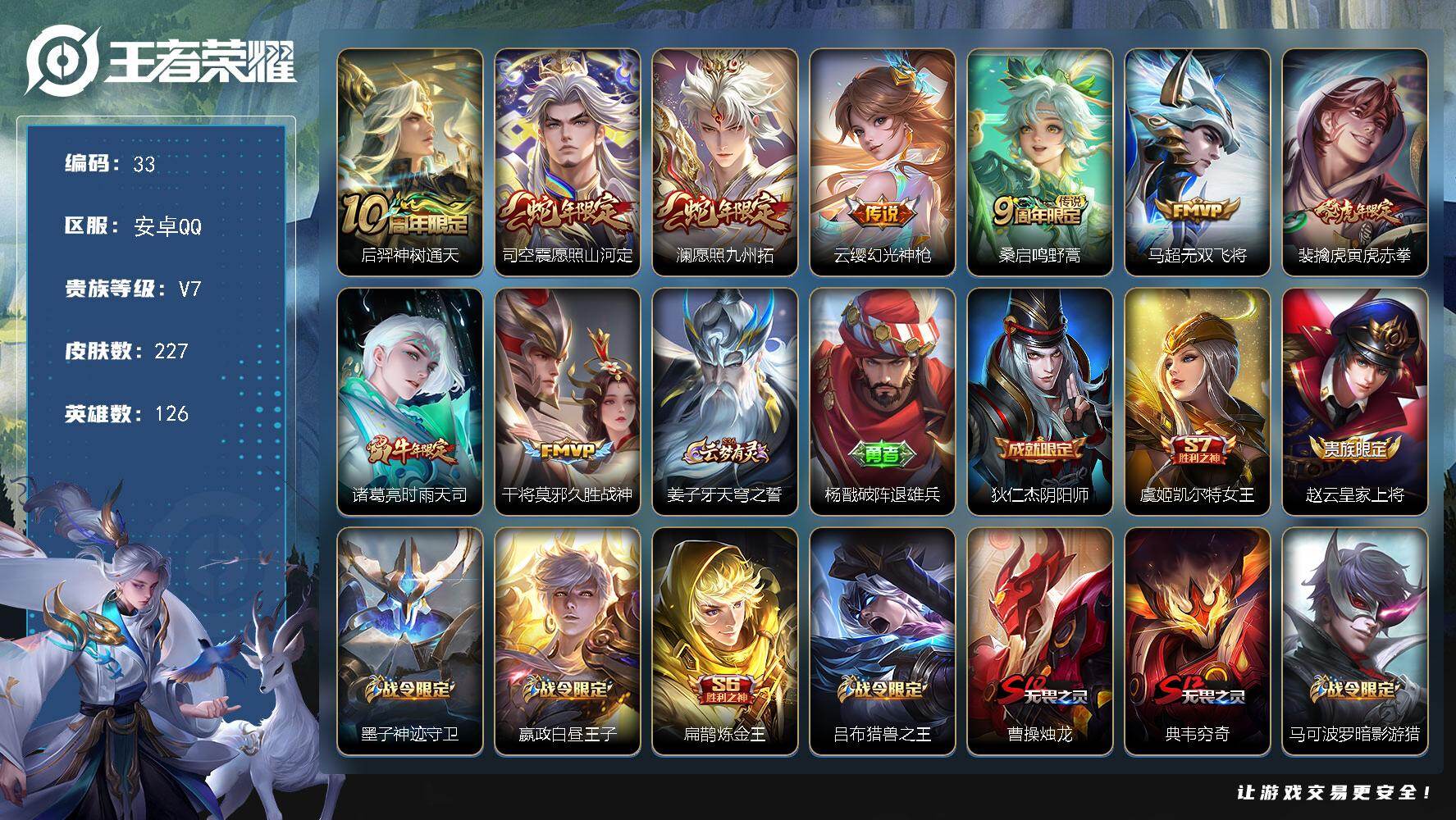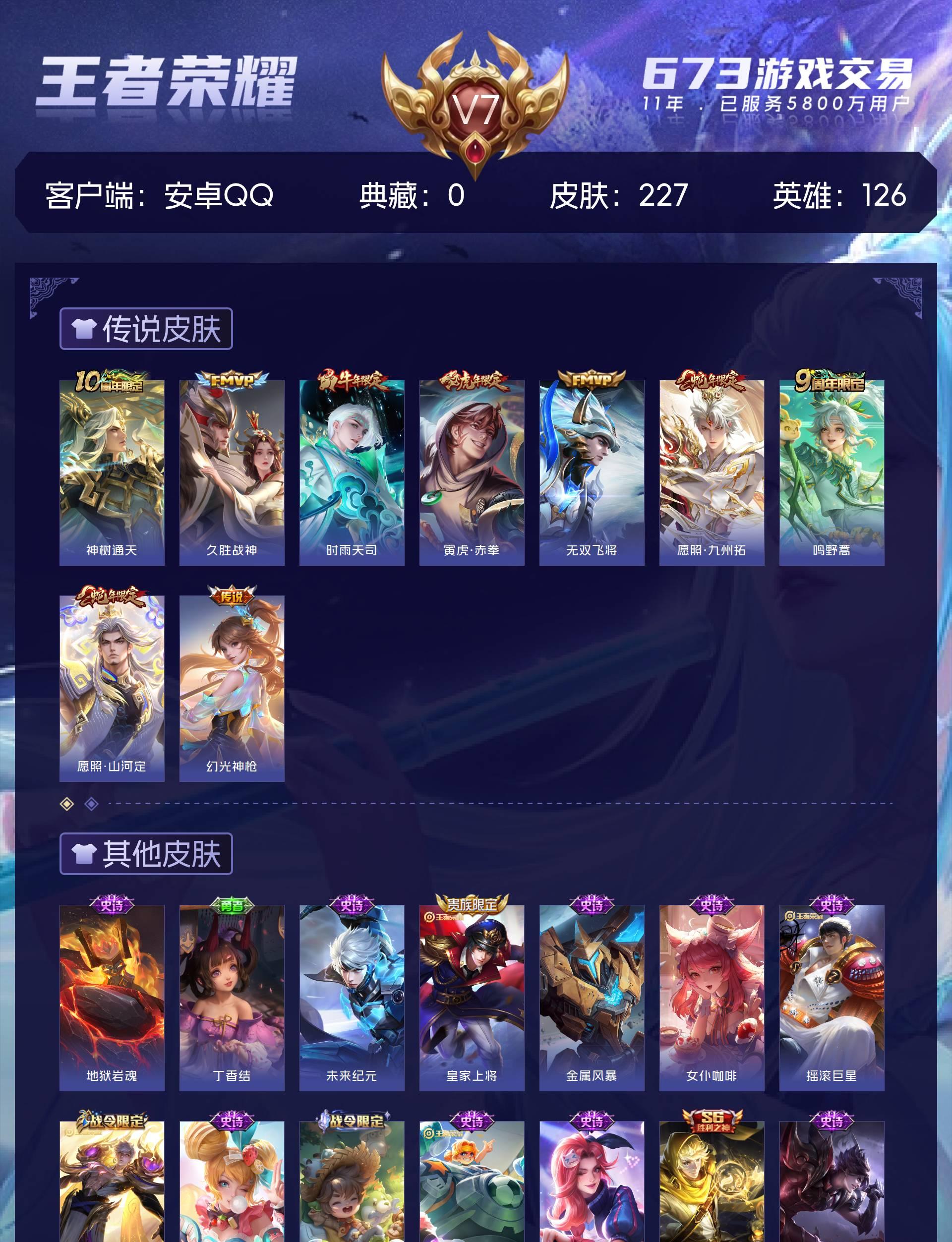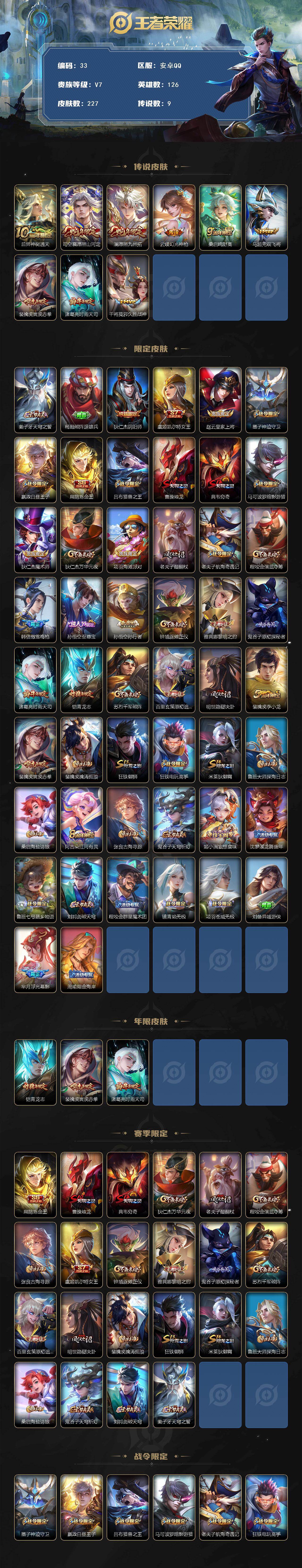 【33】安卓Q-V7-最强王者段位-126英雄-227皮肤-9传说-55史诗
