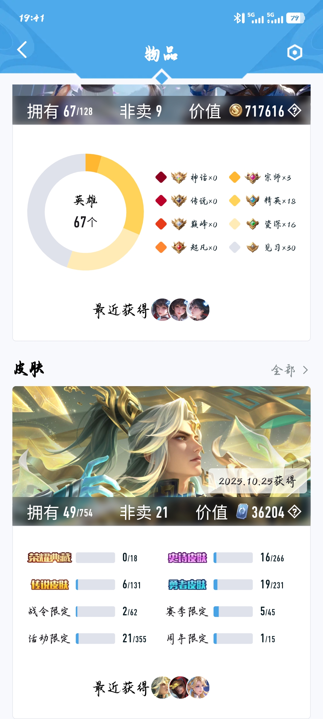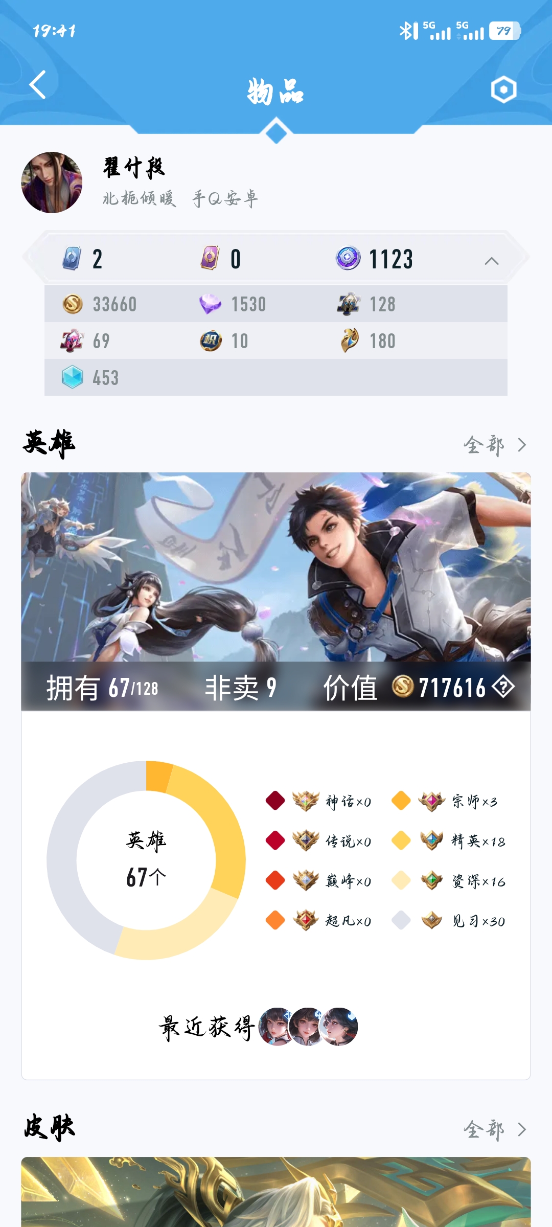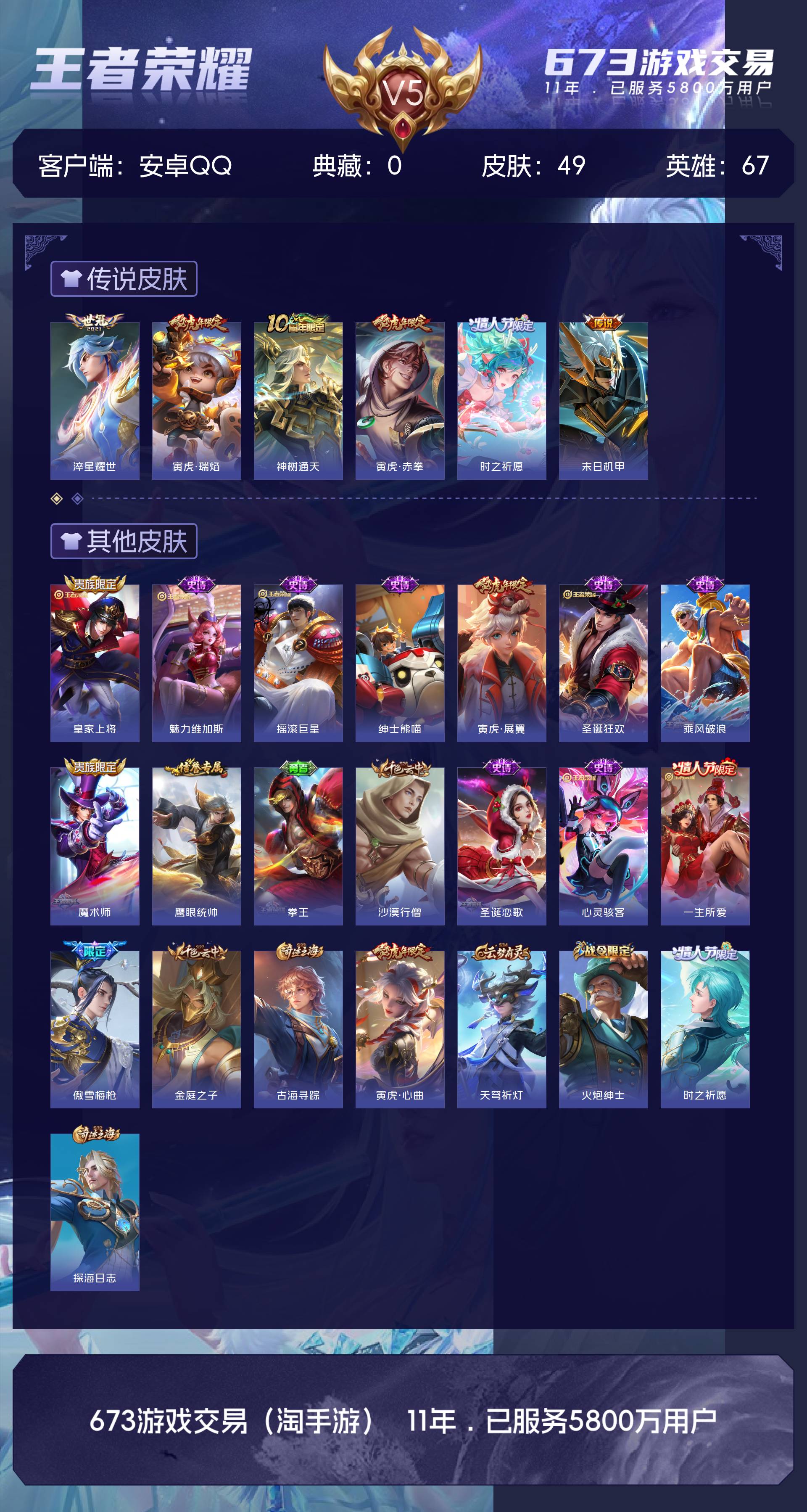 皮肤49 英雄67 荣耀黄金 传说6 其他皮肤22-可以当做小号可讲价皮肤多多
