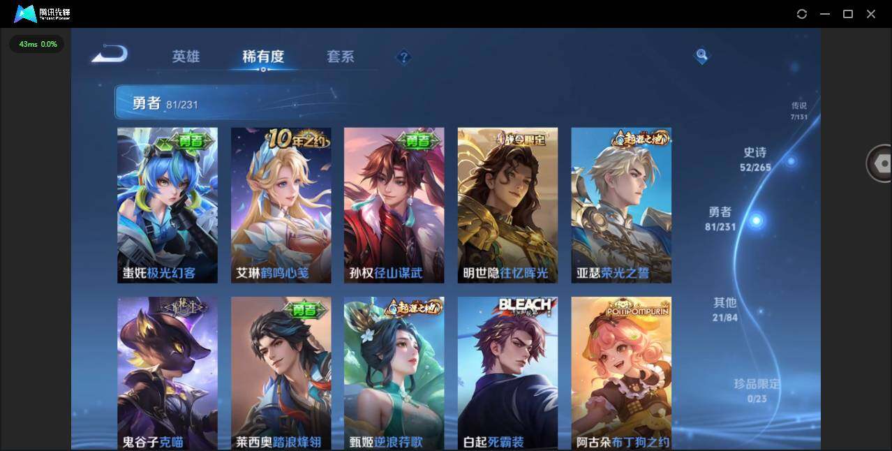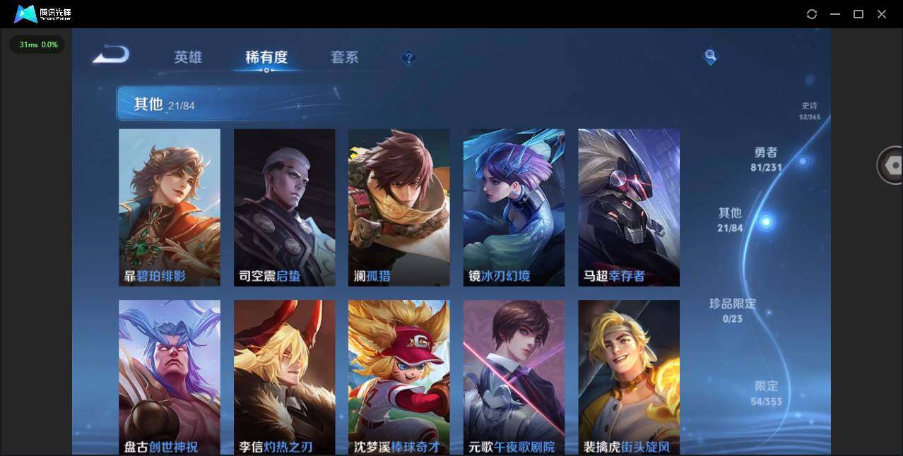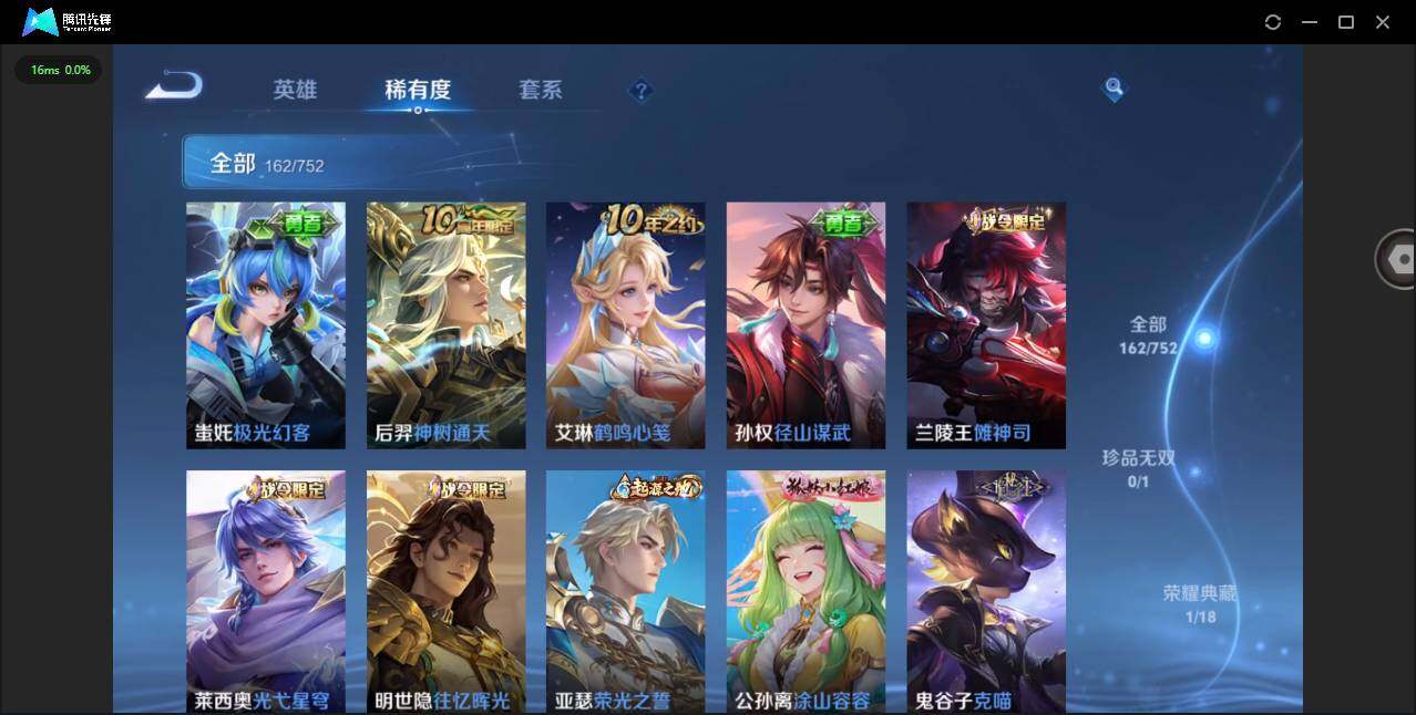 /贵族等级: V7 英雄数: 126 皮肤数: 162 荣耀水晶: 全息碎影 传说皮: 山海·苍雷引,澜逐花归海,幻光神枪,神树通天 限定皮: 李小龙,梁祝,龙胆,烈魂,至尊宝,五谷丰年,诗剑行,山海·玄木吟,鸣野蒿,逐霄战戟,愿照·九州拓