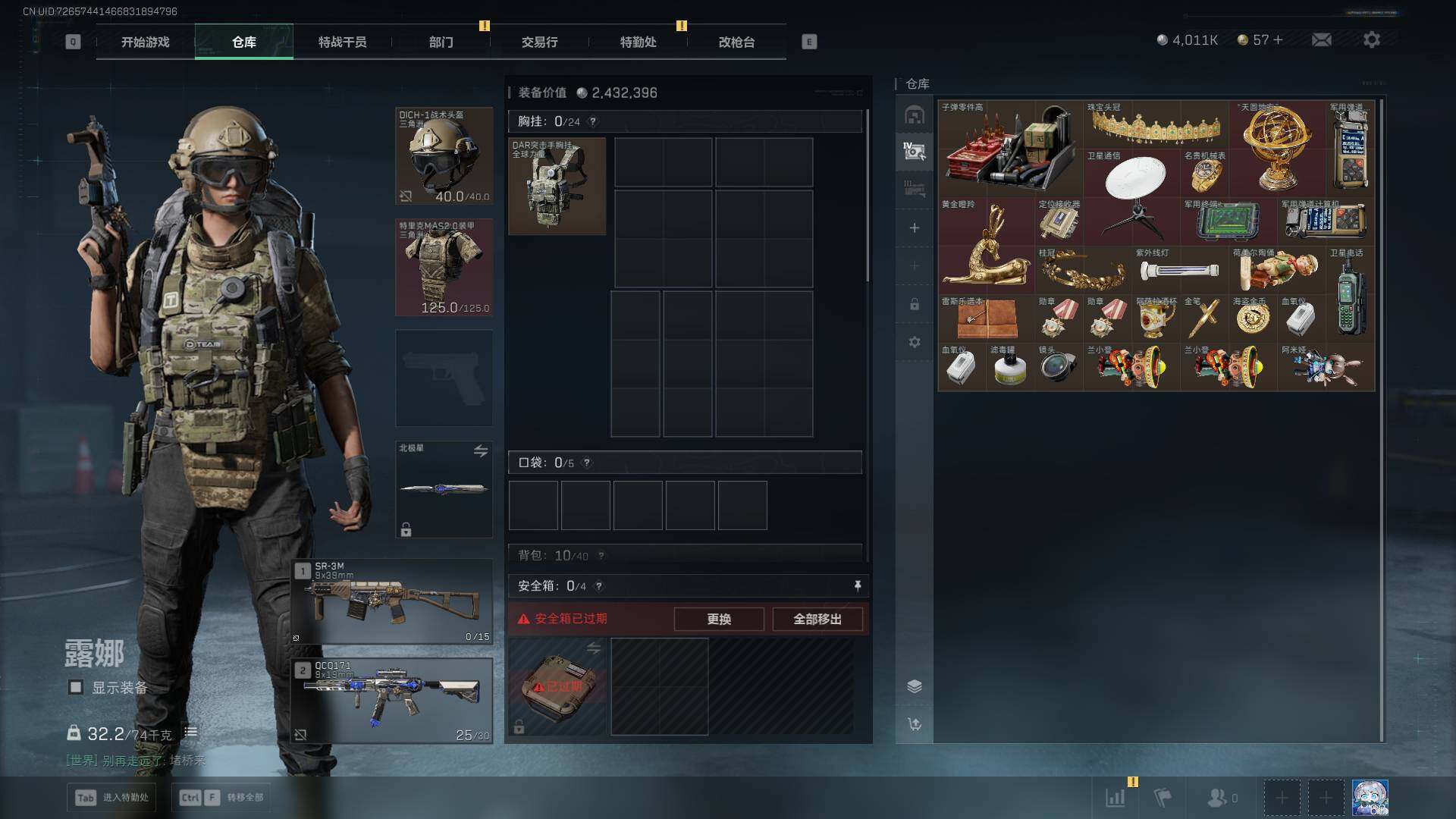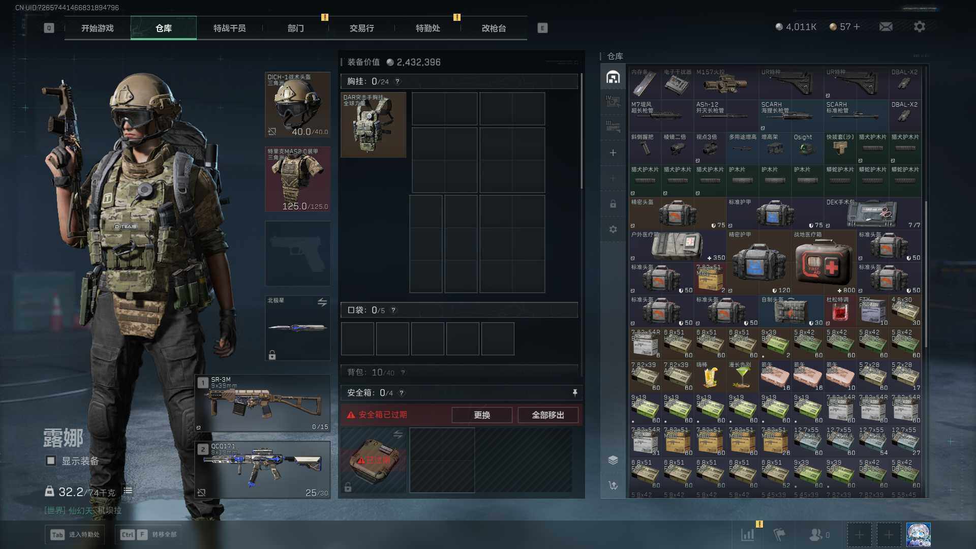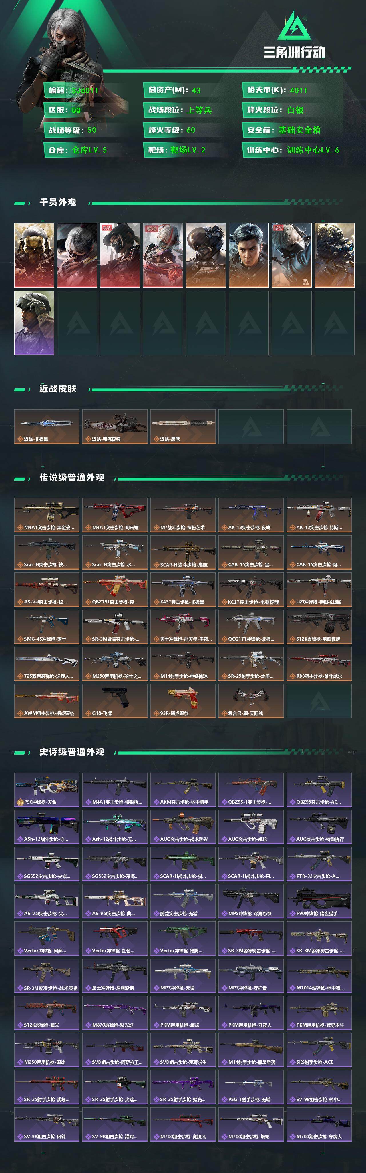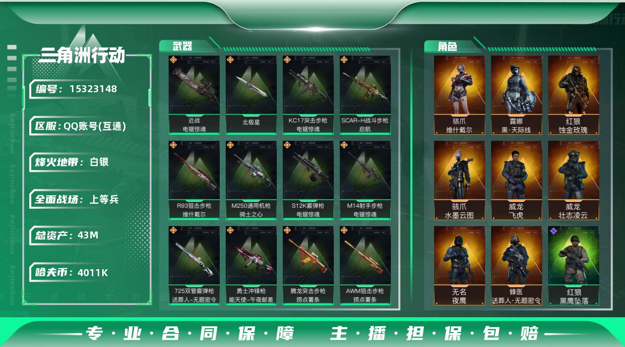 总资产(M):43M/哈夫币(K):4011K/哈夫币(K):4011K/传说枪皮数:29/全面战场