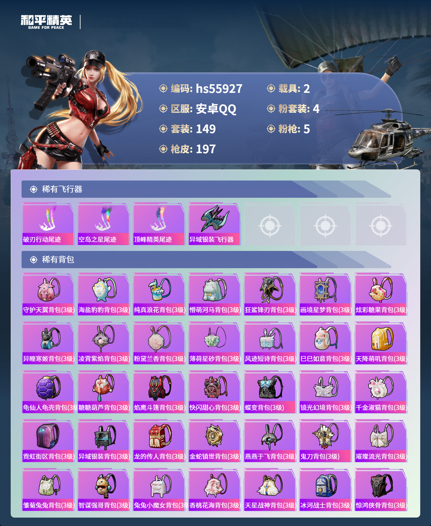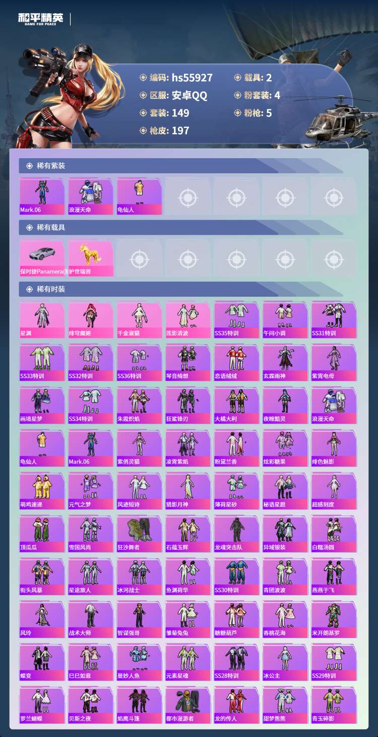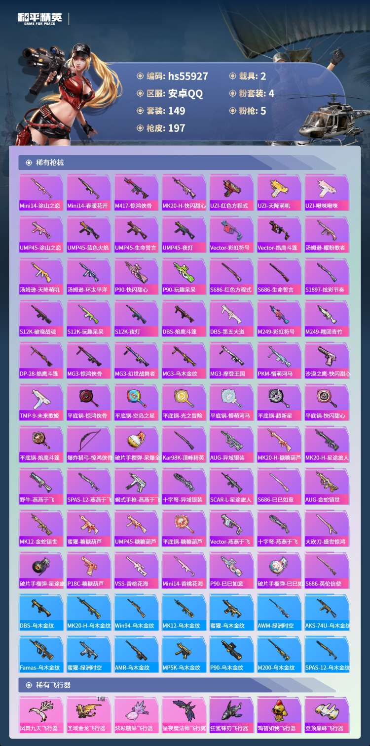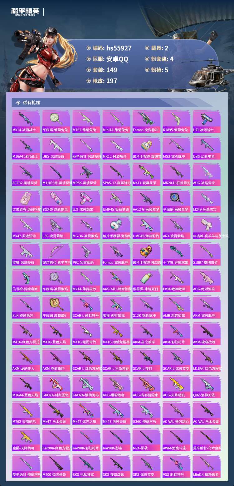 hs55927 安卓手Q-14王牌印记-4粉装-5特效枪-2载具-58958热力值-149套装-19