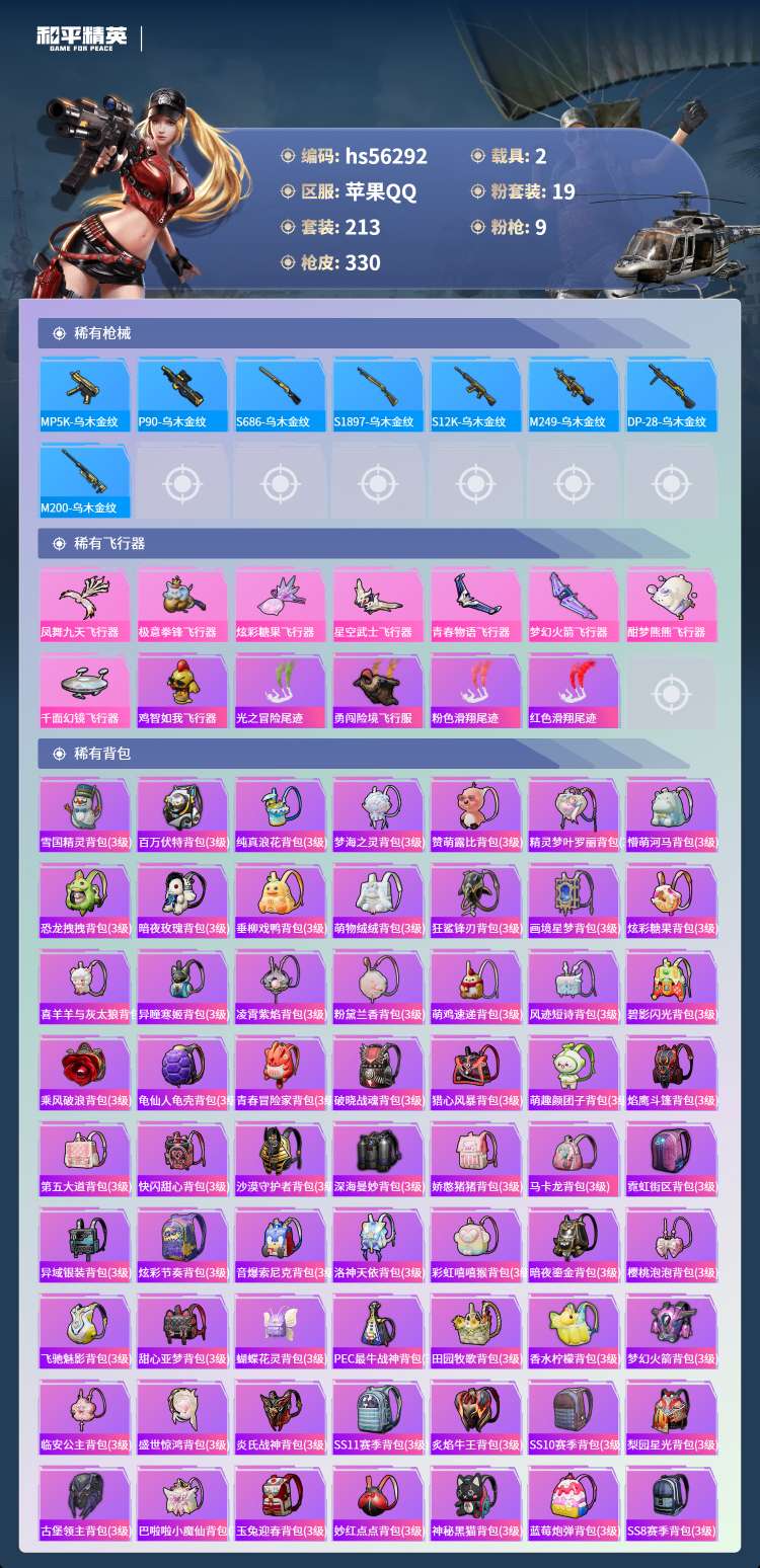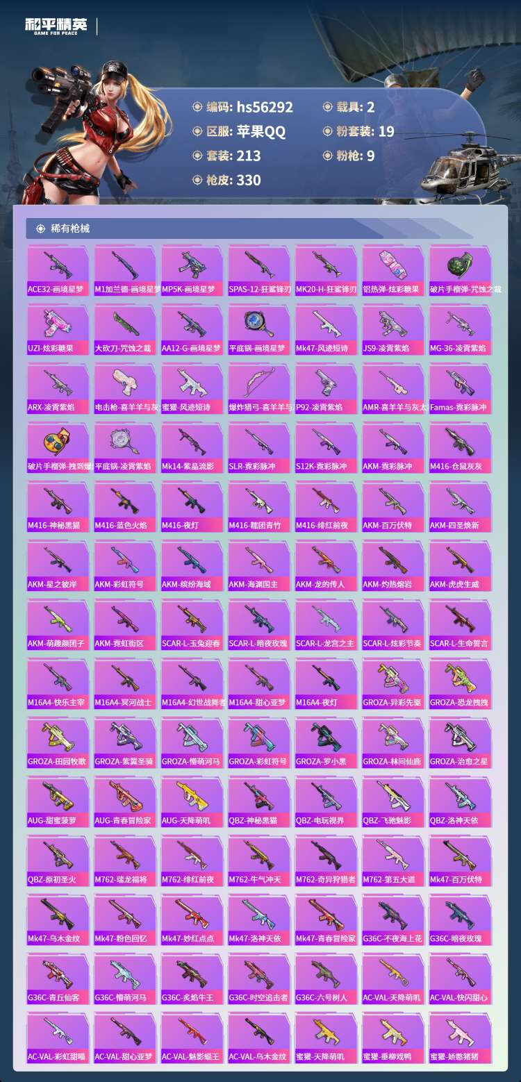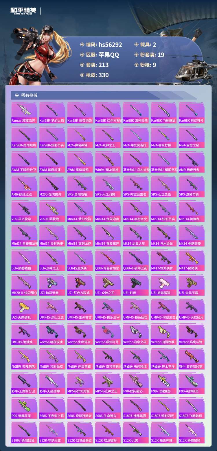 hs56292 苹果手Q-15王牌印记-1红装-19粉装-9特效枪-2载具-111145热力值-21