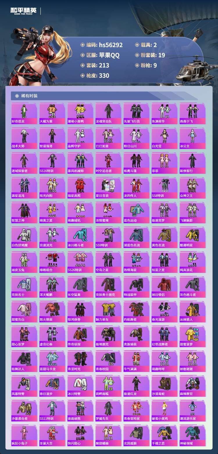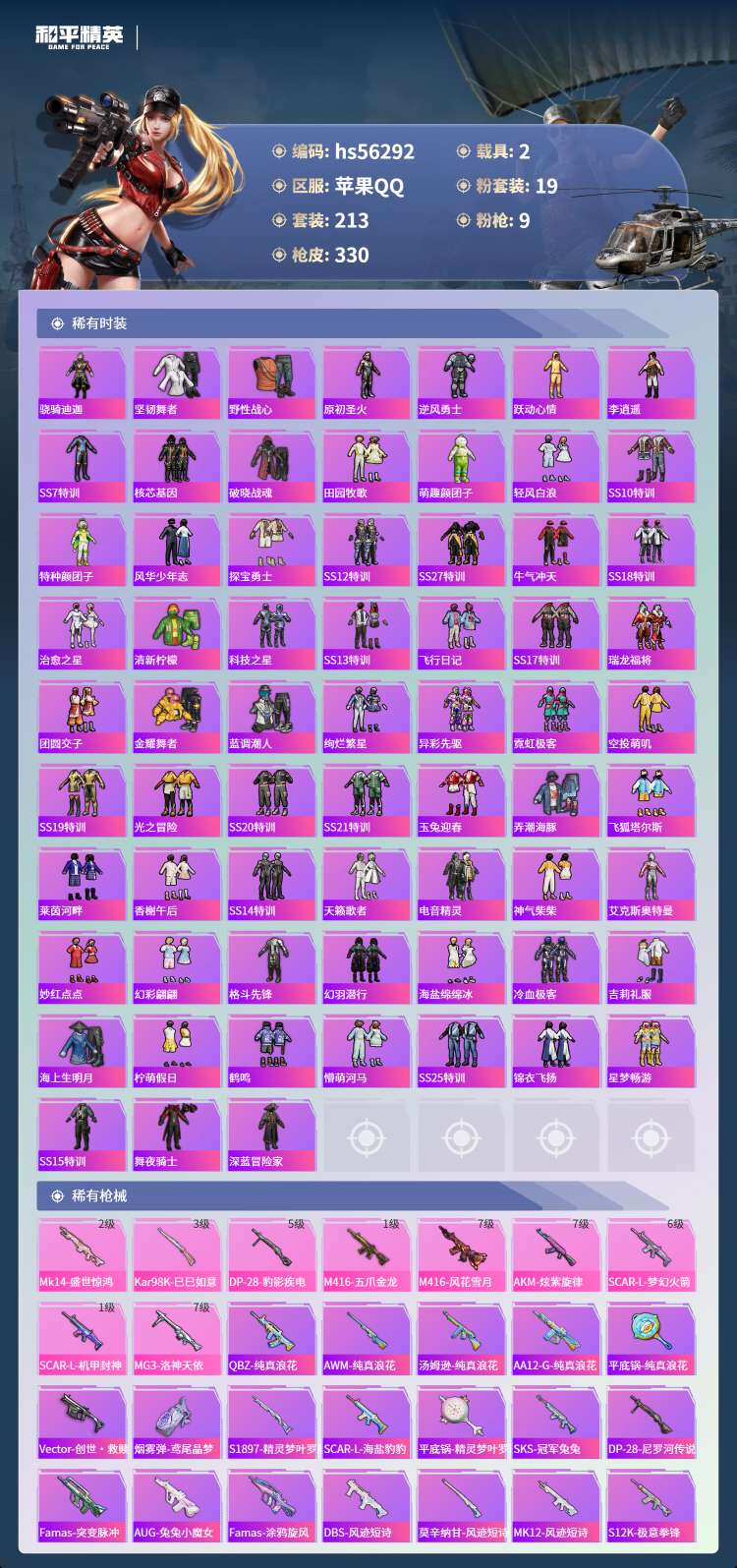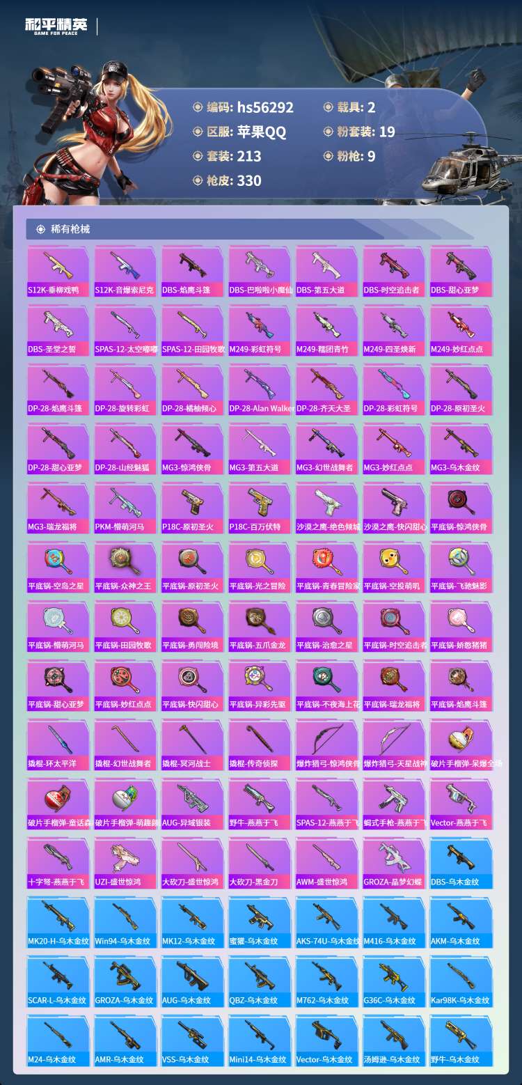 hs56292 苹果手Q-15王牌印记-1红装-19粉装-9特效枪-2载具-111145热力值-21