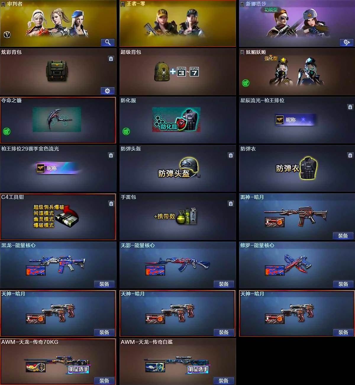 【皮肤】:雷神-暗月,黑龙-能量核心,无影-能量核心,AWM-天龙-传奇70KG,AWM-天龙-传奇白鲨,修罗-能量核心,天神-暗月*3