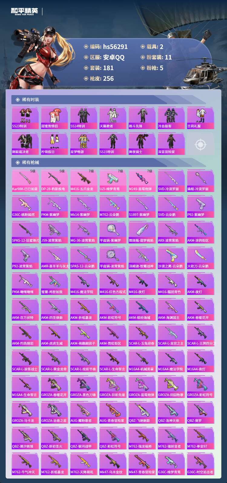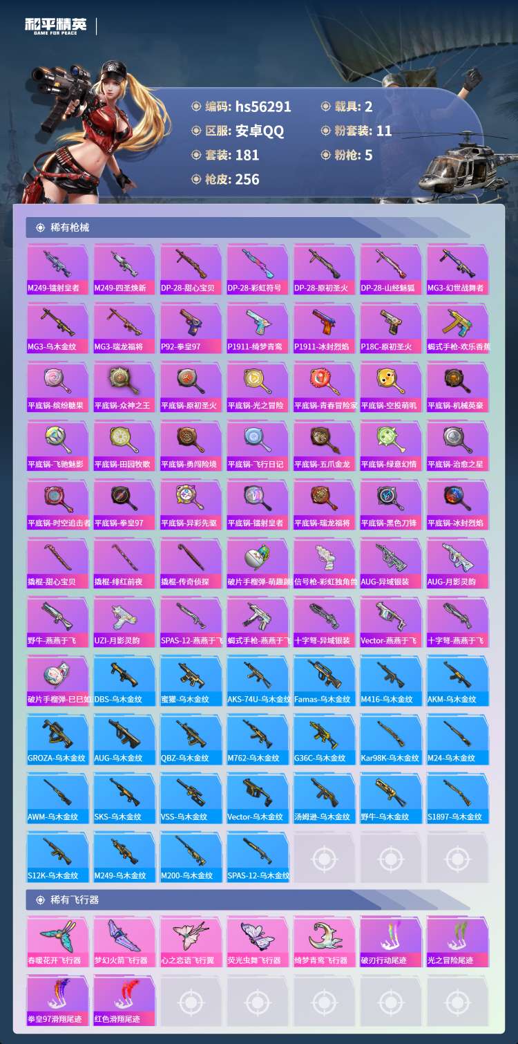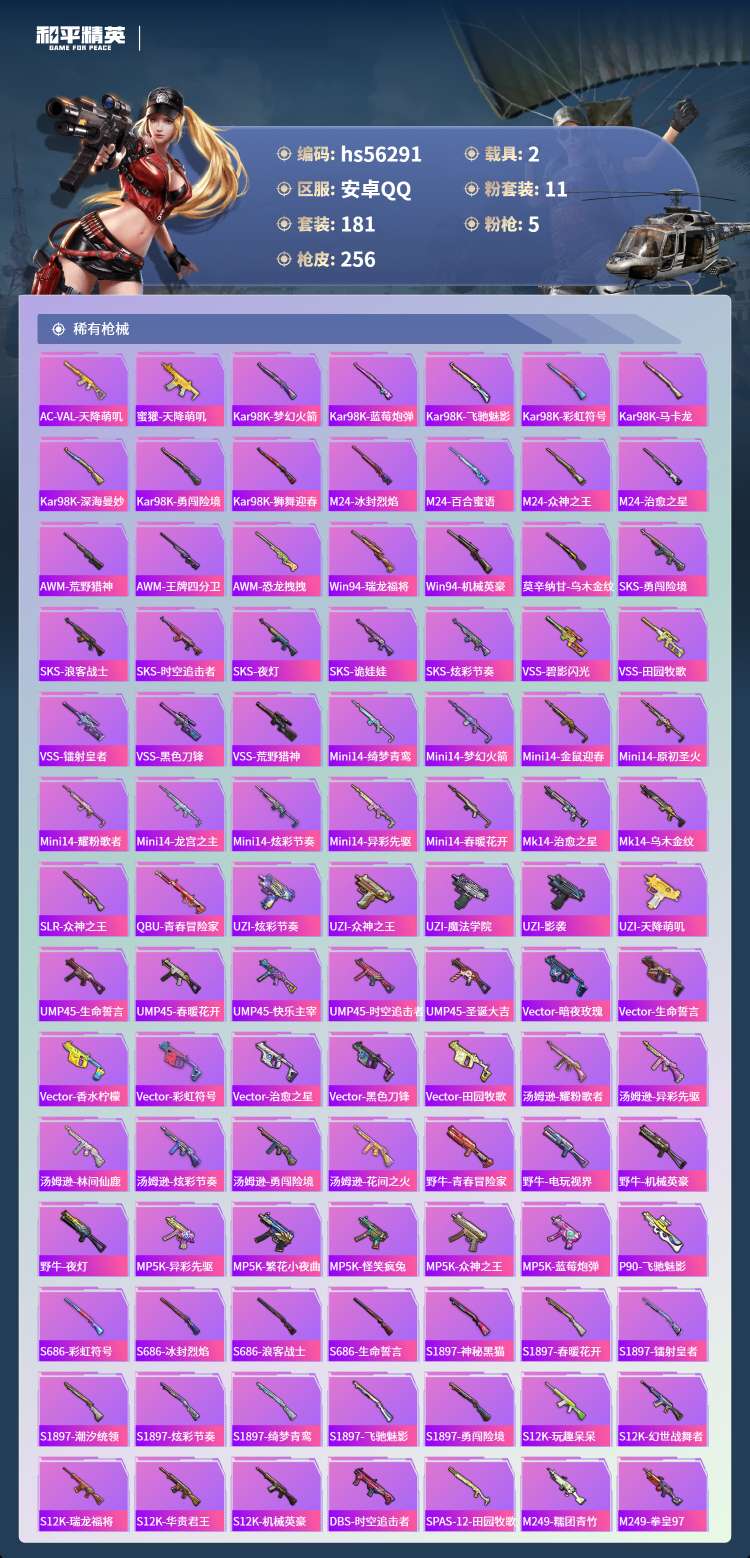 hs56291 安卓手Q-10王牌印记-11粉装-5特效枪-2载具-95032热力值-181套装-2