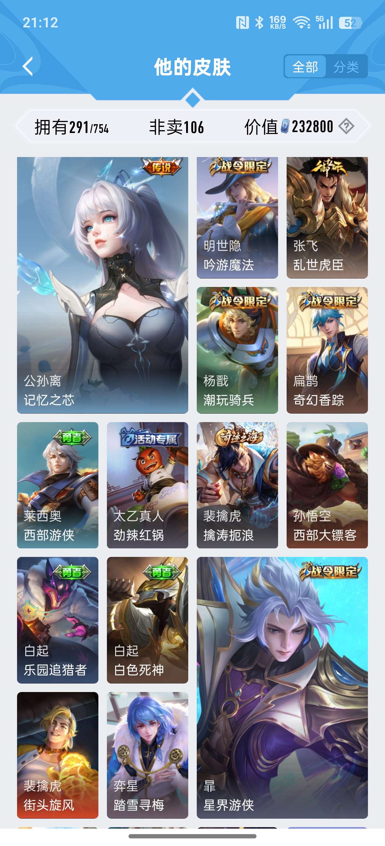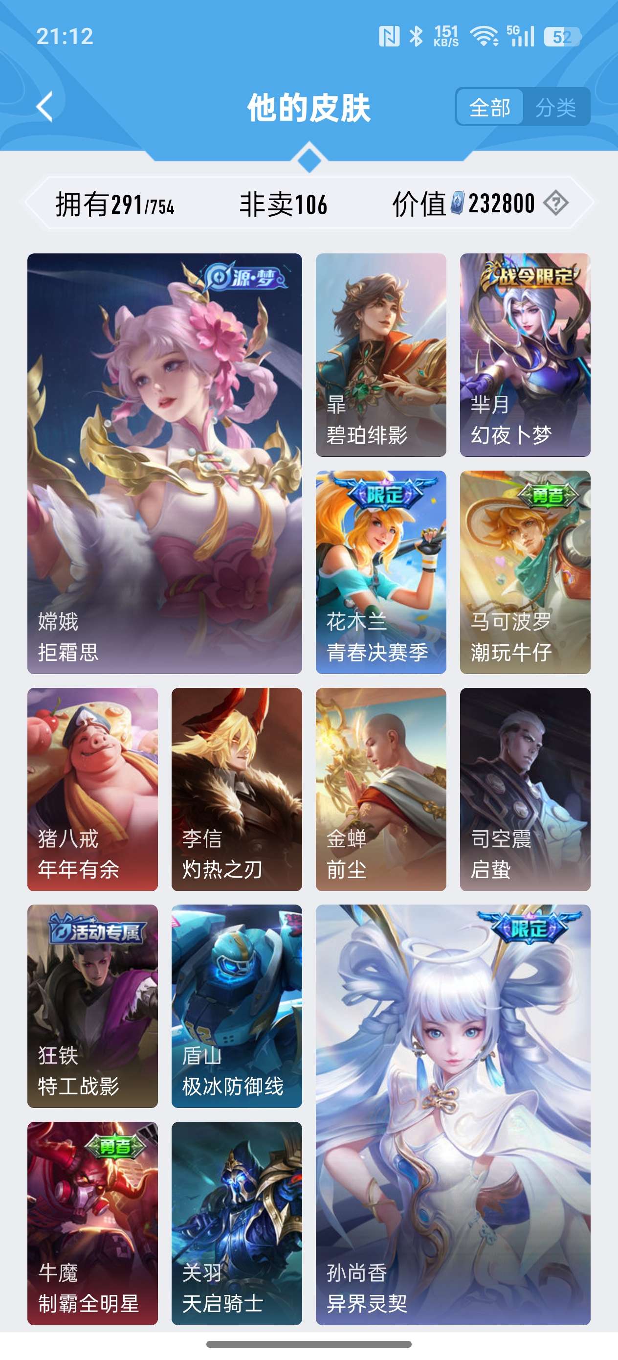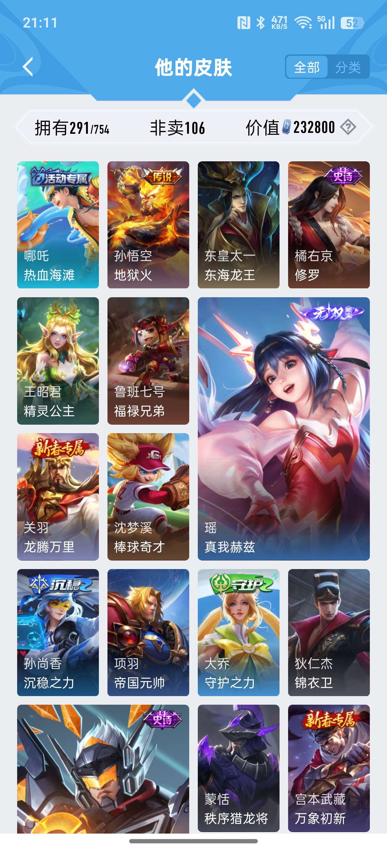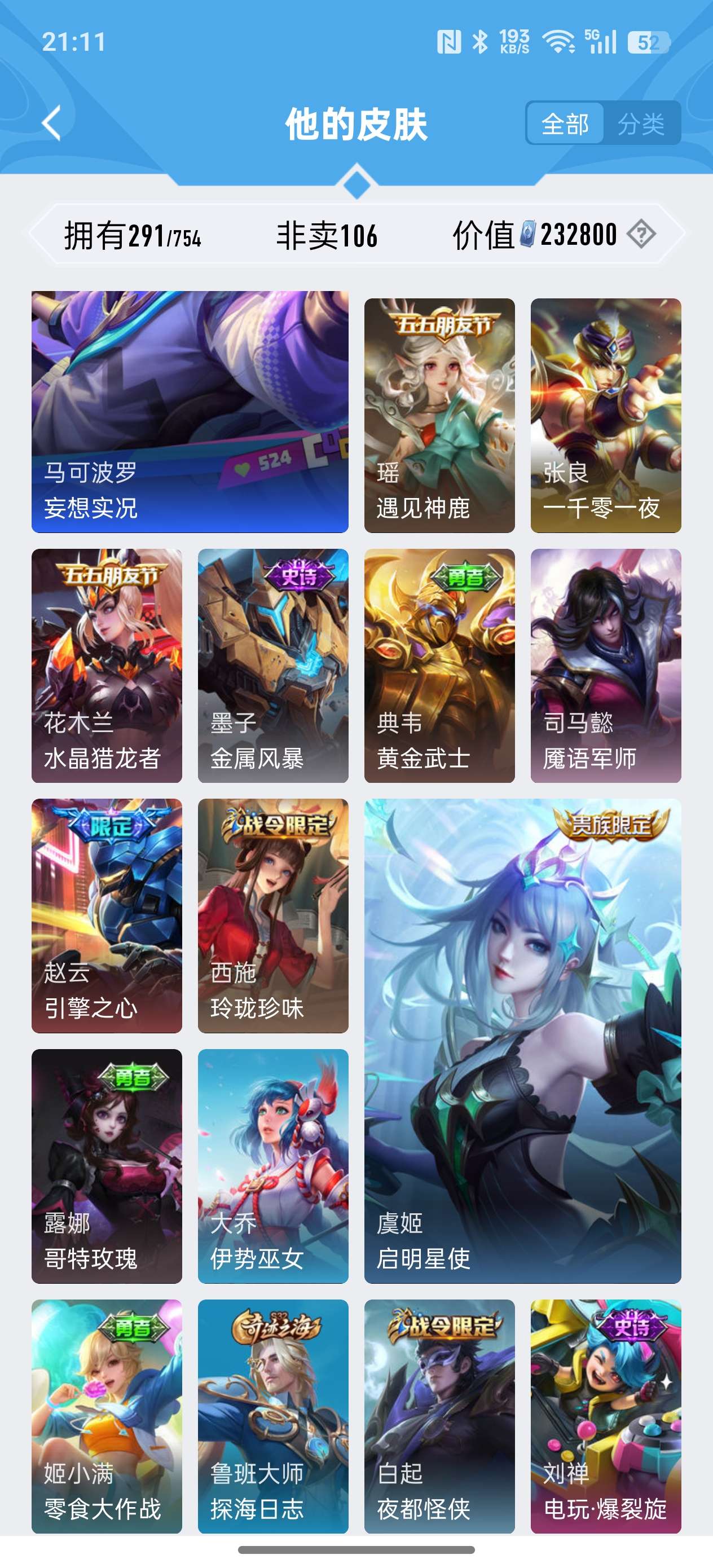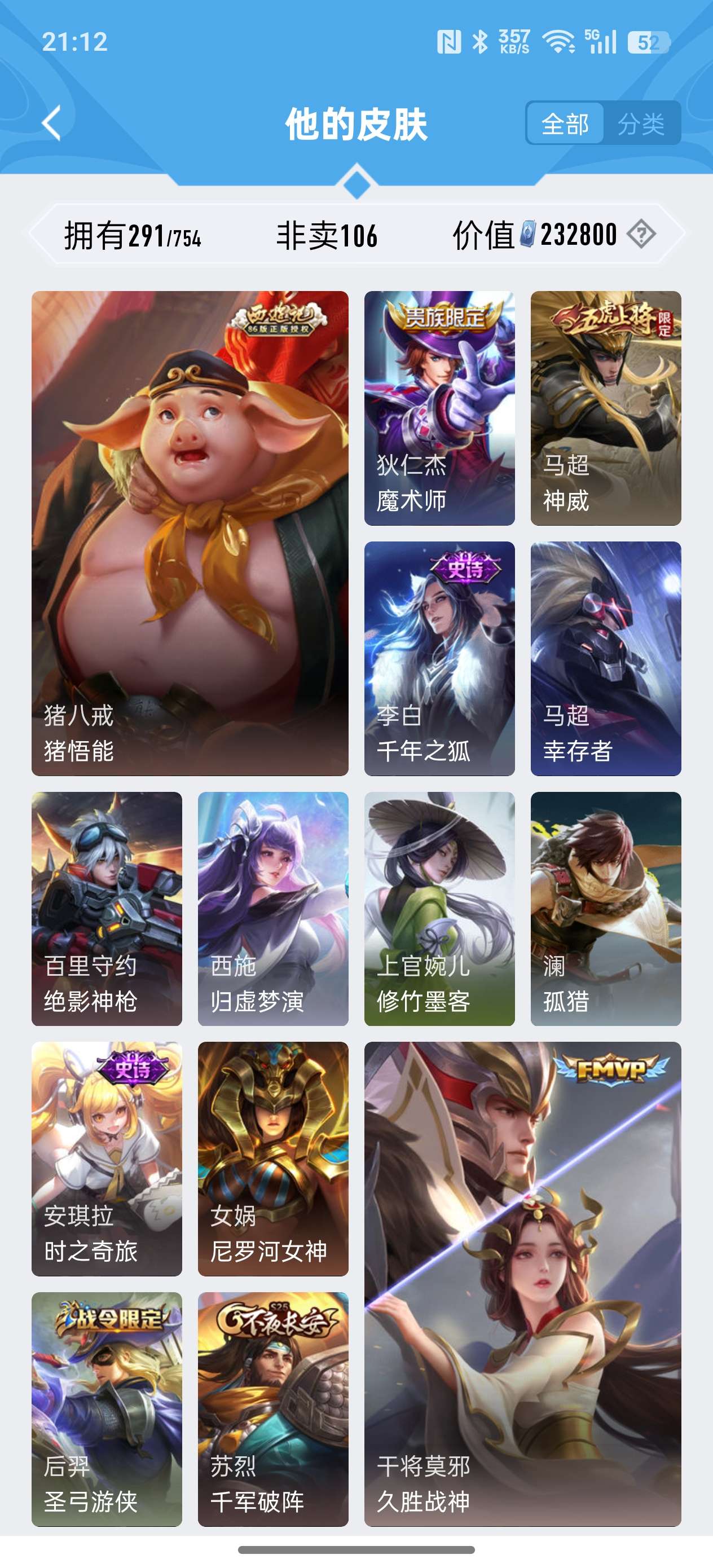 安卓QQ/非凡王者/291皮肤/127英雄/2典藏/0珍品无双/1无双/0珍品传说/18传说/79史