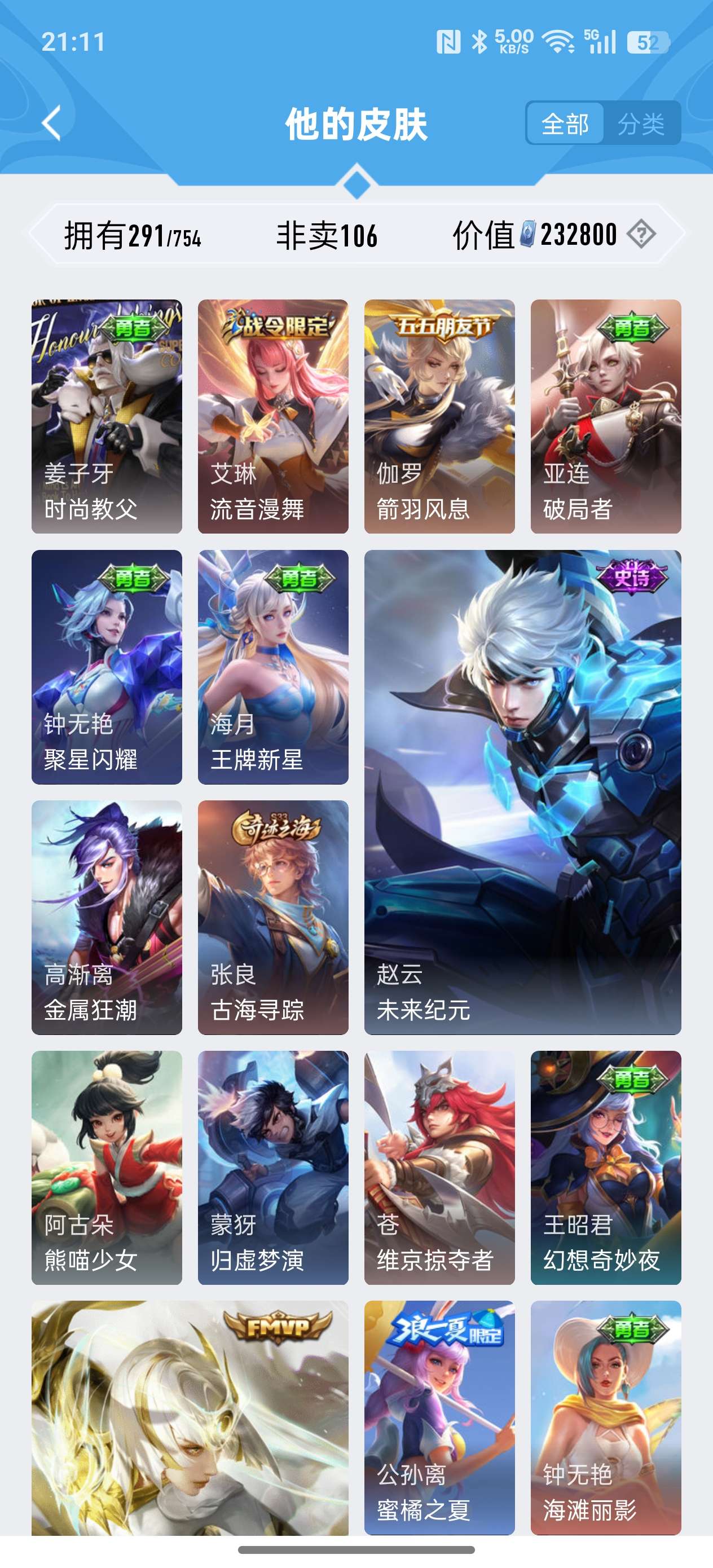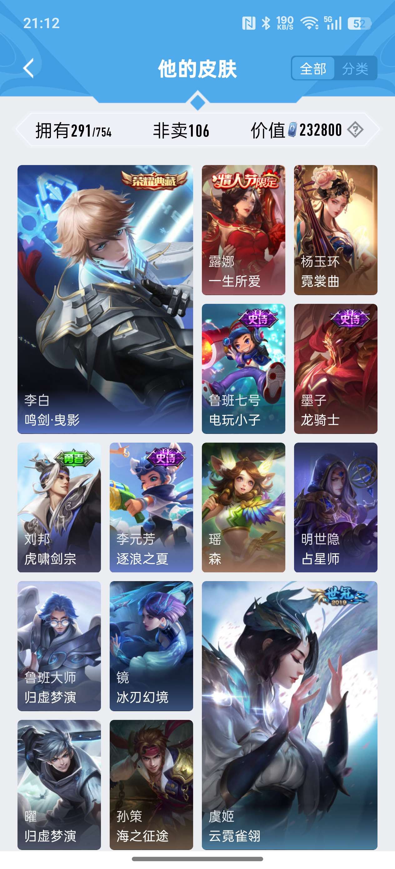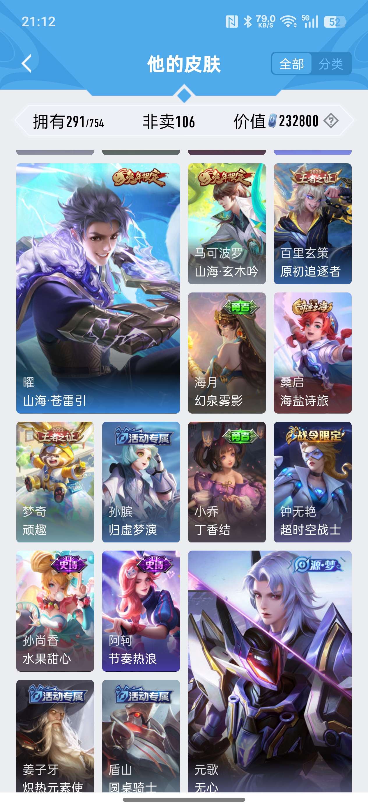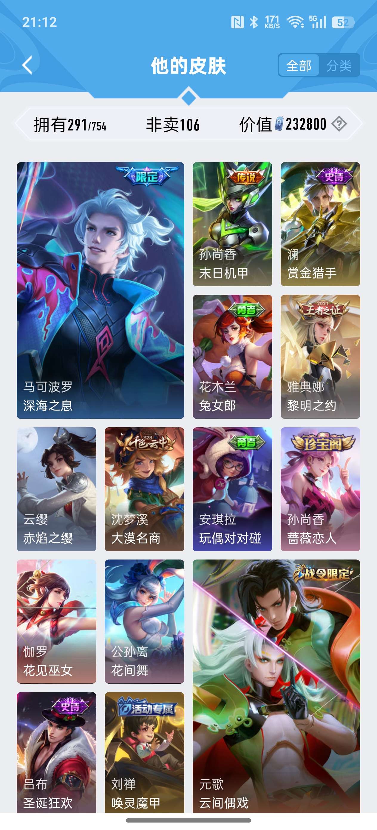 安卓QQ/非凡王者/291皮肤/127英雄/2典藏/0珍品无双/1无双/0珍品传说/18传说/79史