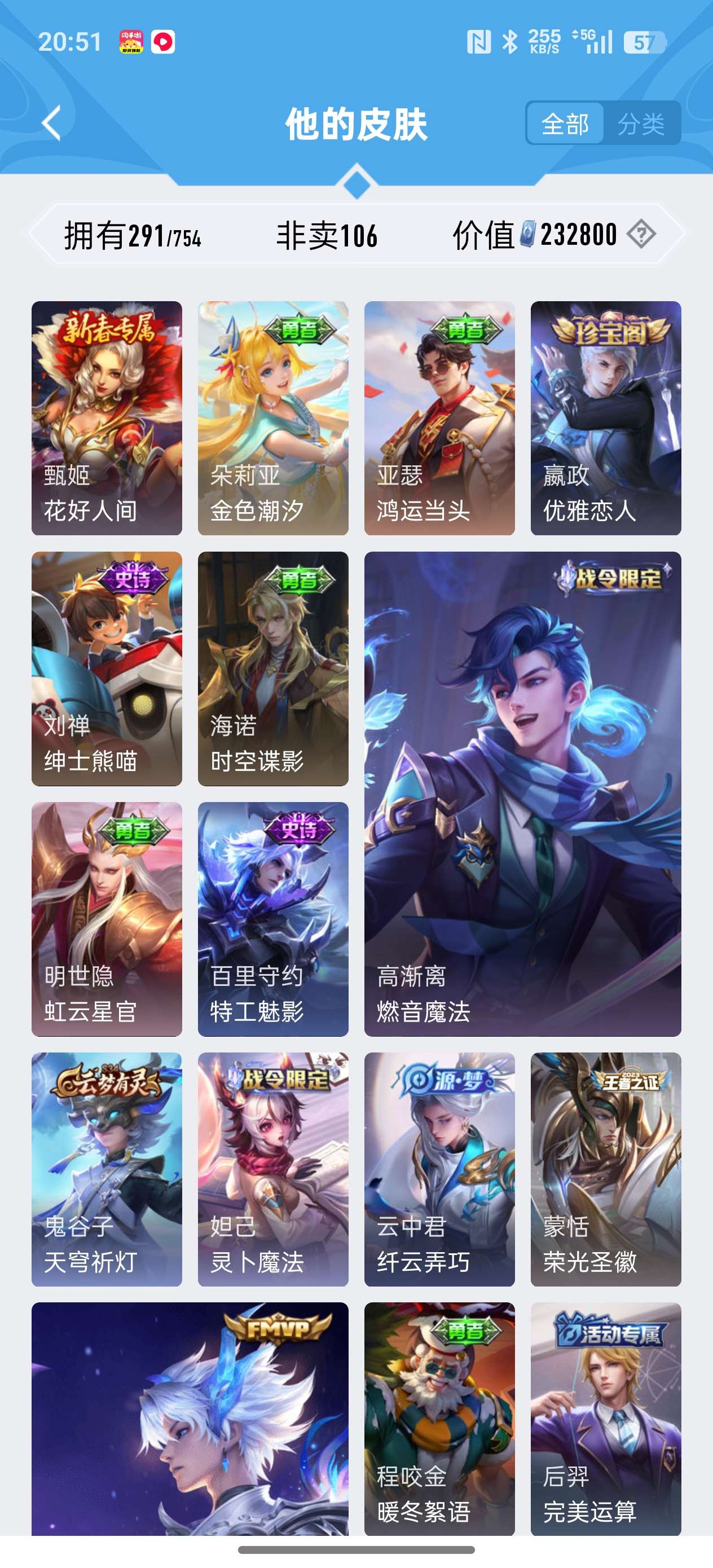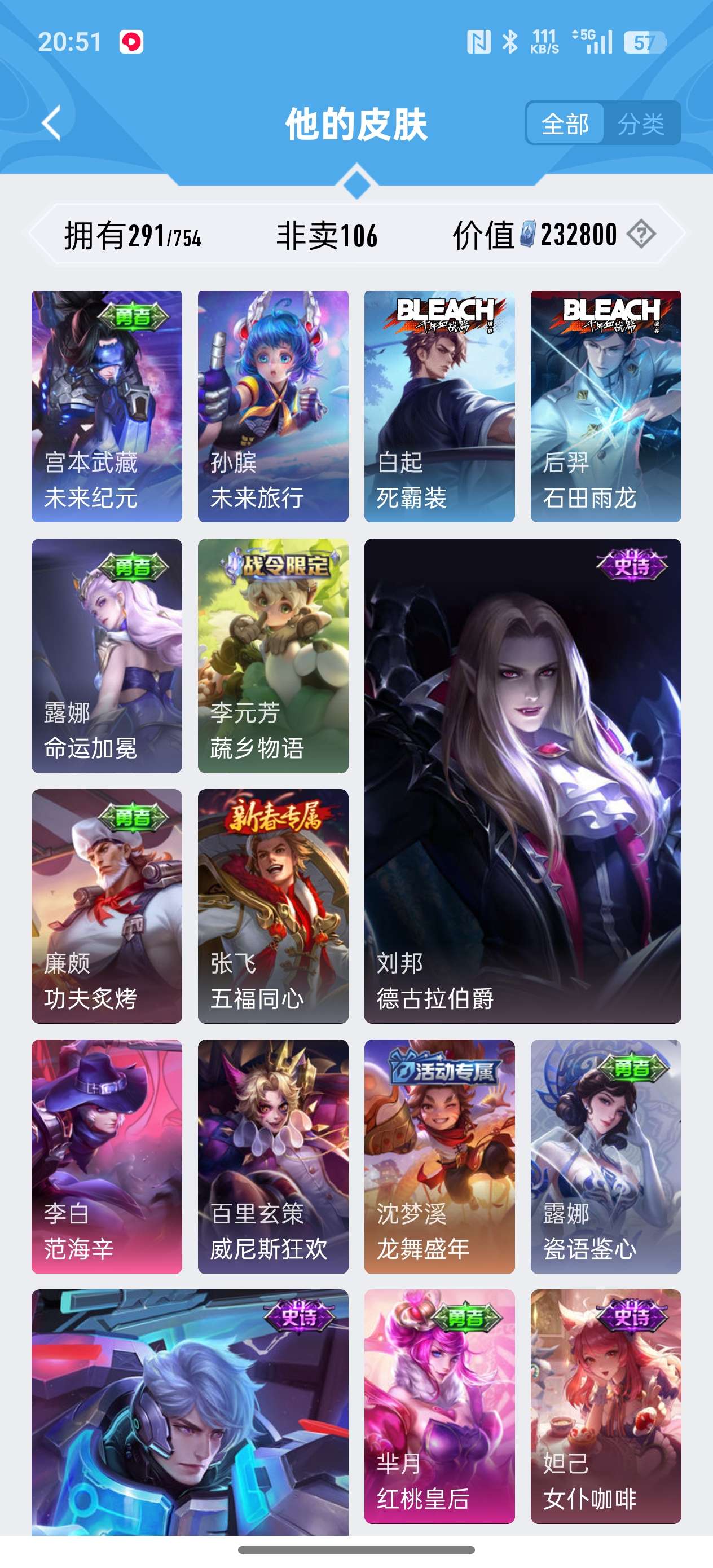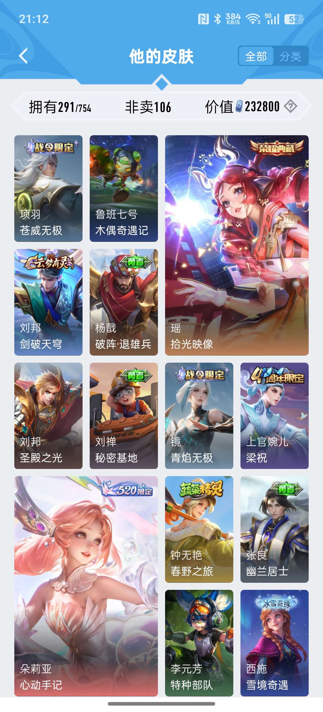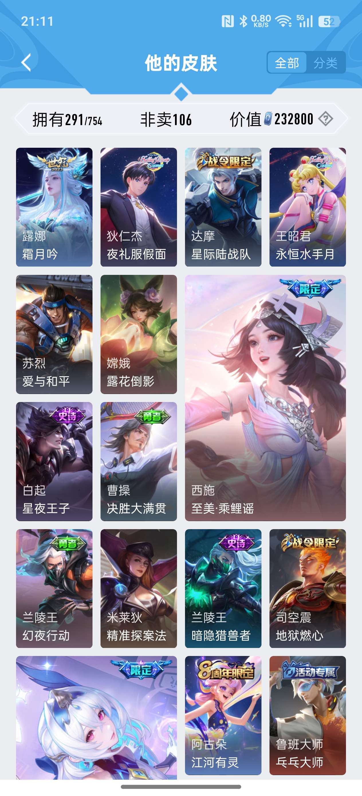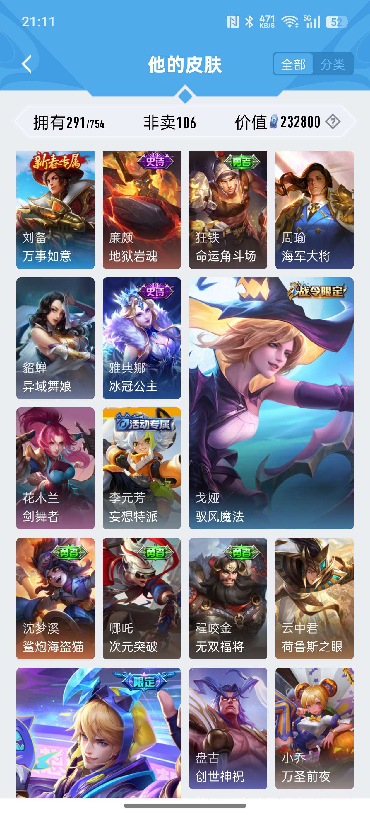 安卓QQ/非凡王者/291皮肤/127英雄/2典藏/0珍品无双/1无双/0珍品传说/18传说/79史