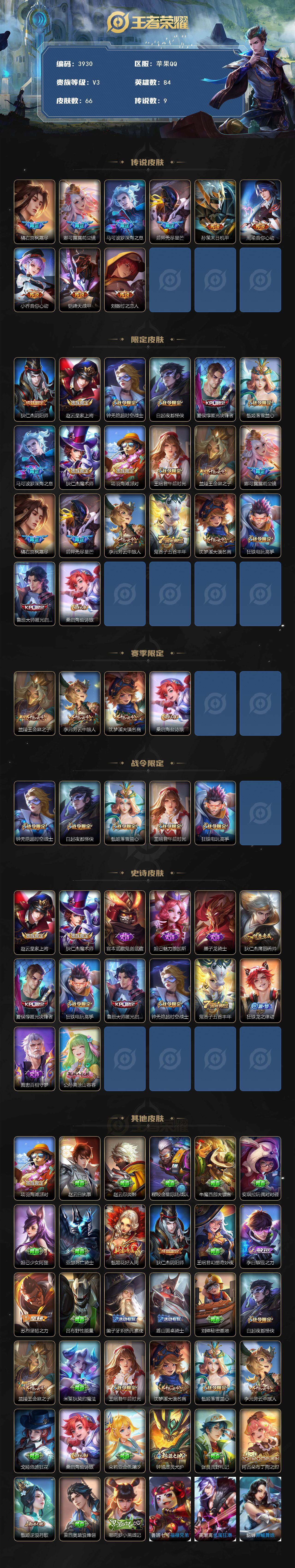 苹果Q-V3-永恒钻石III段位-84英雄-66皮肤-9传说-14史诗【传说