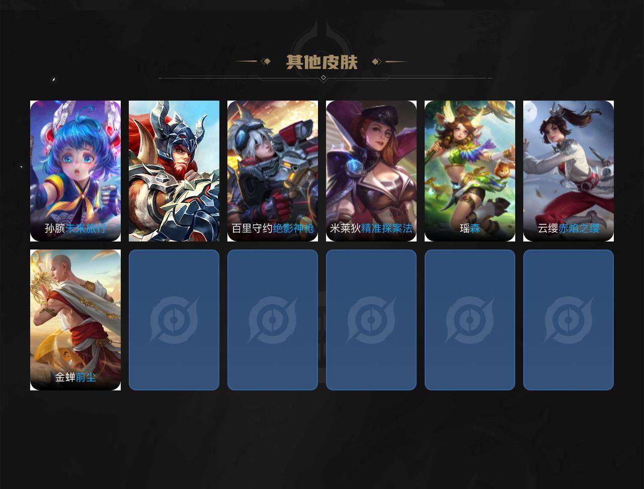 【限定皮肤】:狄仁杰阴阳师,赵云皇家上将,钟无艳超时空战士,白起夜都怪侠,夏侯惇匿光决锋者,甄姬落雪兰心,马可波罗深海之息,狄仁杰魔术师,项羽海滩派对