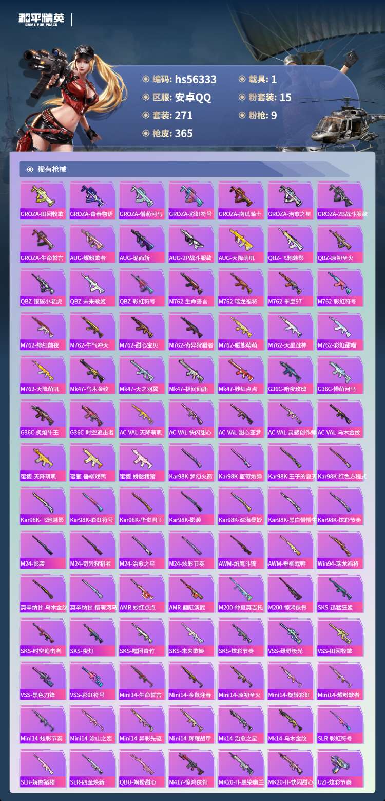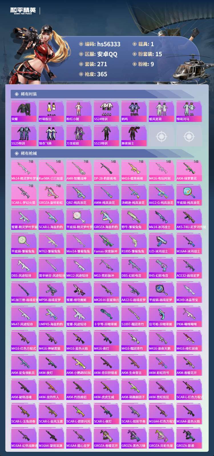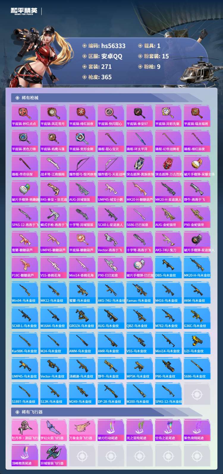 hs56333 安卓手Q-17王牌印记-15粉装-9特效枪-1载具-121161热力值-271套装-