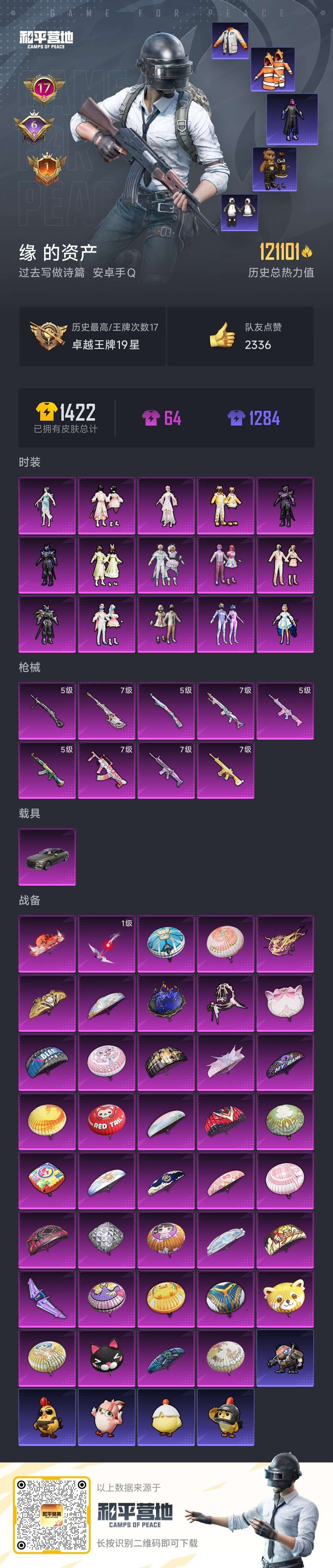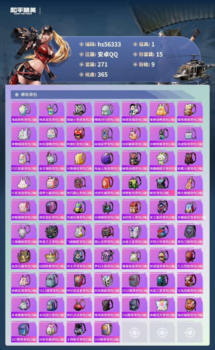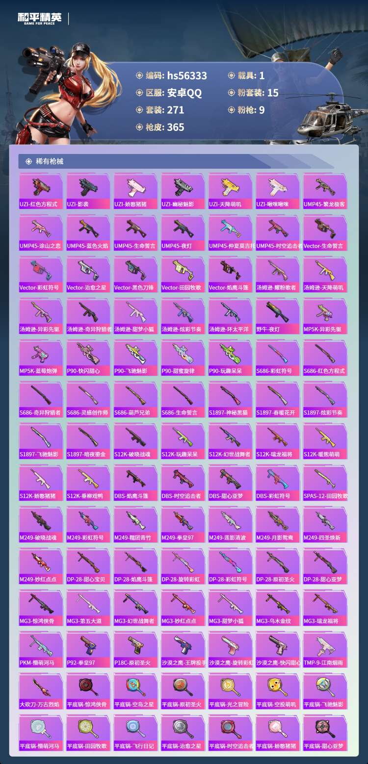 hs56333 安卓手Q-17王牌印记-15粉装-9特效枪-1载具-121161热力值-271套装-