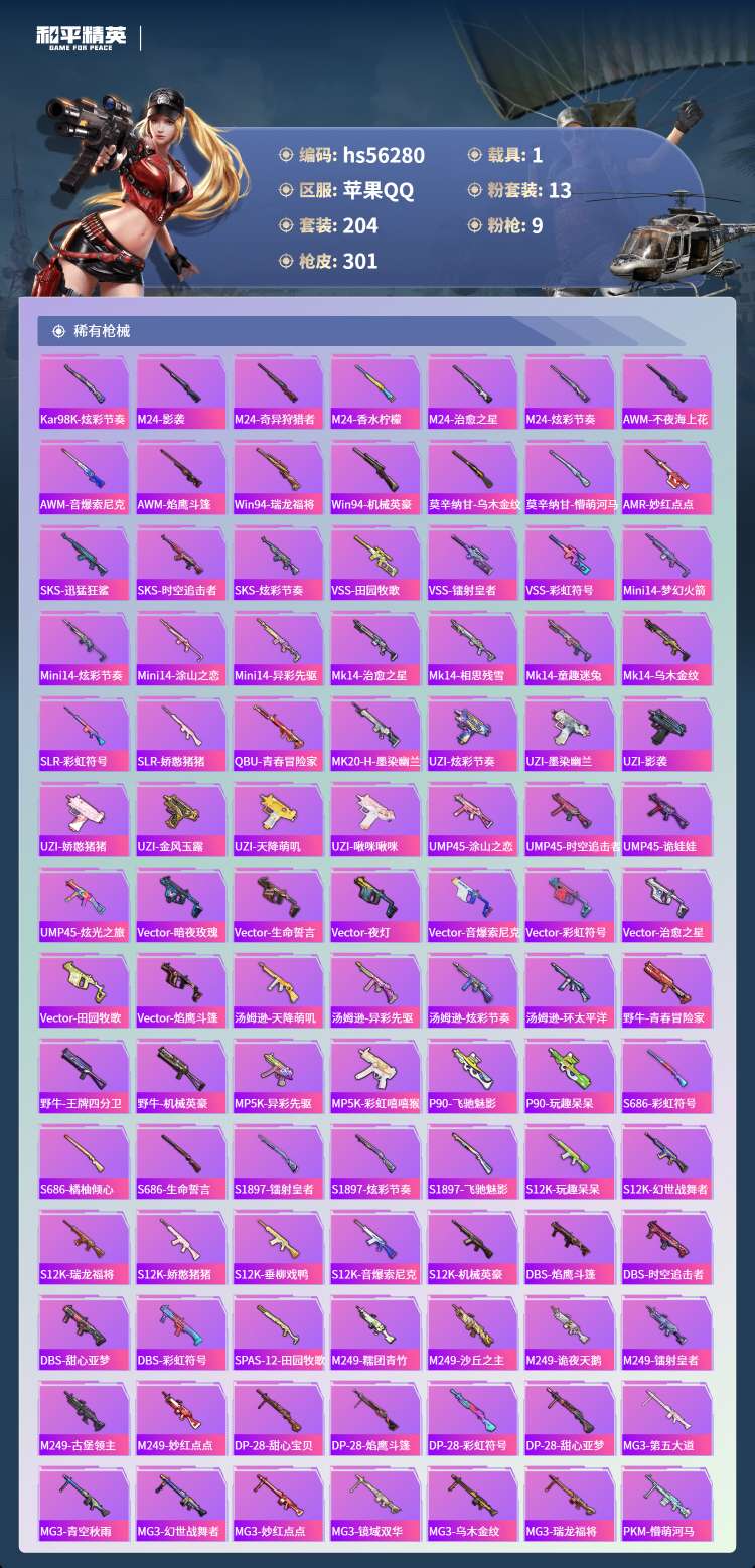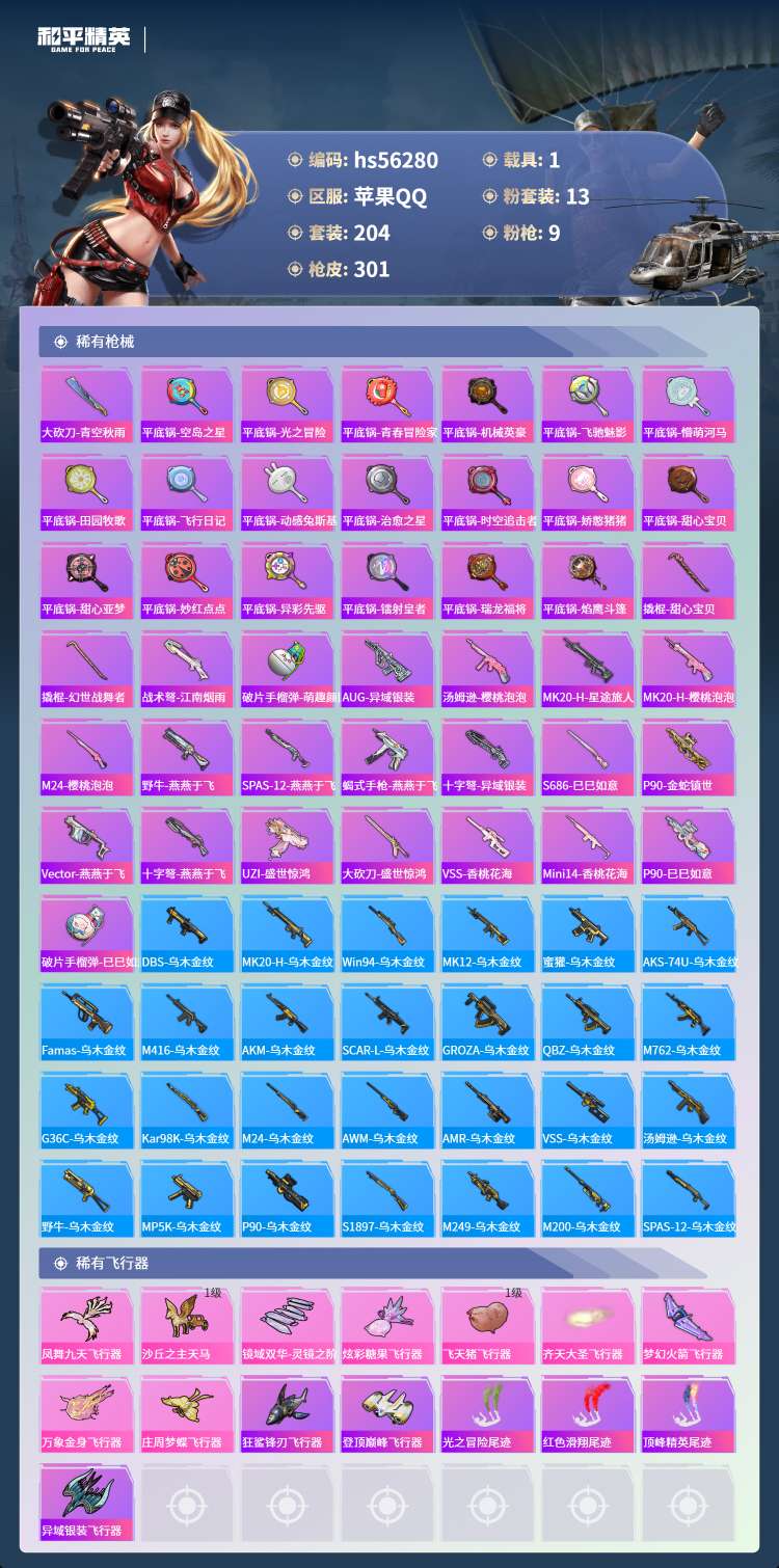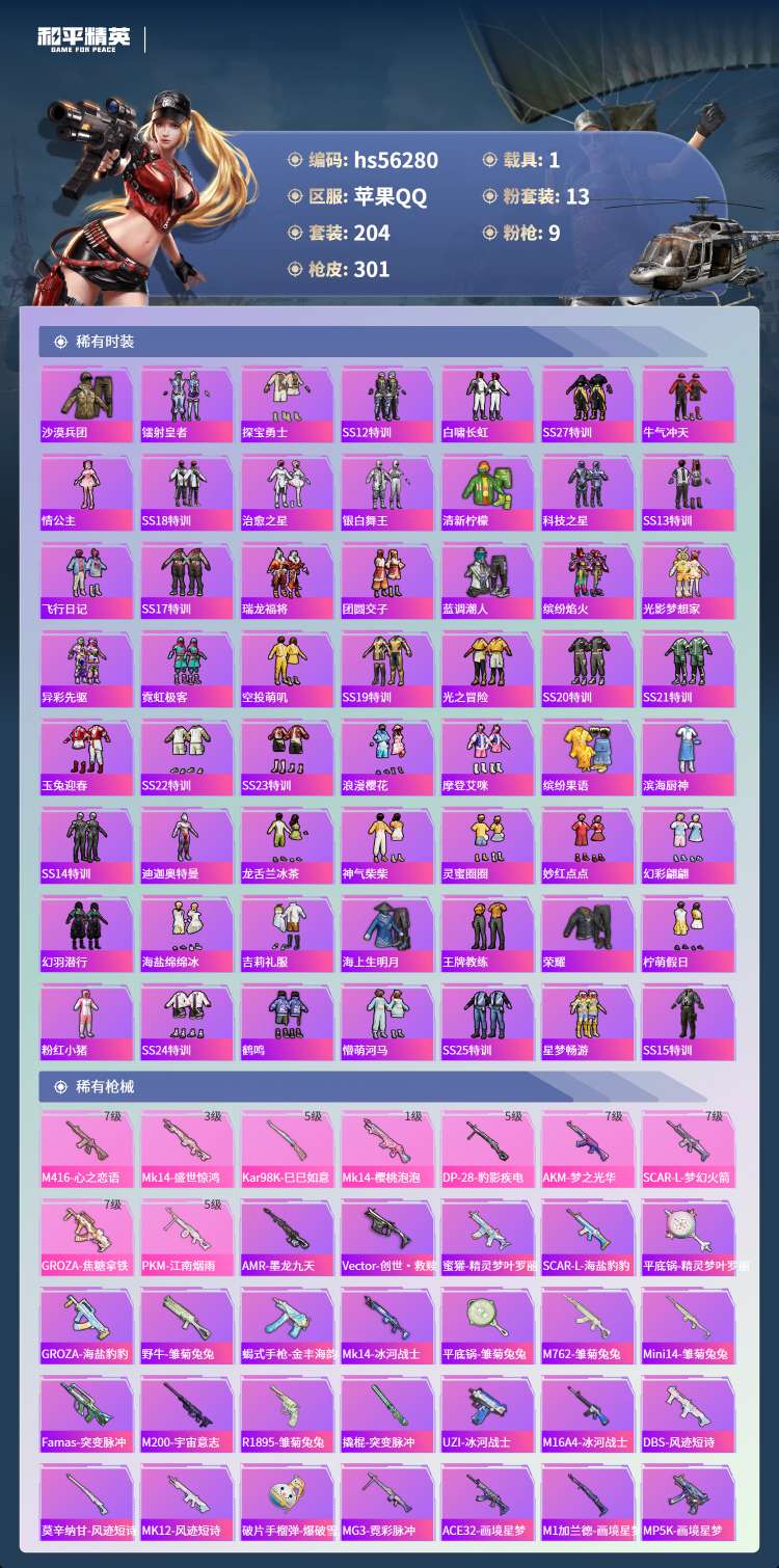hs56280 苹果手Q-18王牌印记-2红装-13粉装-9特效枪-1载具-104609热力值-20