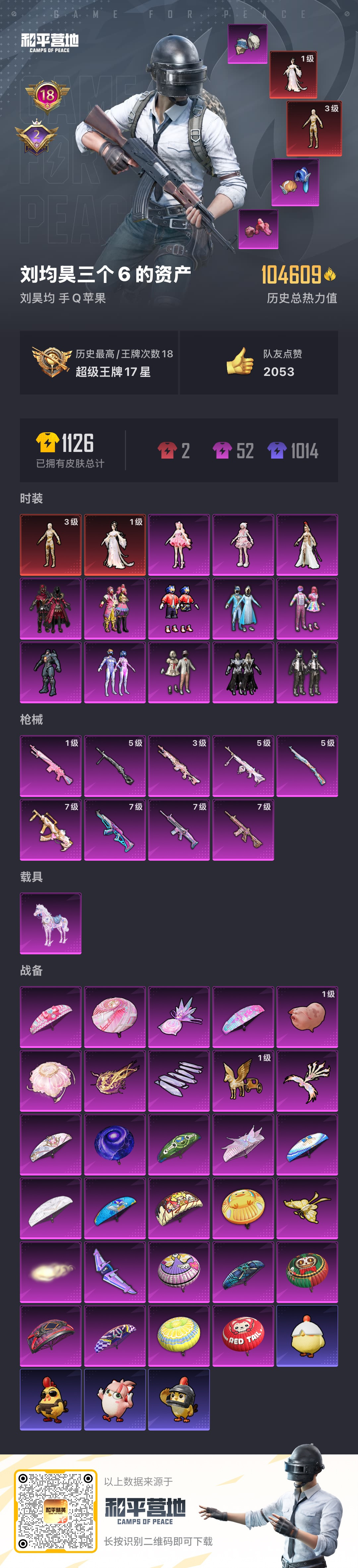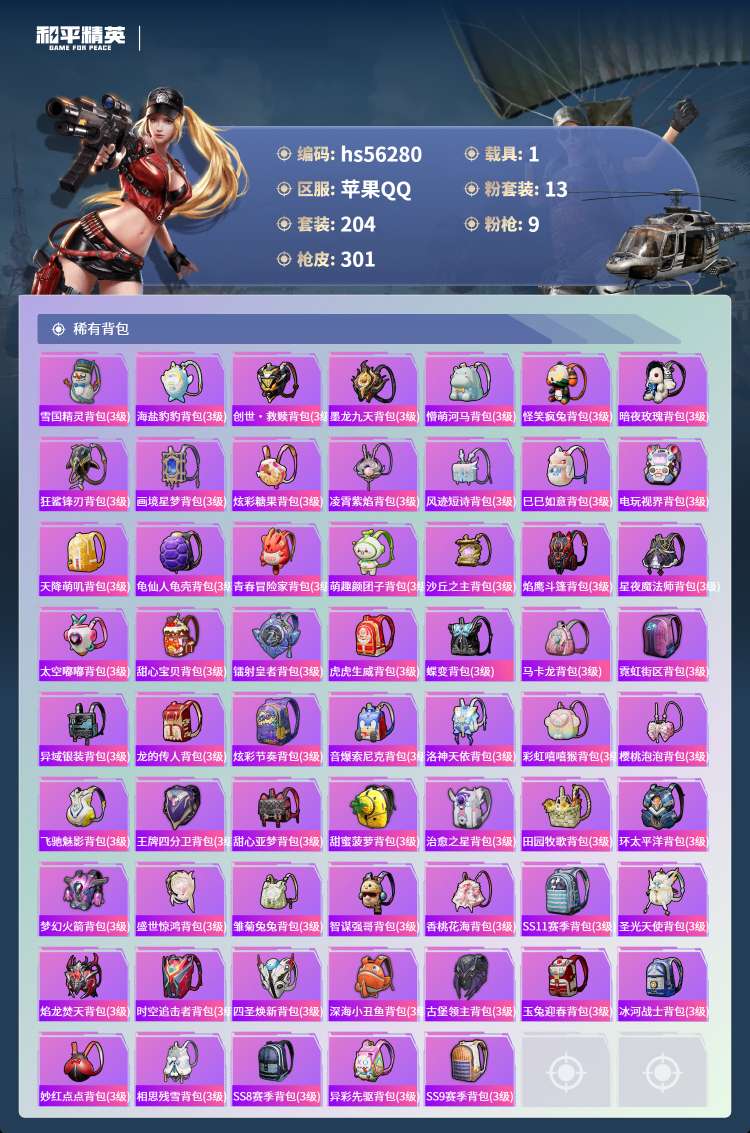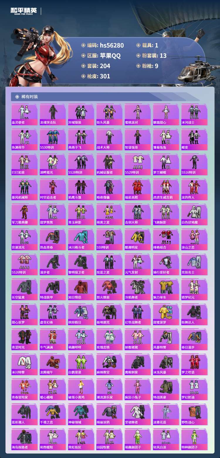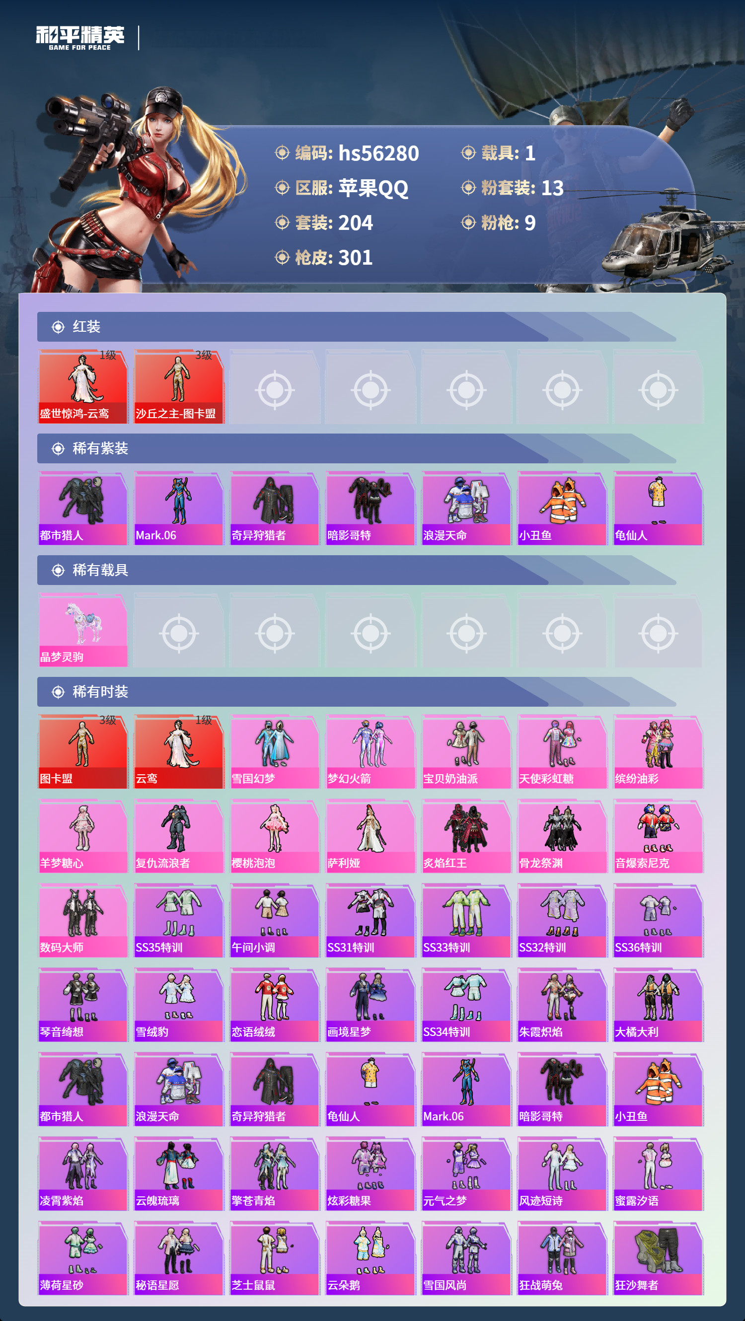 hs56280 苹果手Q-18王牌印记-2红装-13粉装-9特效枪-1载具-104609热力值-20