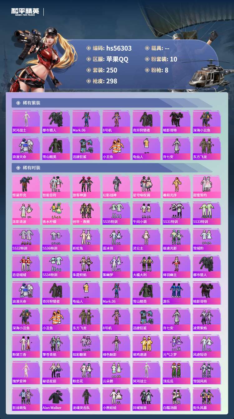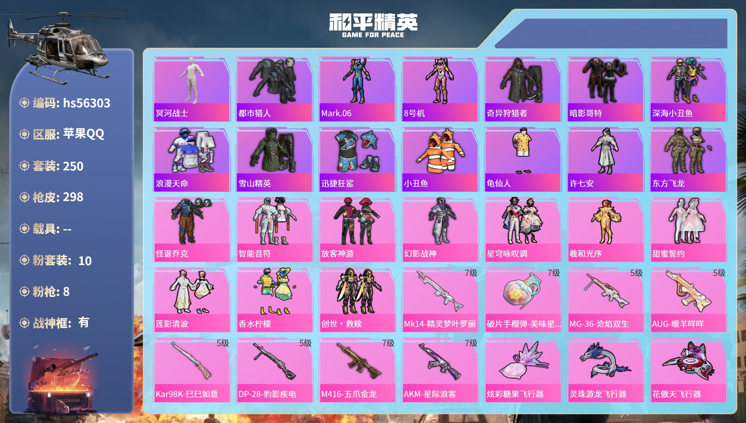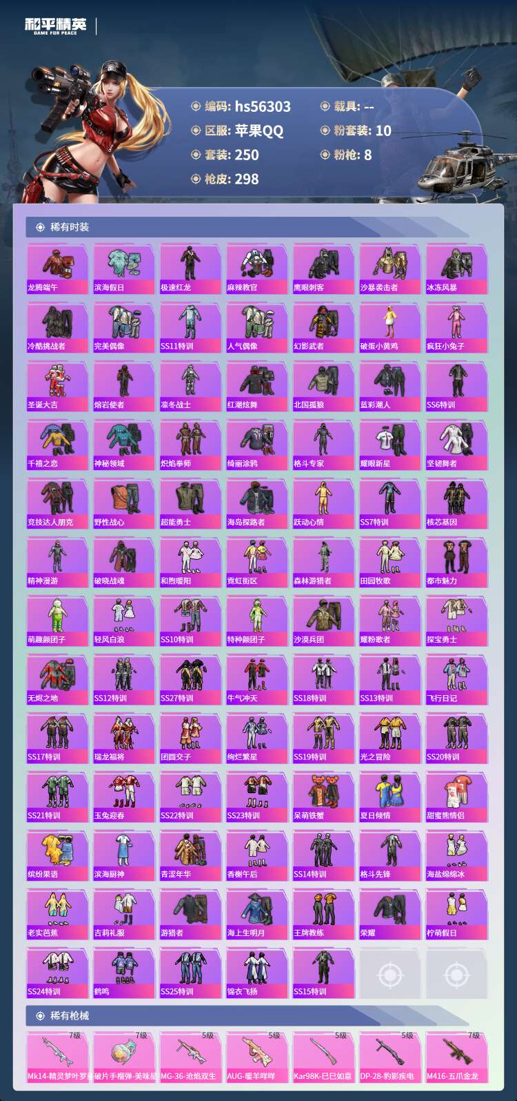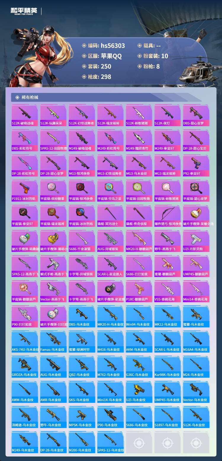 hs56303 苹果手Q-17王牌印记-有战神框-10粉装-8特效枪-93474热力值-250套装-