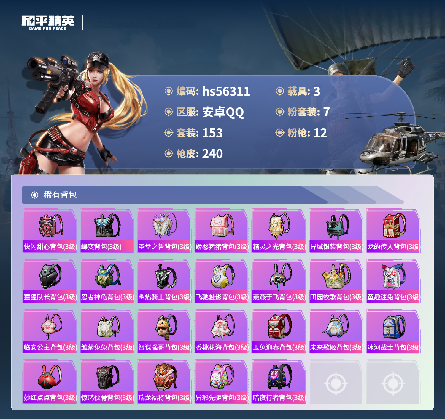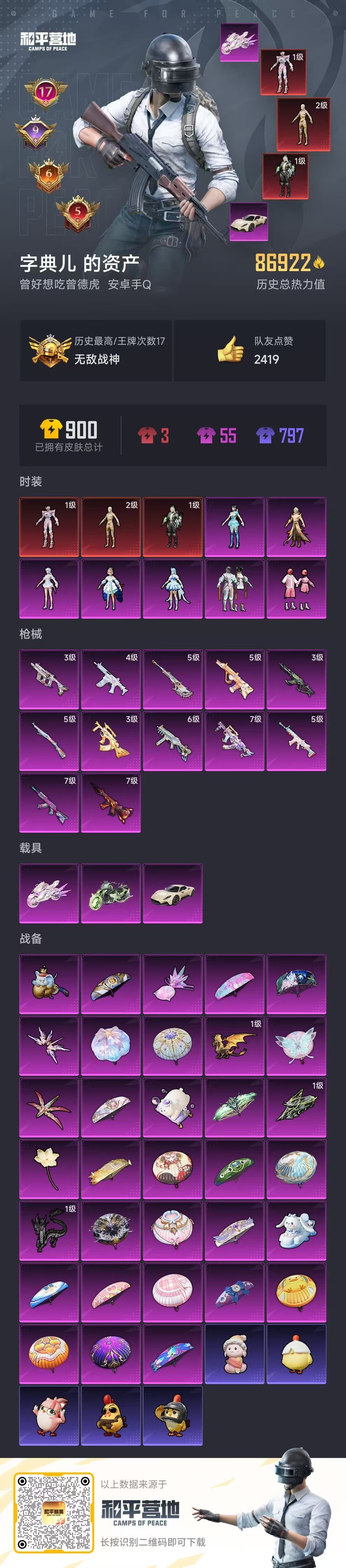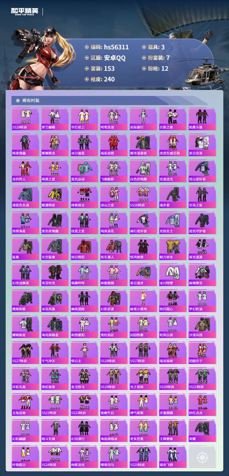 hs56311 安卓手Q-17王牌印记-有战神框-3红装-7粉装-12特效枪-3载具-87012热力