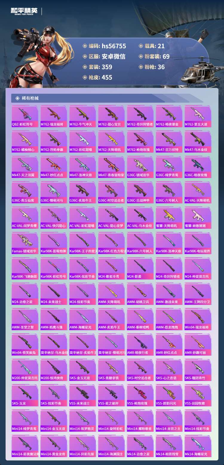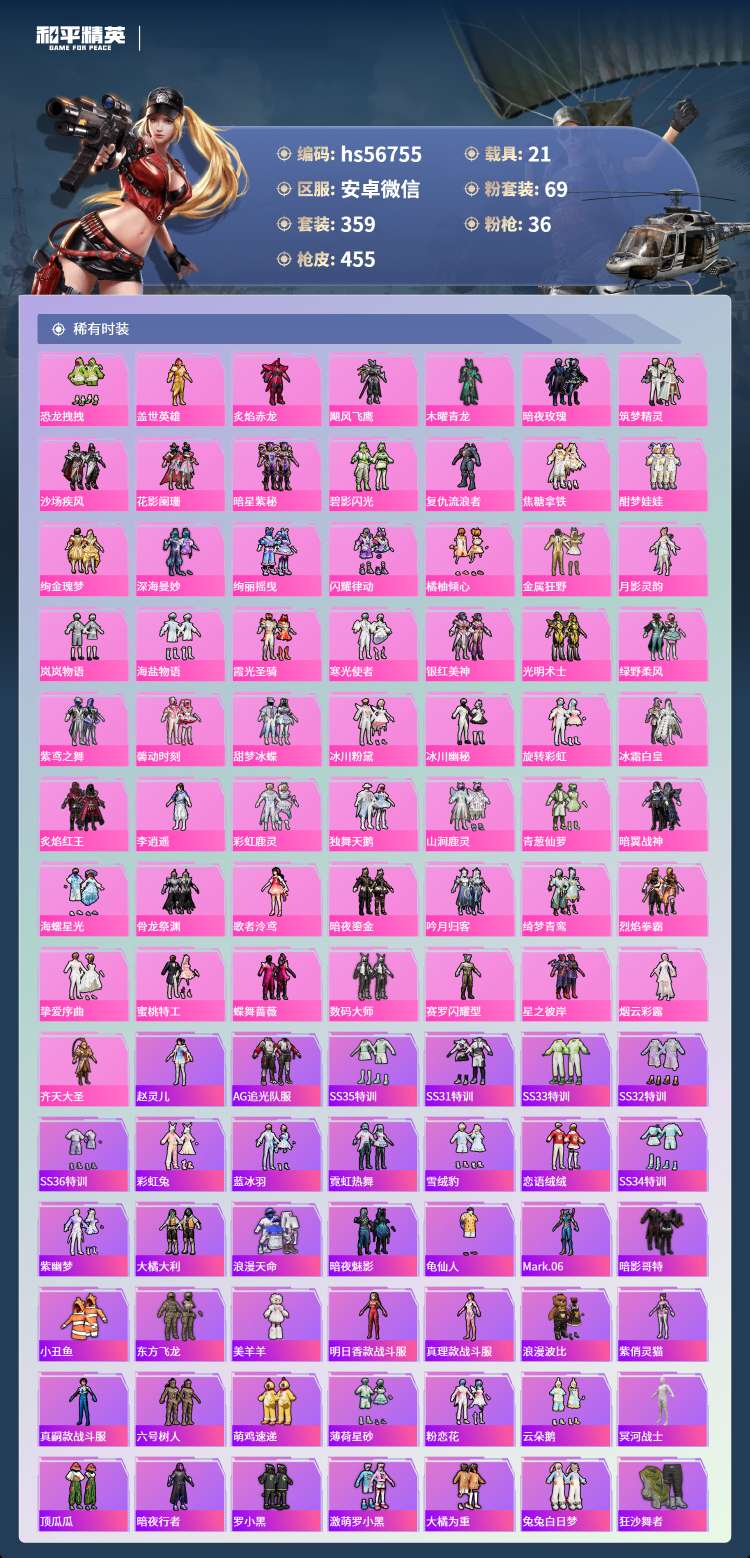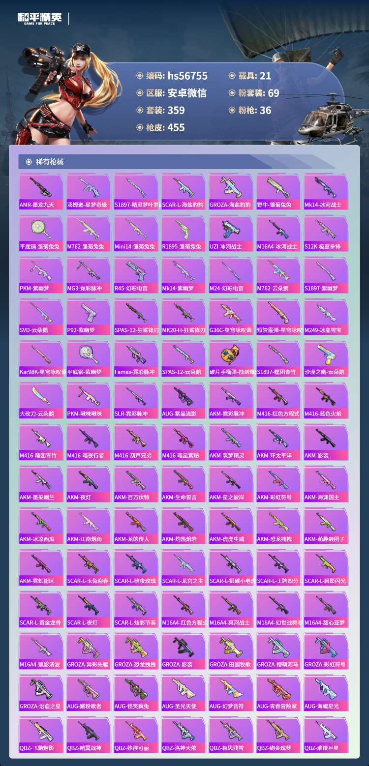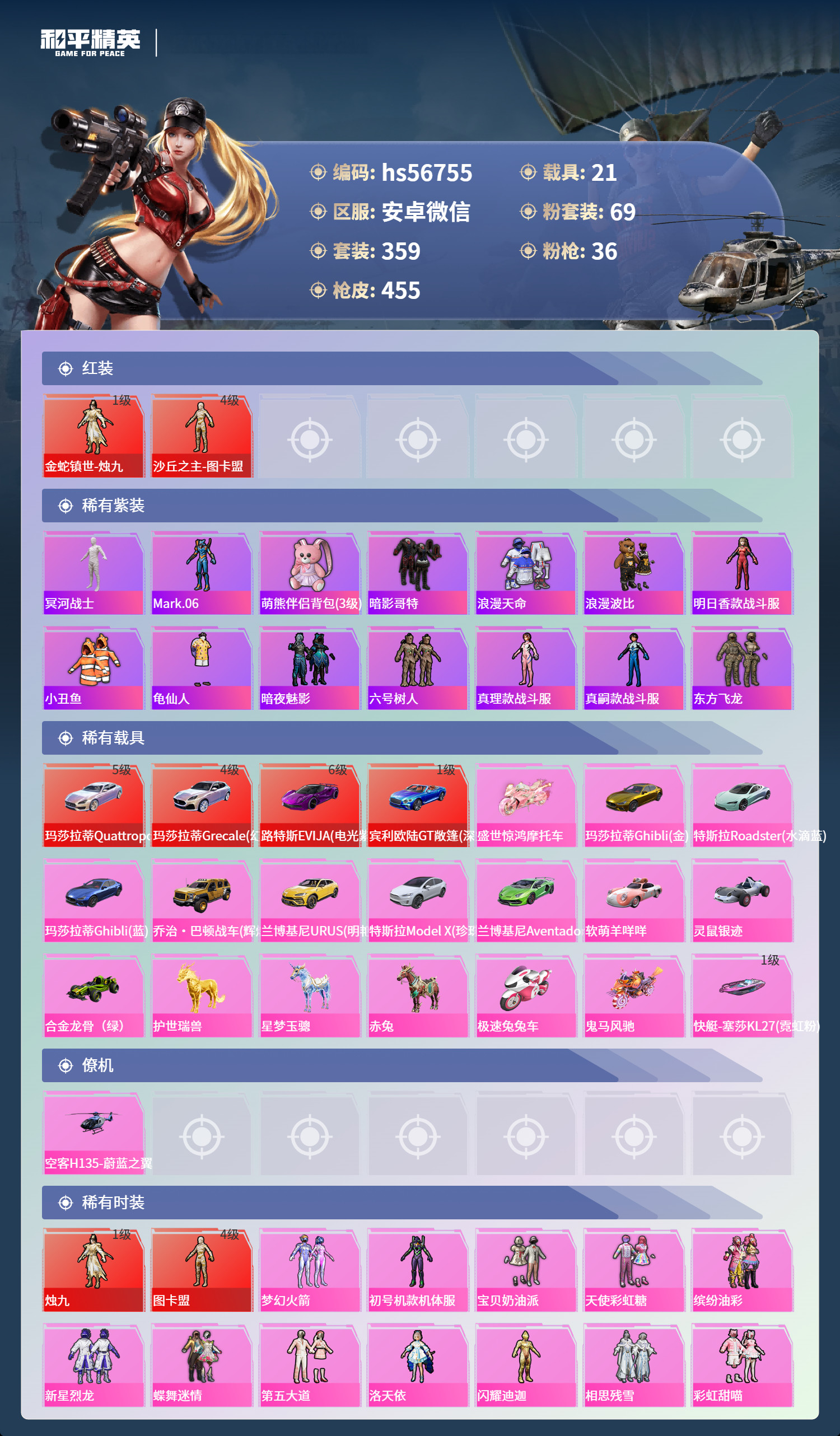 hs56755 安卓v-21王牌印记-2红装-69粉装-36特效枪-21载具-231992热力值-