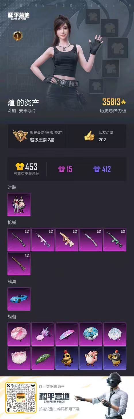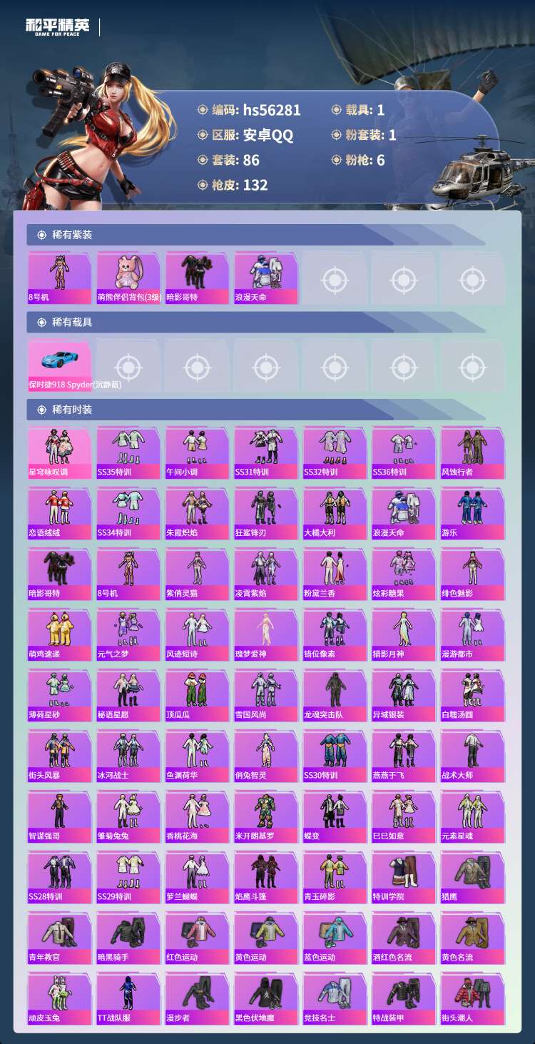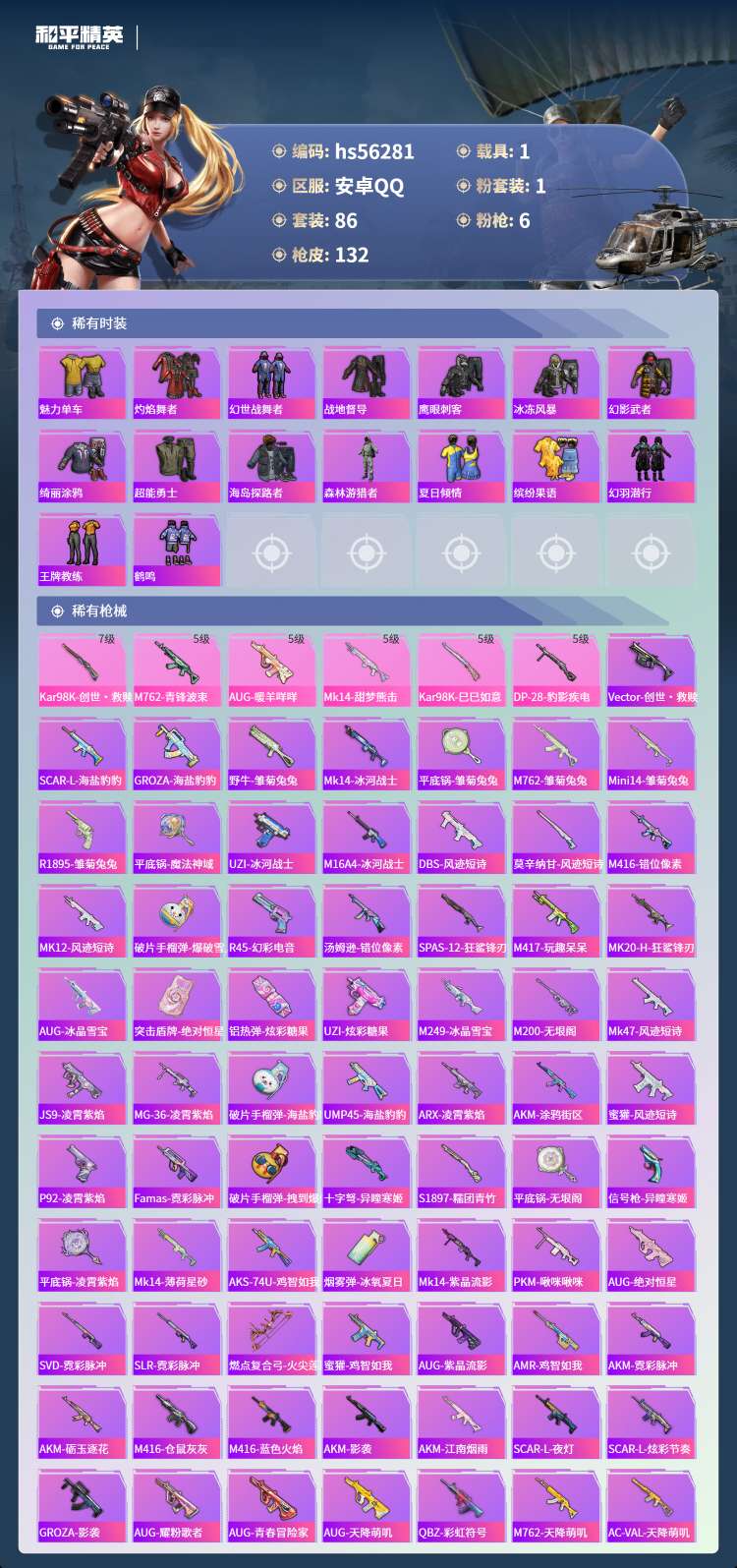 hs56281安卓手Q-1王牌印记-1粉装-6特效枪-1载具-35813热力值-86套装-132枪皮