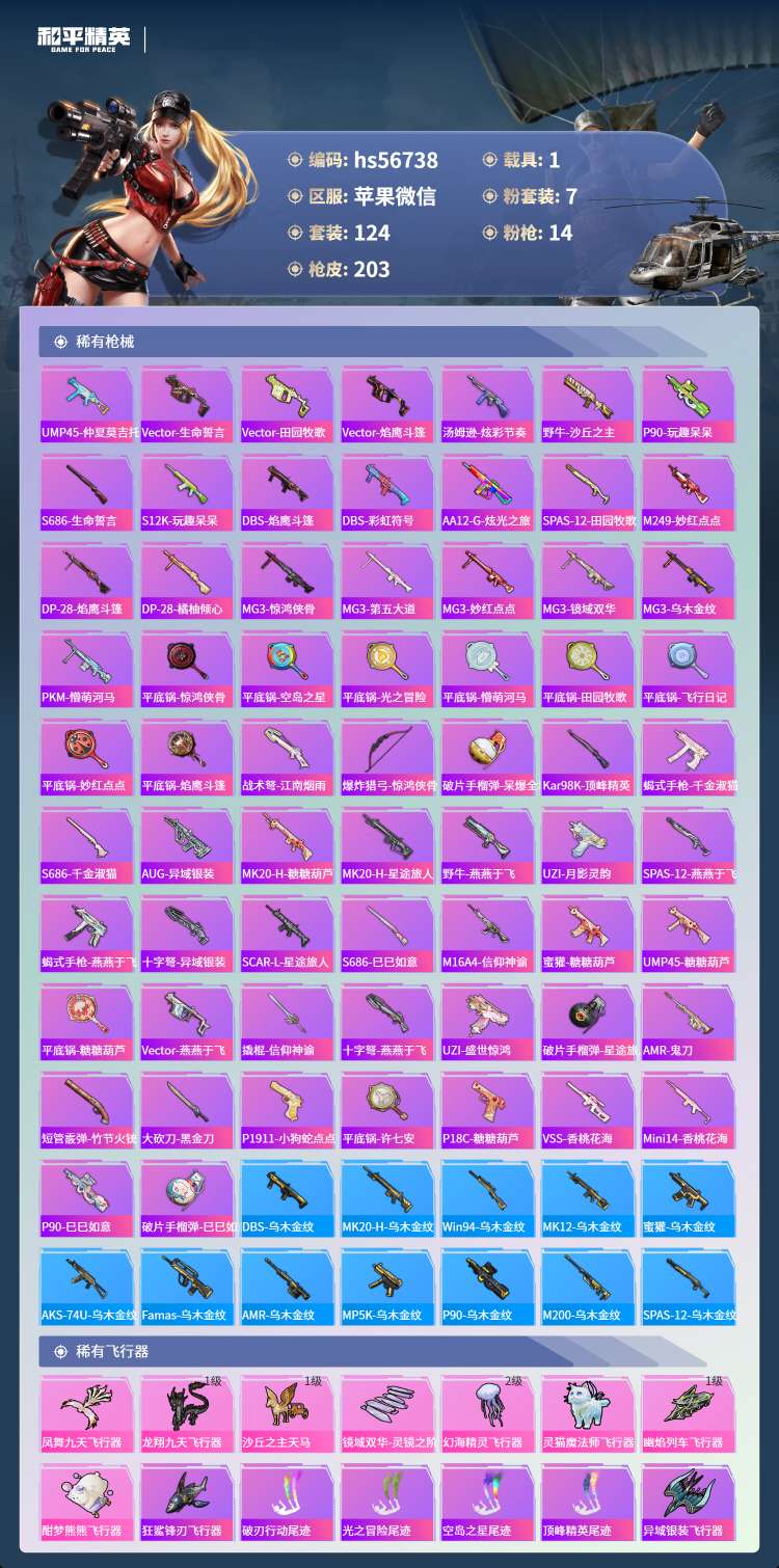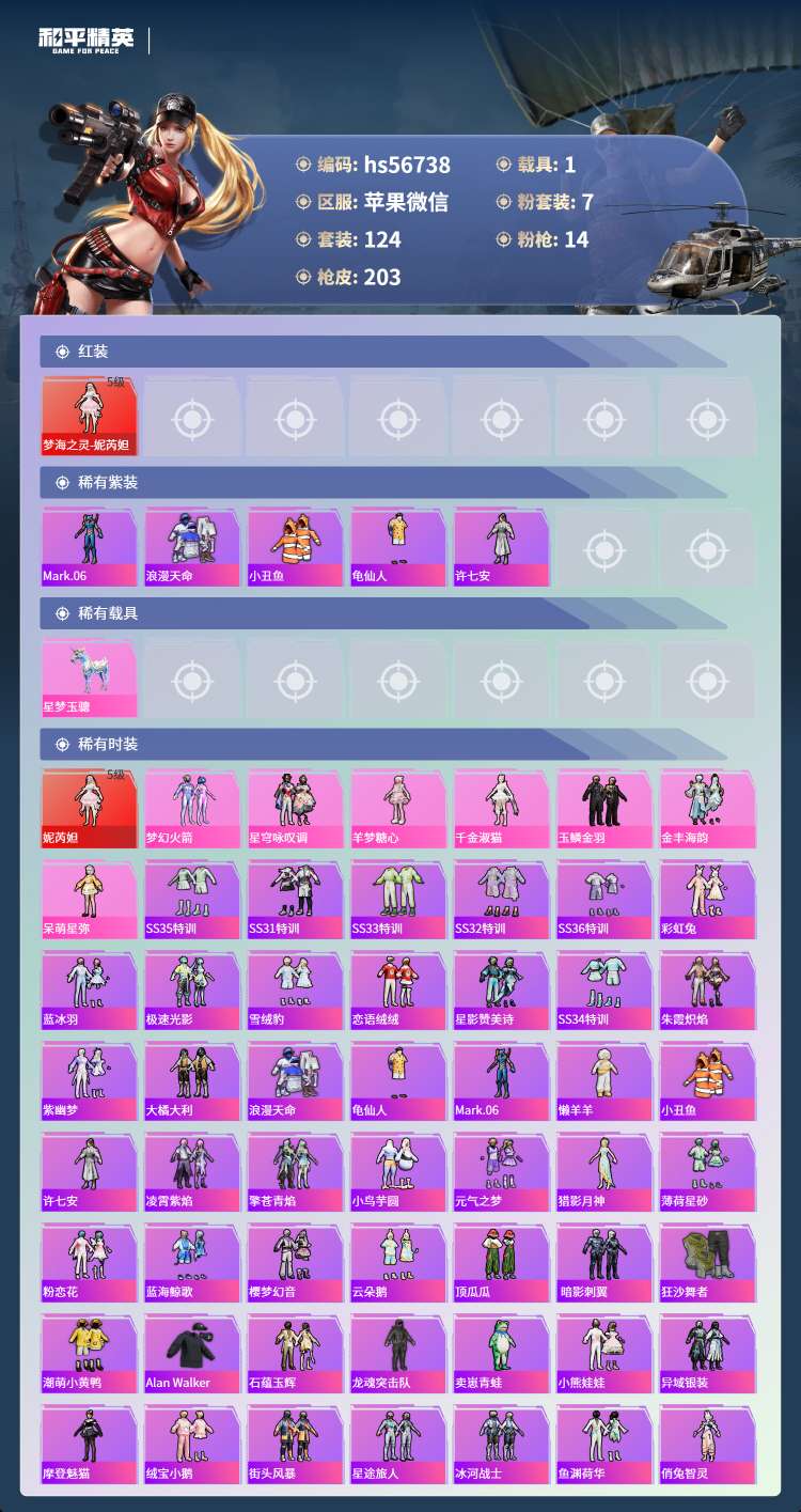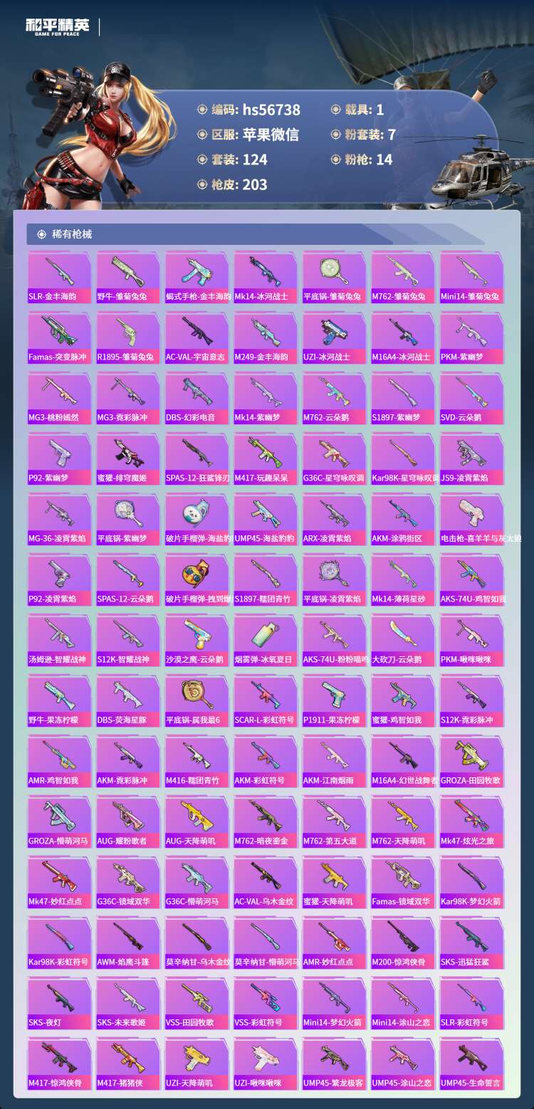 hs56738 苹果微-15王牌印记-1红装-7粉装-14特效枪-1载具-73013热力值-124