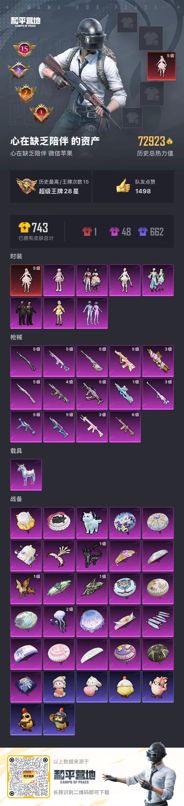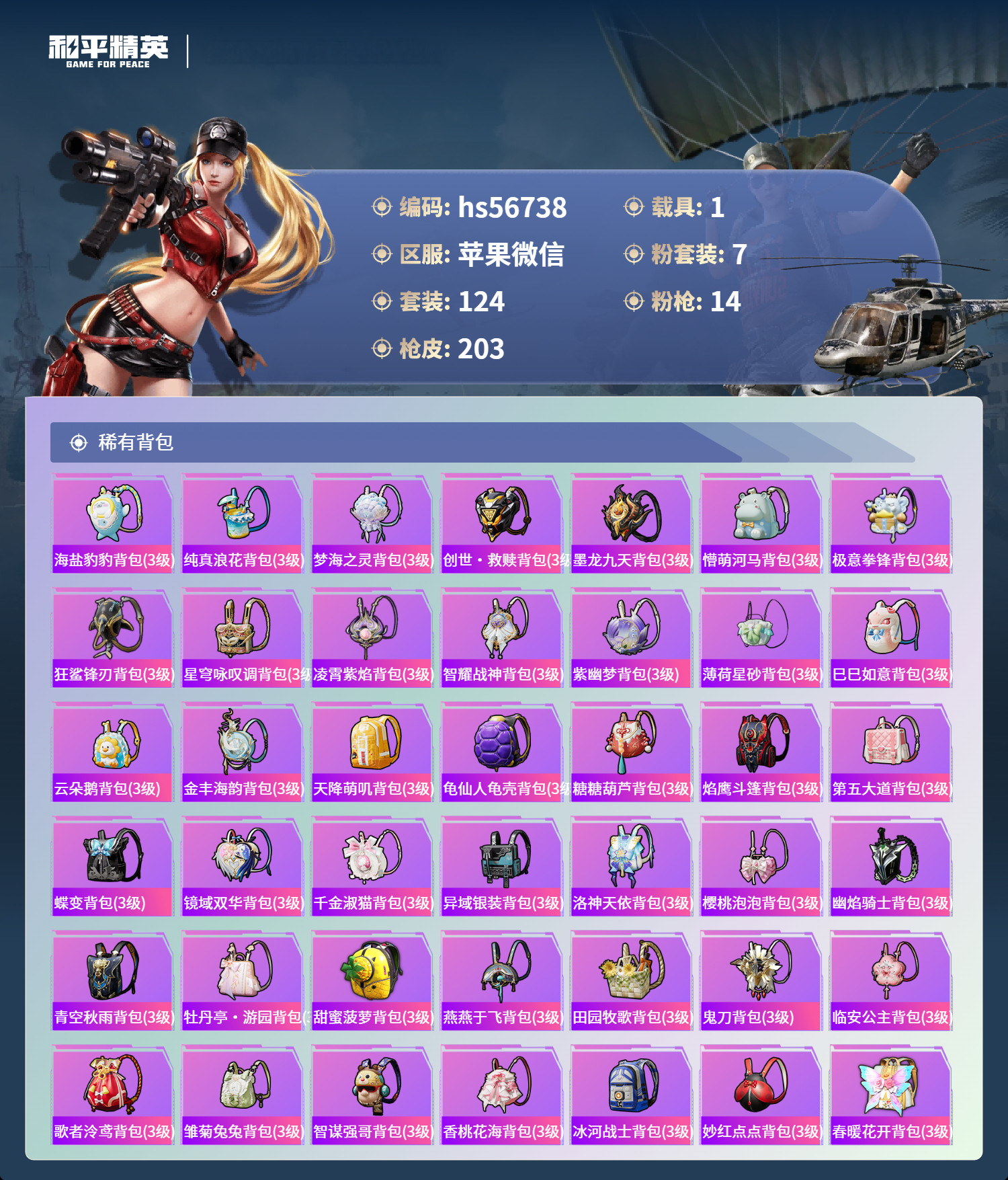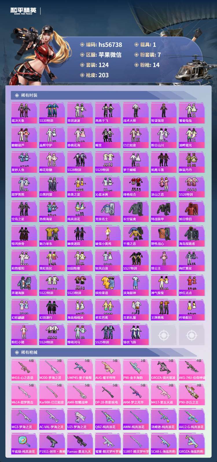hs56738 苹果微-15王牌印记-1红装-7粉装-14特效枪-1载具-73013热力值-124