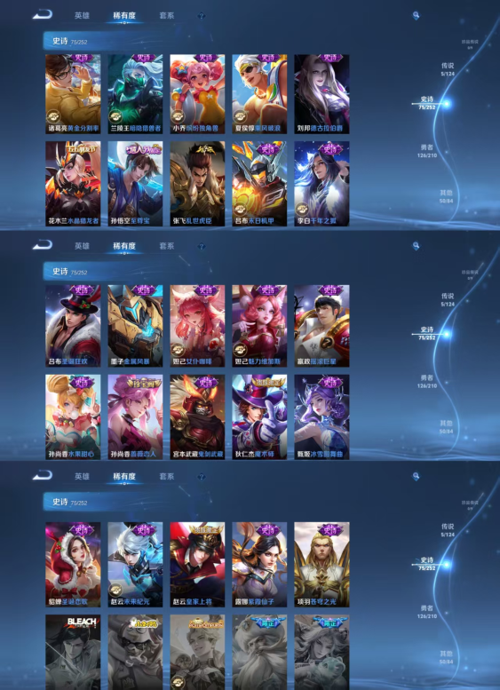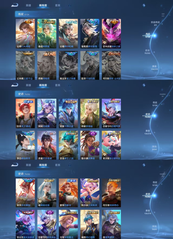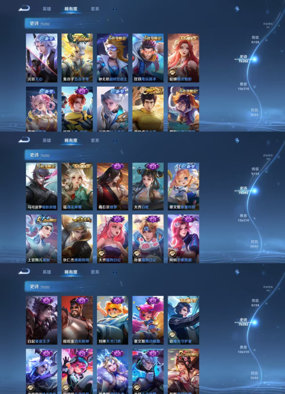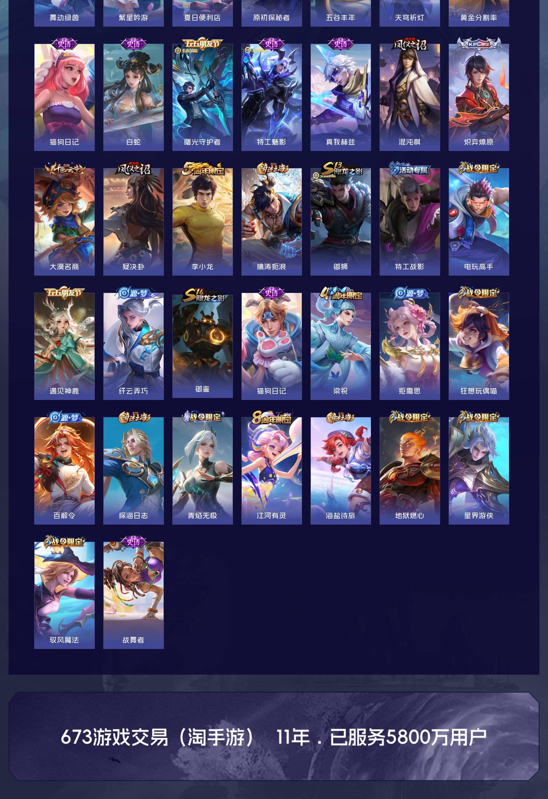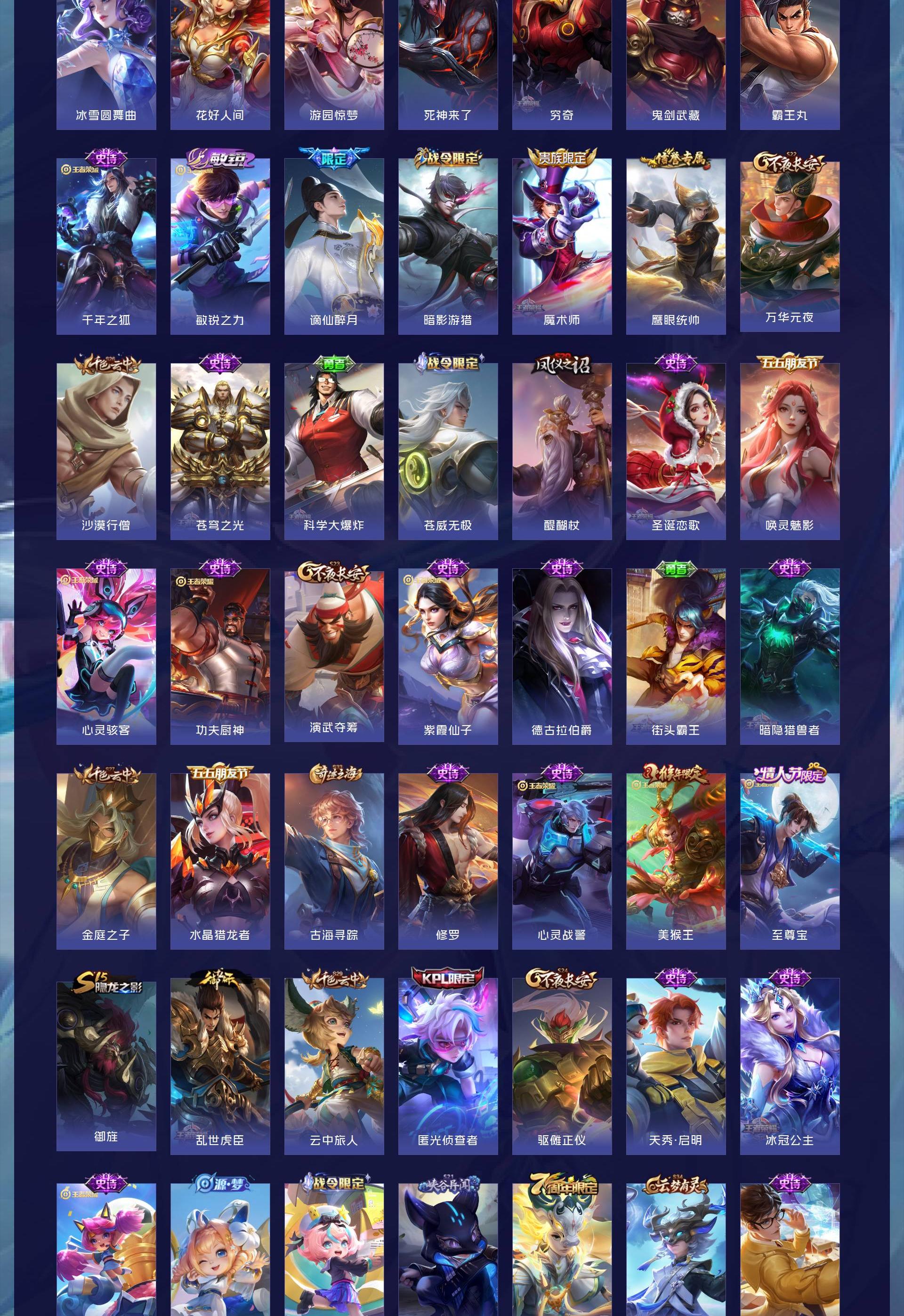 【史诗皮肤】 龙之律动 破空之剑 茶境仙 战舞者 百相守梦 炽弈燎原 布丁狗之约 至尊宝 地狱燃心 遇见神鹿 谪仙醉月 青焰无极 真我赫兹 浮光幕影 夏日便利店 苍威无极 聚星闪耀 江河有灵 决胜大满贯 完美运算 百解令 暖冬絮语 漠中幻影