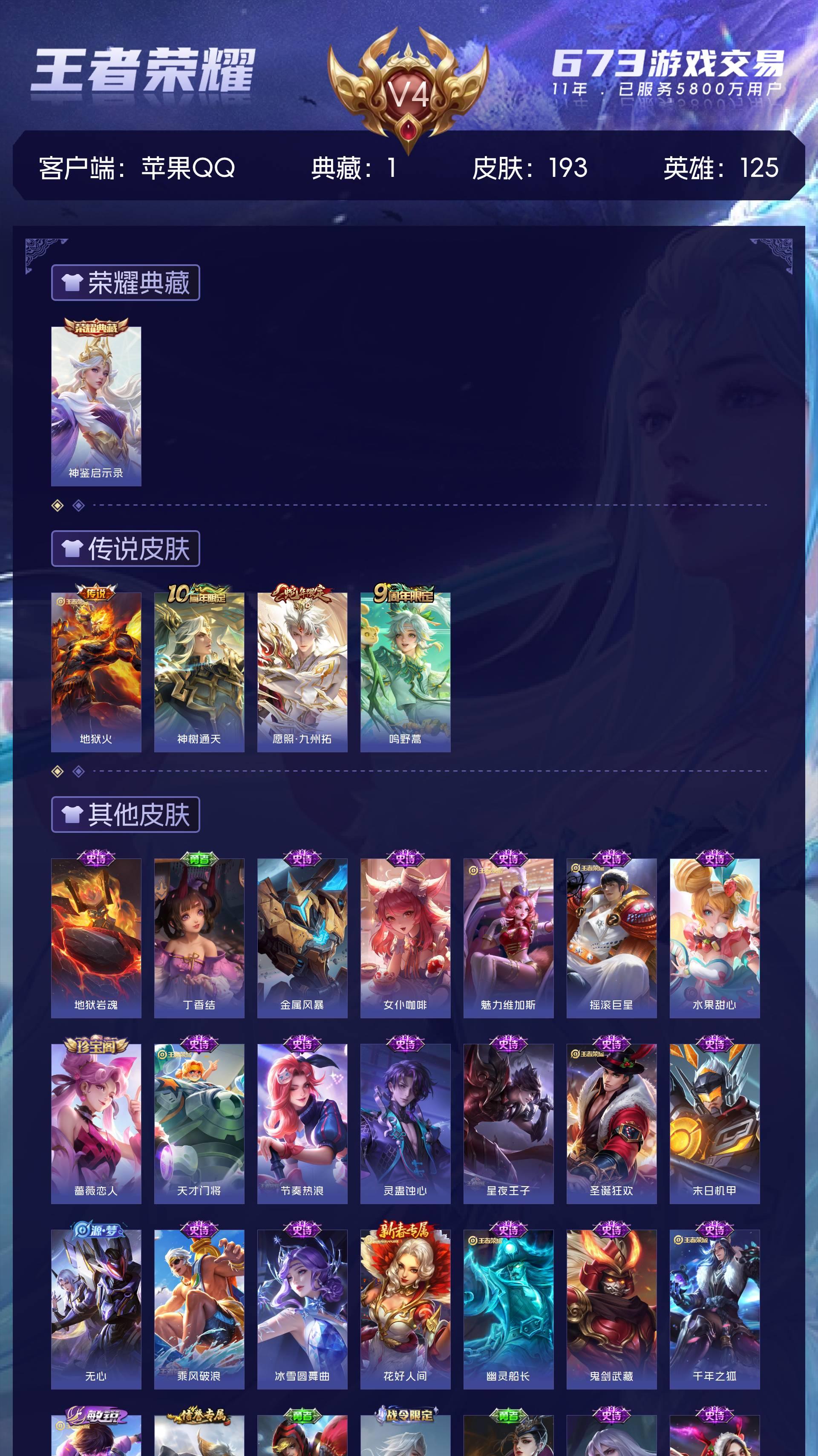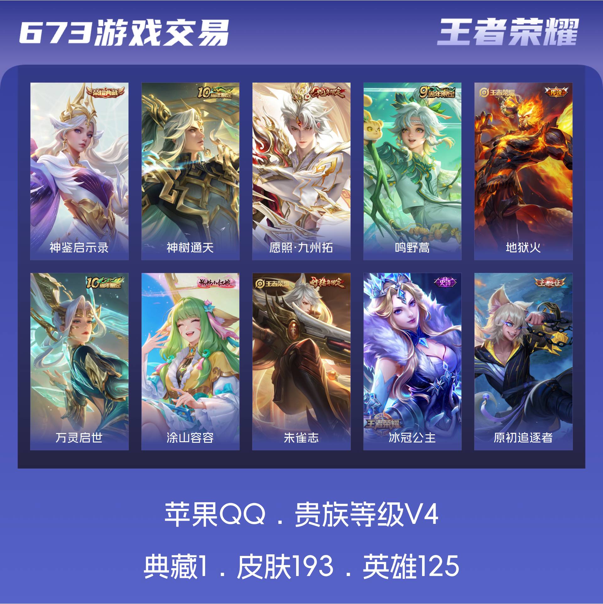 皮肤193 英雄125 荣耀王者 荣耀典藏1 传说4 其他皮肤69-【1典藏4传说1星元V4游戏禁言介意勿拍】苹果Q-193皮