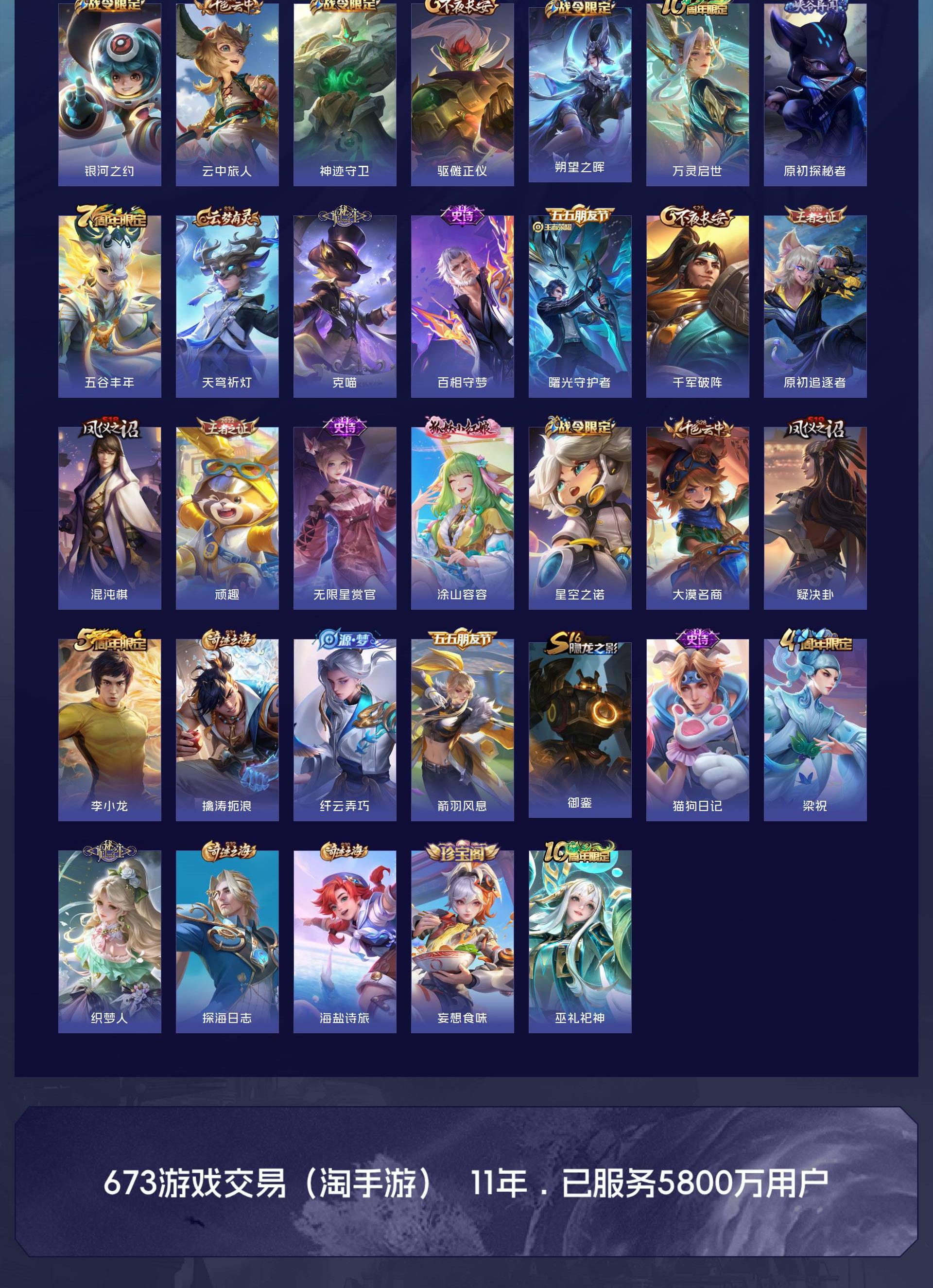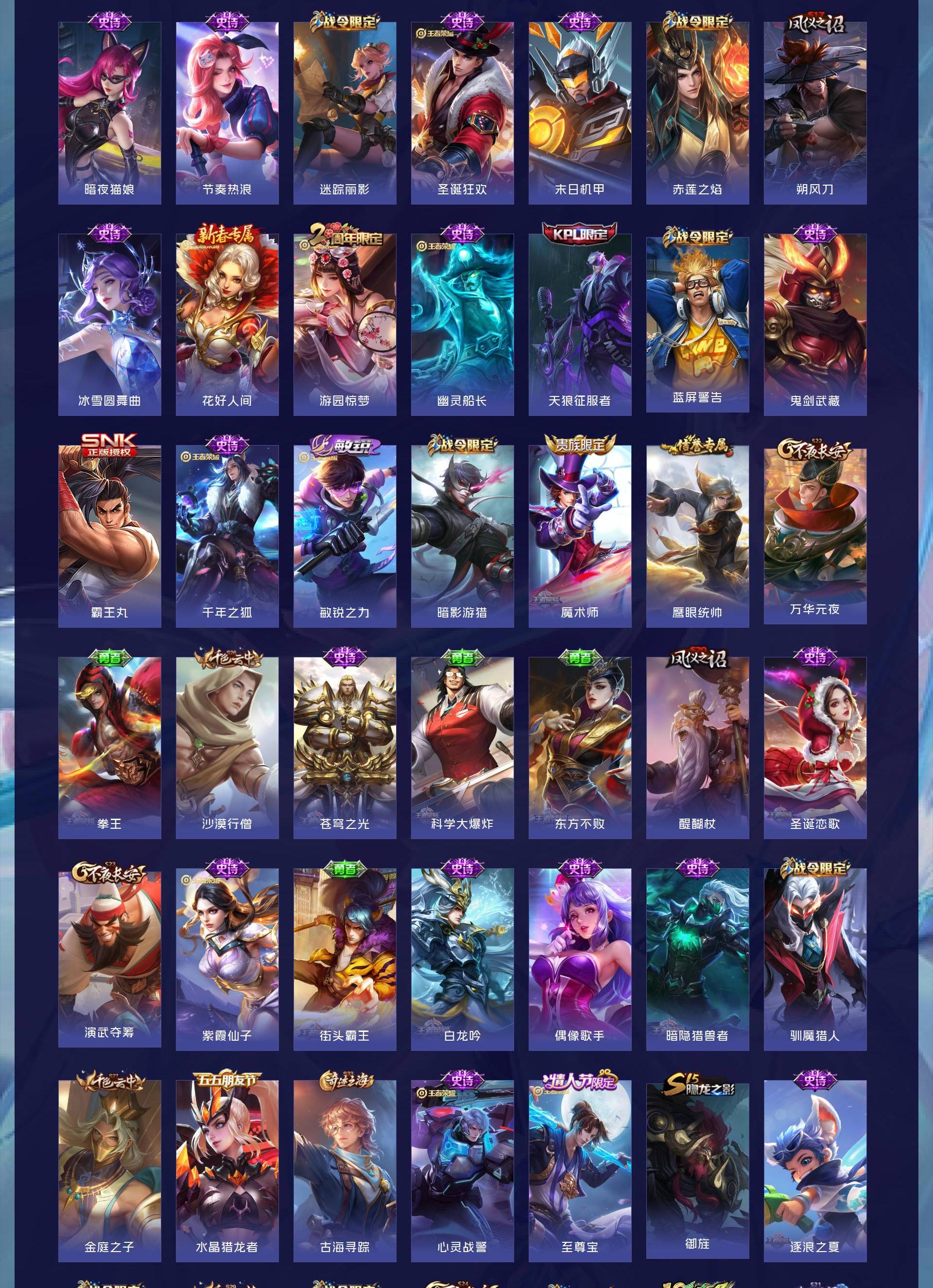 【史诗皮肤】 克喵 龙之律动 织梦人 天狼征服者 踏浪烽翎 布丁狗之约 涂山容容 死霸装 小满鸭 至尊宝 灵野札记 春野闲踪 虚灵犬护 浪漫序章 谧流熔炉 巫礼祀神 万灵启世 罗小黑战记 玫蓝誓约 命运加冕 铁骨偃魂 苍林