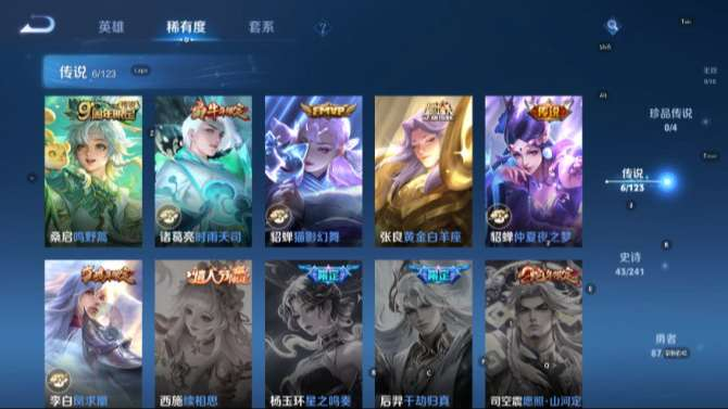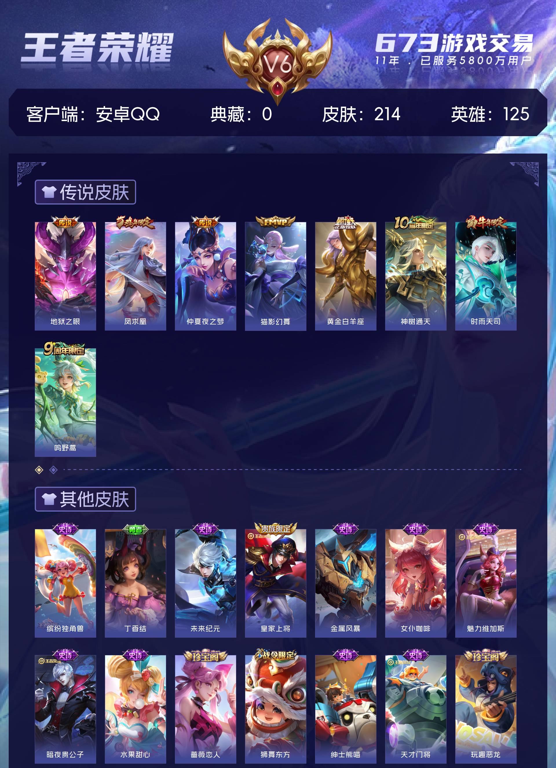 皮肤214 英雄125 绝世王者 传说8 其他皮肤89-【V6 6传说1星元金色仲夏夜 时雨天司 至尊宝 凤求凰】