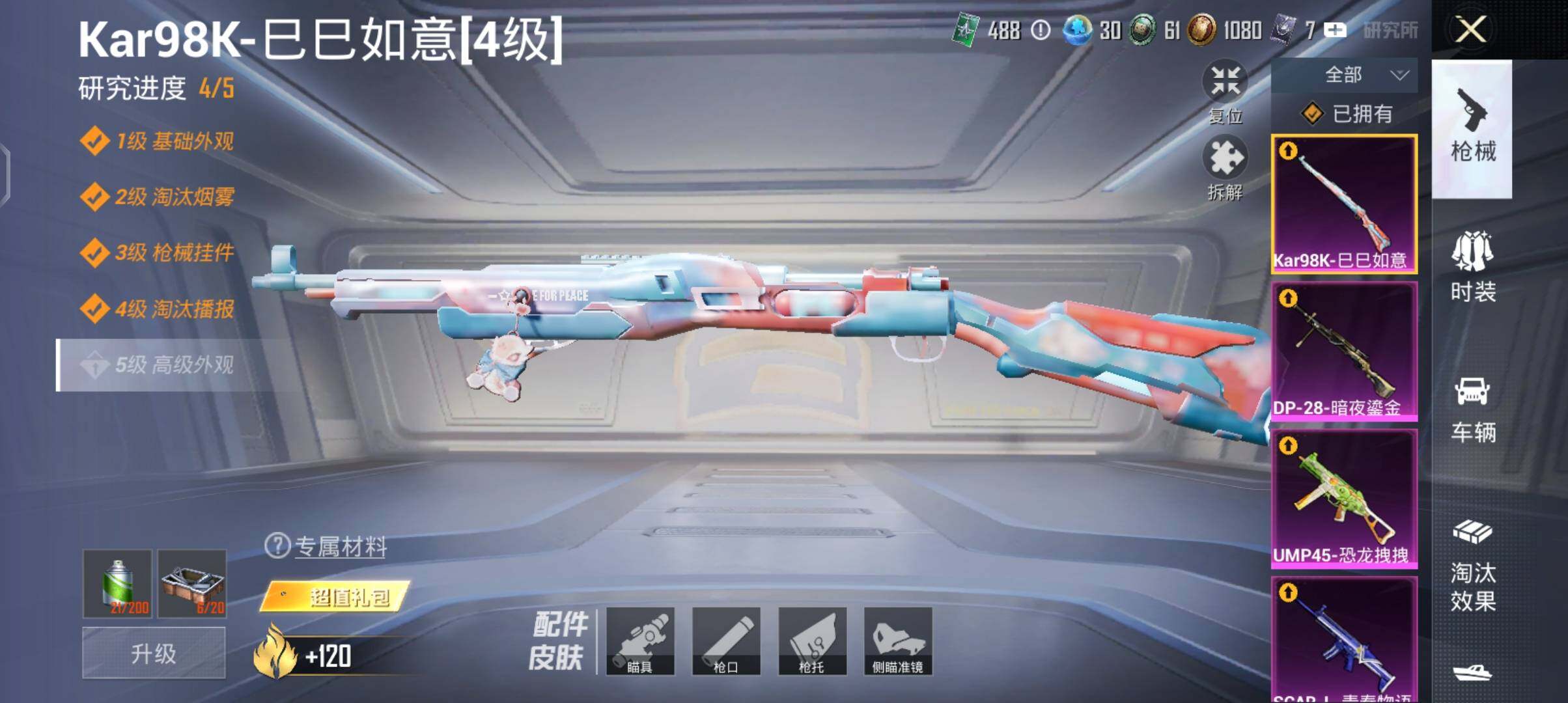 【粉色枪皮等级】:SCAR-L-青春物语(六级),UMP45-恐龙拽拽(七级),Kar98K-巳巳如意(四级