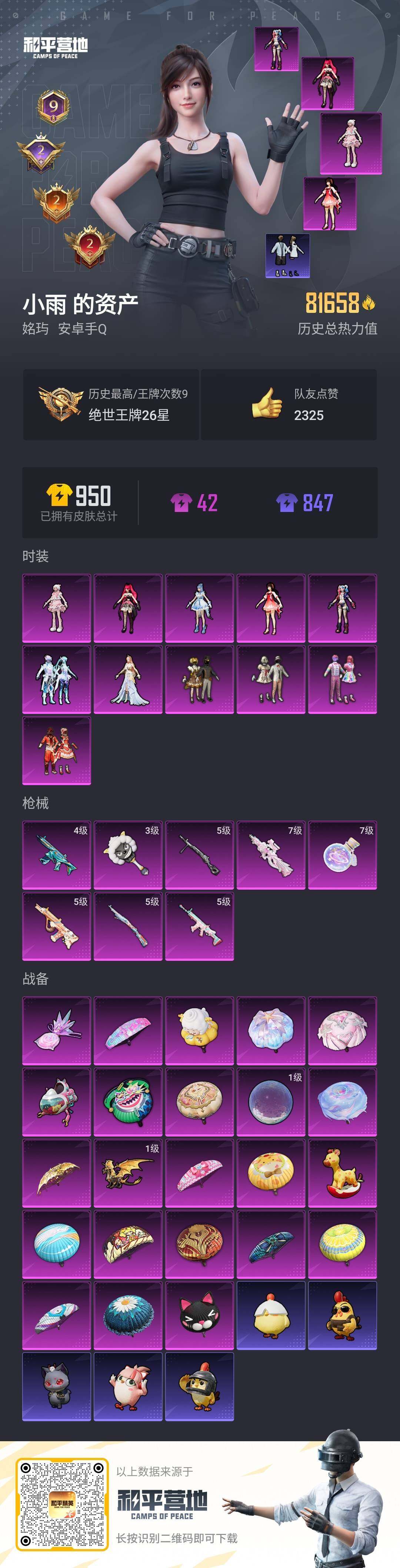 苹果 手Q-13粉装-3特效枪-0载具-5粉色飞行器-52660热力值-7王牌印记-136套装-172枪皮