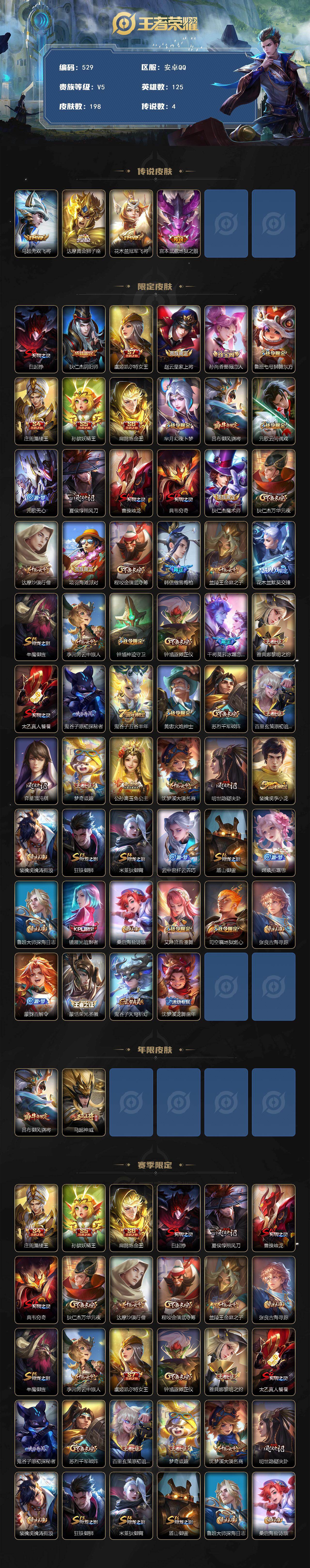 安卓Q-V5-最强王者段位-125英雄-198皮肤-4传说-48史诗【英雄全