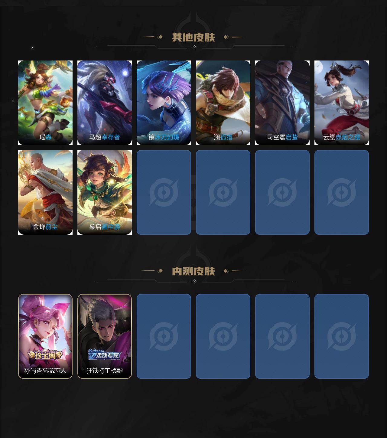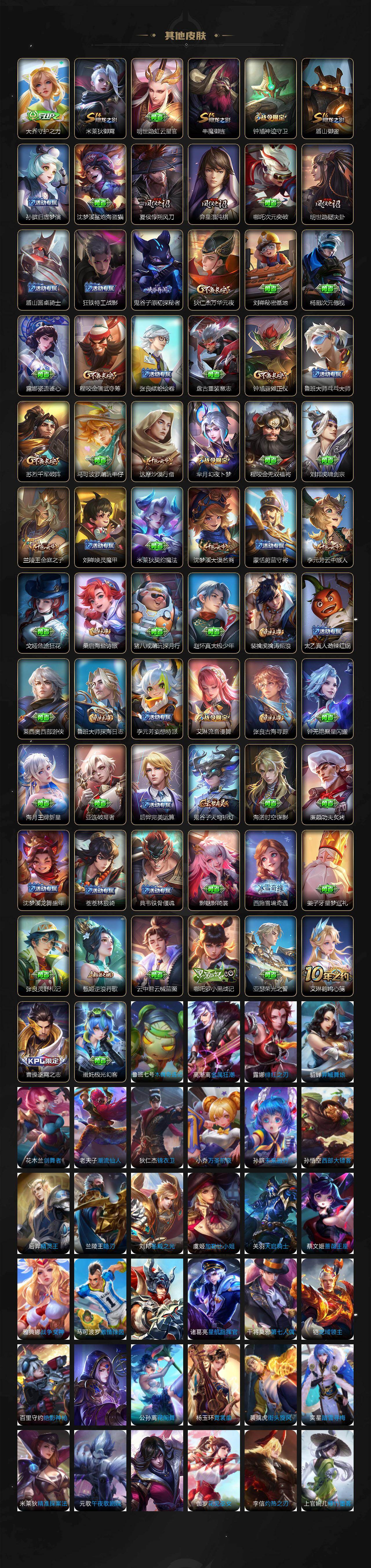 【限定皮肤】:白起狰,狄仁杰阴阳师,虞姬凯尔特女王,赵云皇家上将,孙尚香蔷薇恋人,鲁班七号狮舞东方,庄周蜃楼王,孙膑妖精王,扁鹊炼金王,芈月幻夜卜梦,吕布御风骁将,元歌云间偶戏,元歌无心,夏侯惇朔