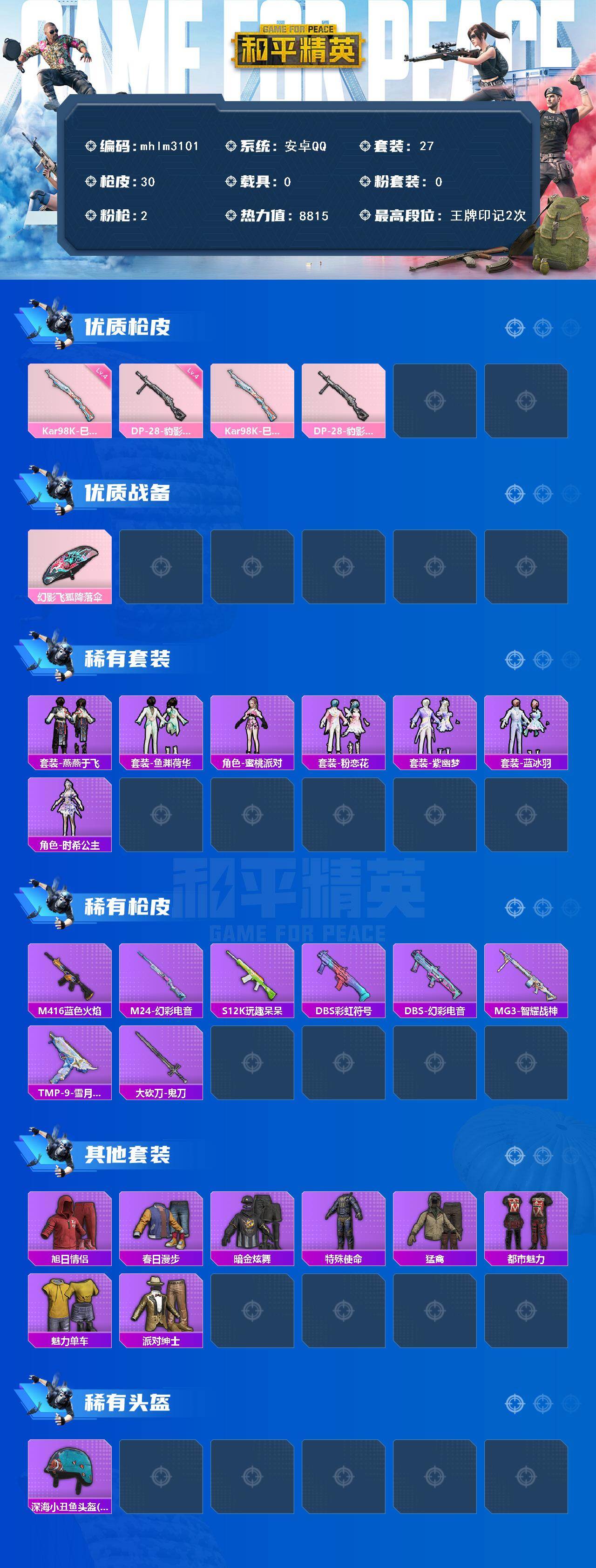 【mhlm3101】安卓 手Q-0粉装-2特效枪-0载具-0粉色飞行器-8815热力值-2王牌印记-27套装-30枪皮