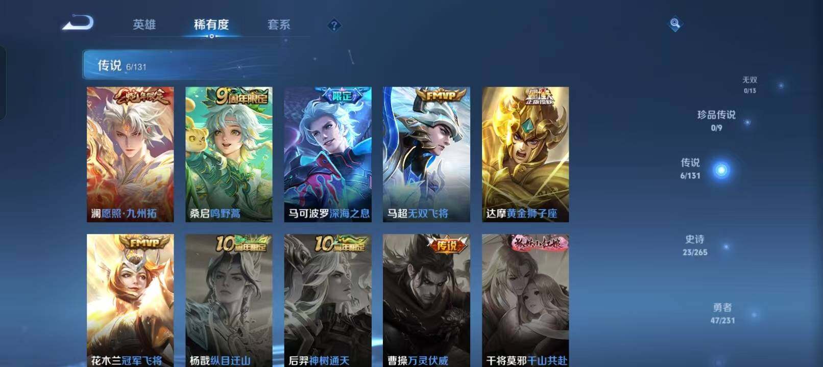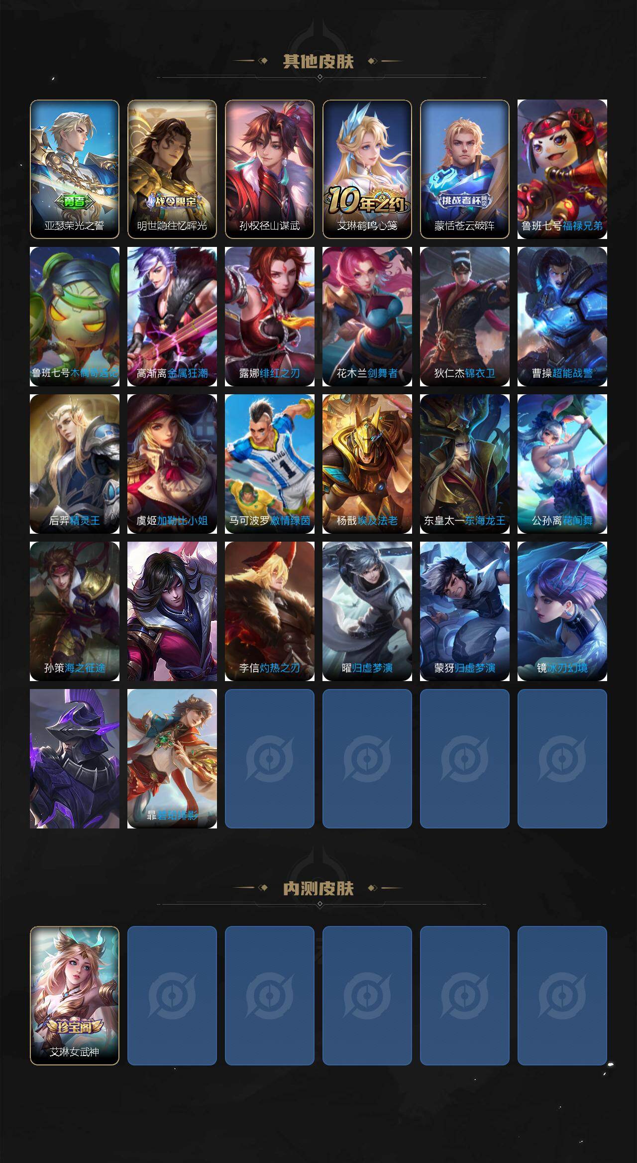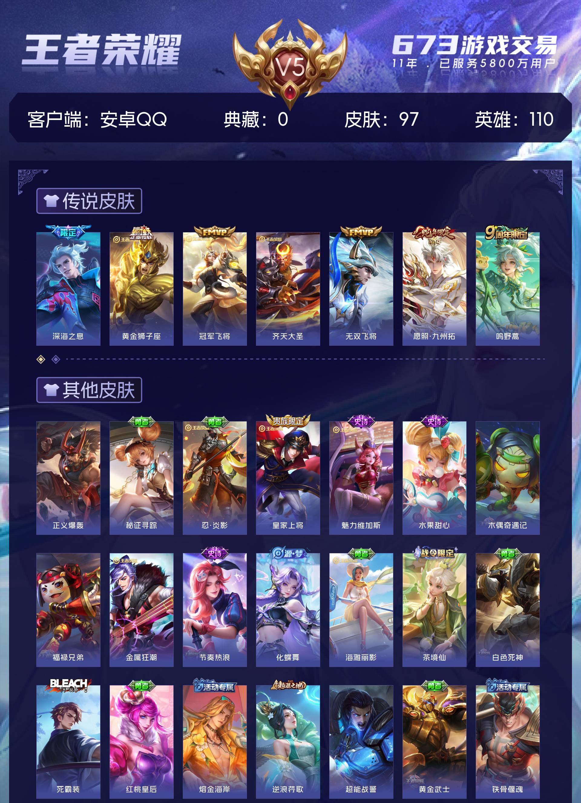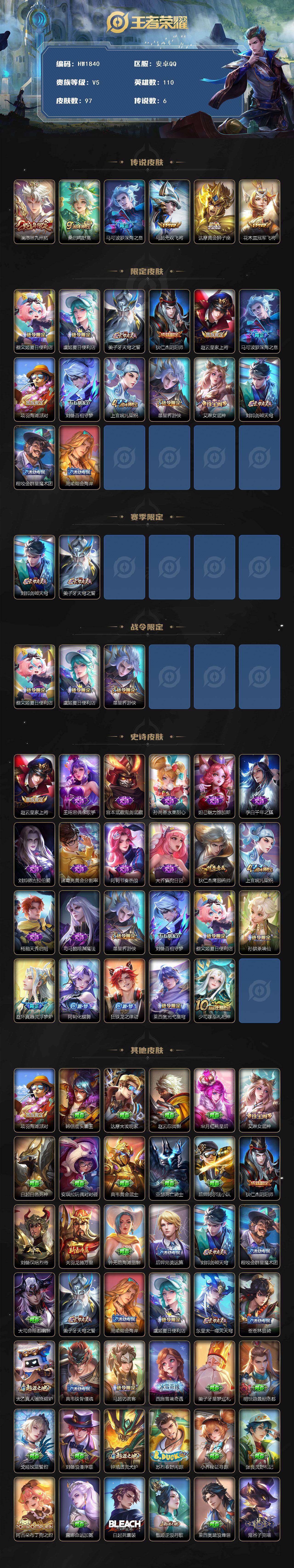 皮肤97 英雄110 绝世王者 传说7 其他皮肤95-97皮肤6传说 愿照九州拓 深海之息 无双飞将 黄金狮子座 冠军飞将 鸣野蒿