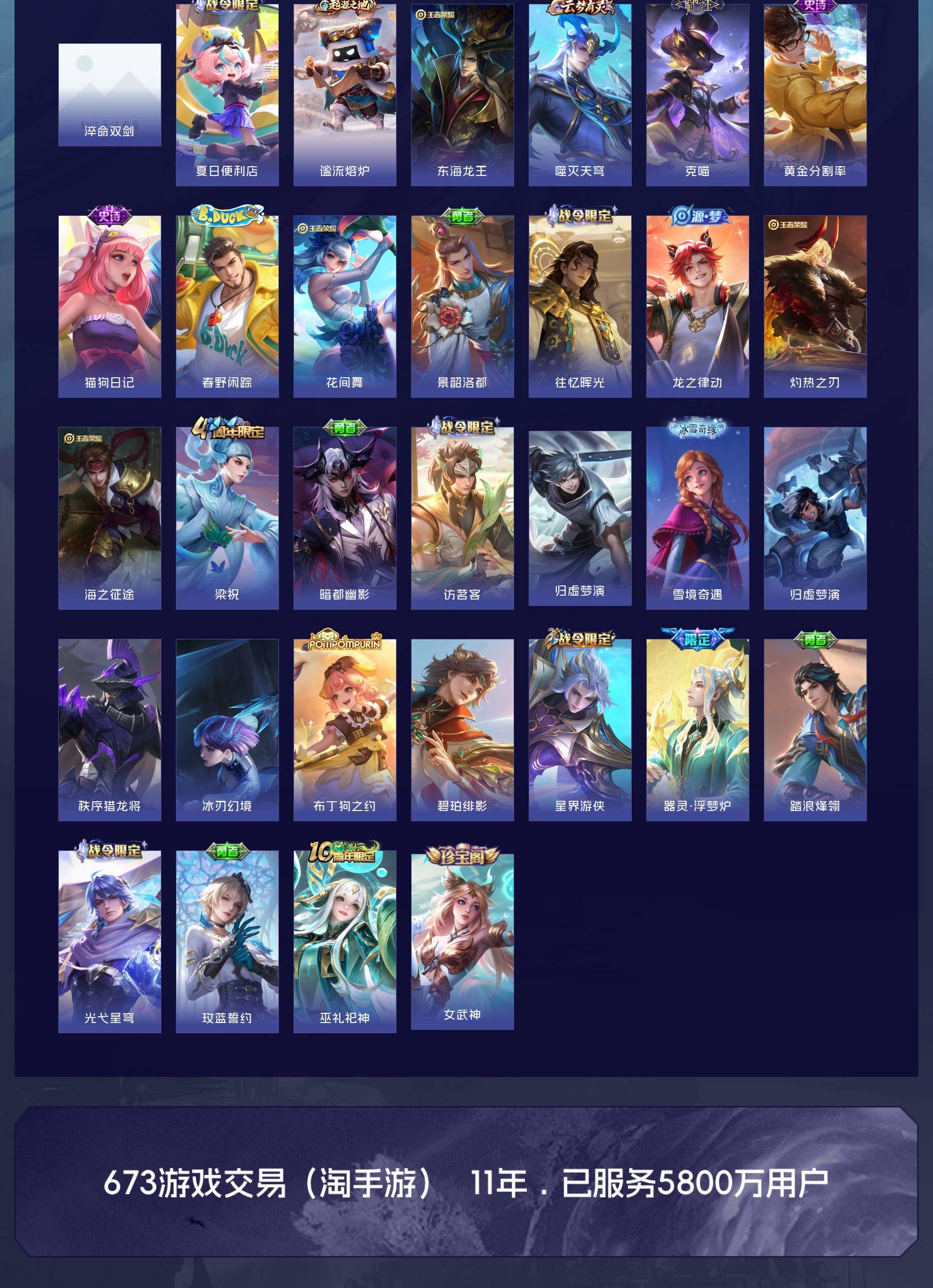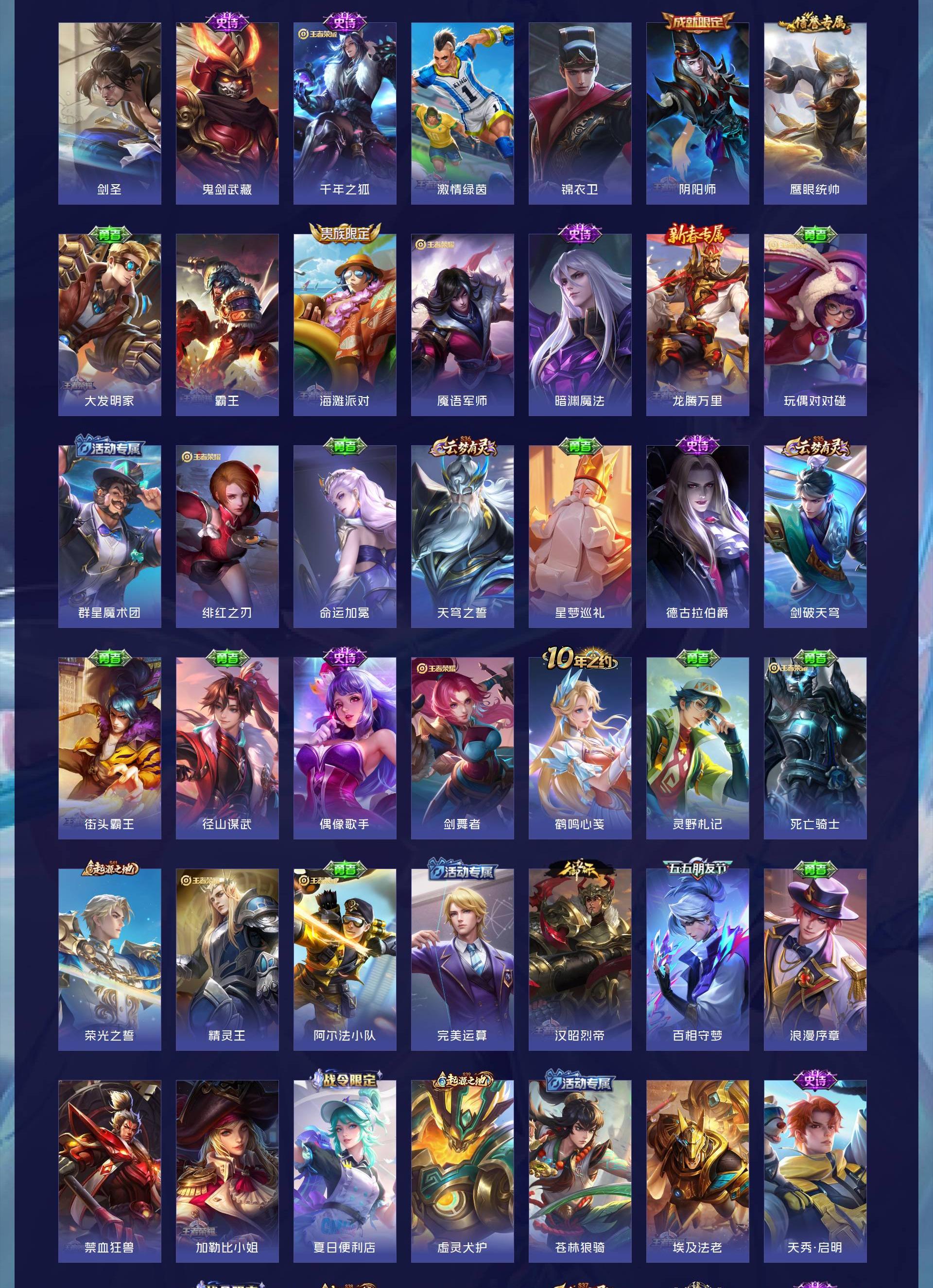 【限定皮肤】:蔡文姬夏日便利店,虞姬夏日便利店,姜子牙天穹之誓,狄仁杰阴阳师,赵云皇家上将,马可波罗深海之息,项羽海滩派对,刘备百相守梦,上官婉儿梁祝,暃星界游侠,艾琳女武神,刘邦剑破天穹,程咬金群星魔术团,周瑜熔金海岸
