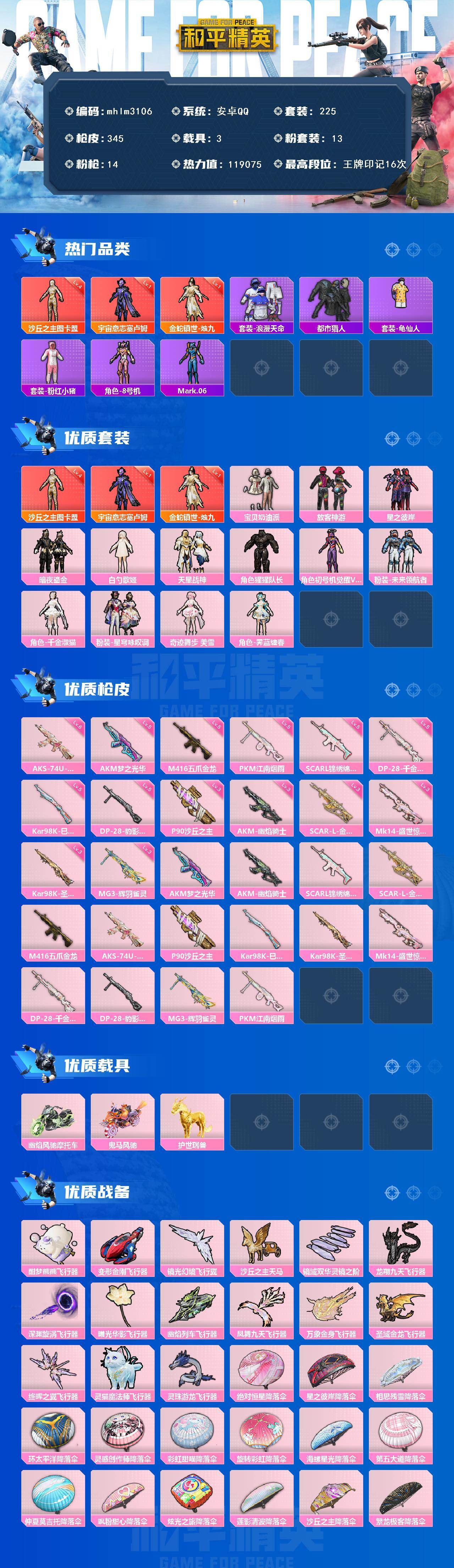 【mhlm3106】安卓 手Q-3神装-13粉装-14特效枪-3载具-17粉色飞行器-119075热力值-16王牌印记-225套装-345枪皮