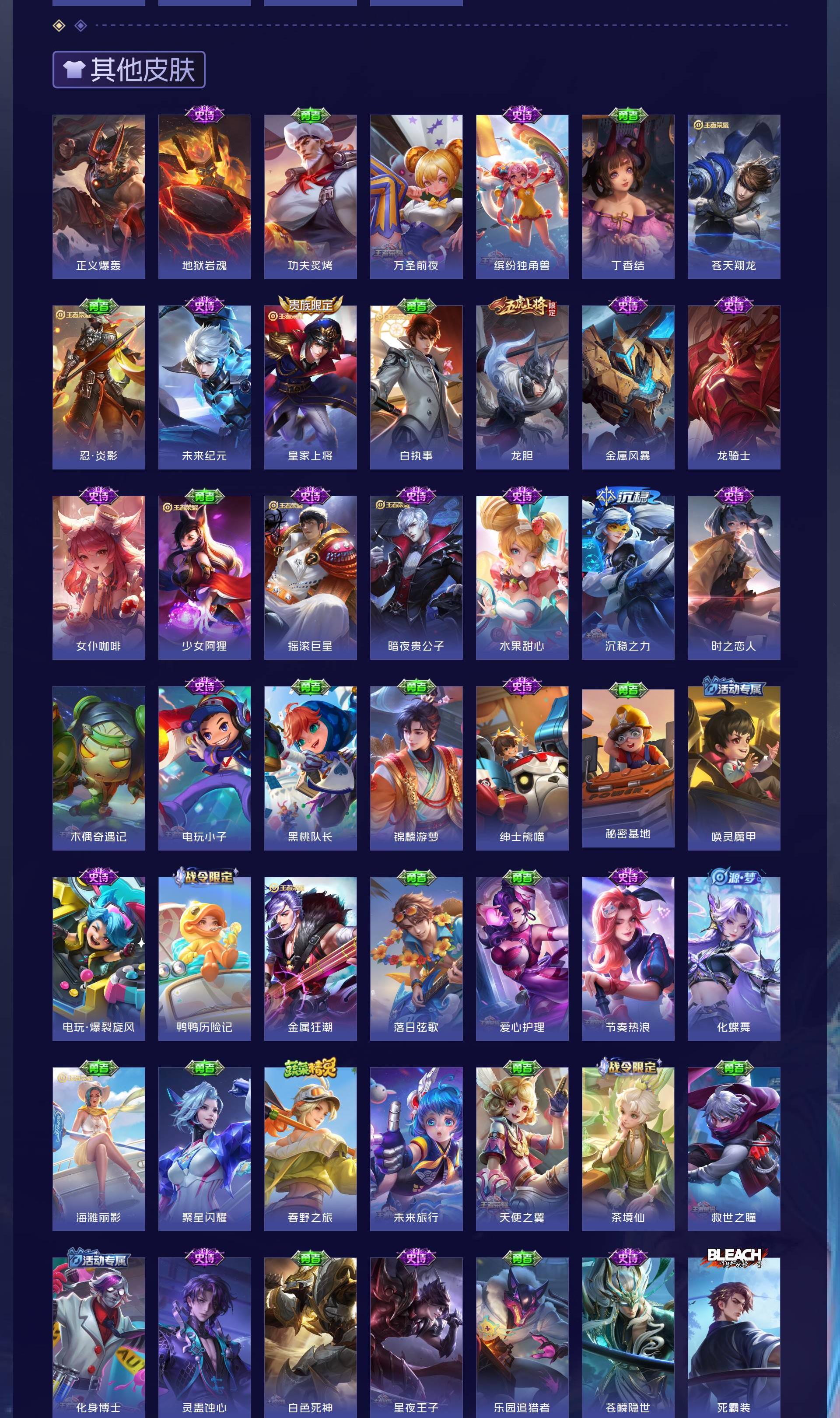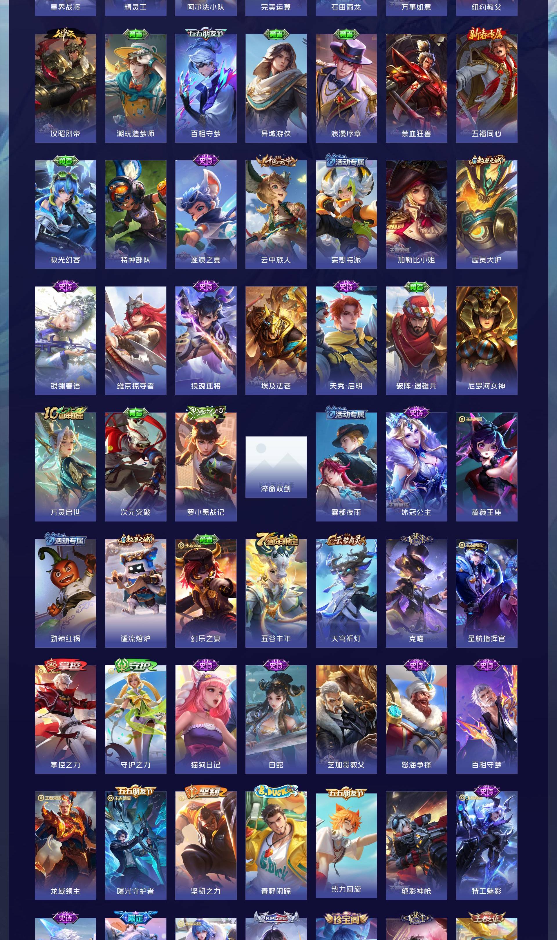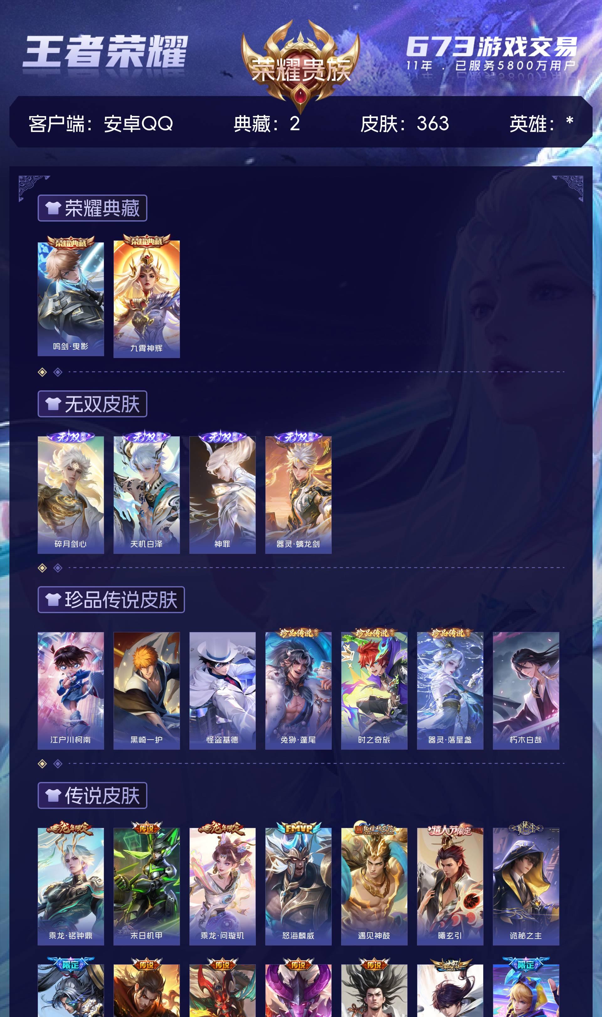 荣耀贵族 皮肤363 英雄* 荣耀王者 荣耀典藏2 无双皮肤4 珍品传说7 星传说1 传说60 其他皮肤295