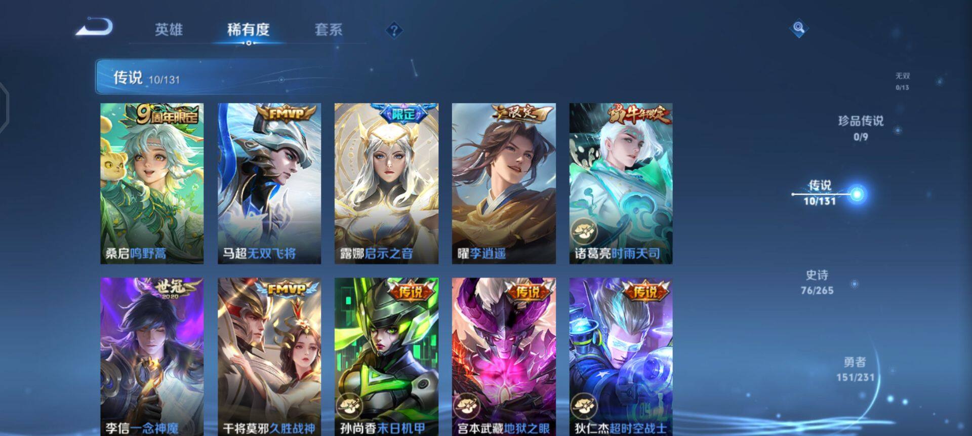 【传说皮肤】:桑启鸣野蒿,马超无双飞将,露娜启示之音,曜李逍遥 ,诸葛亮时雨天司,李信一念神魔,干将莫邪