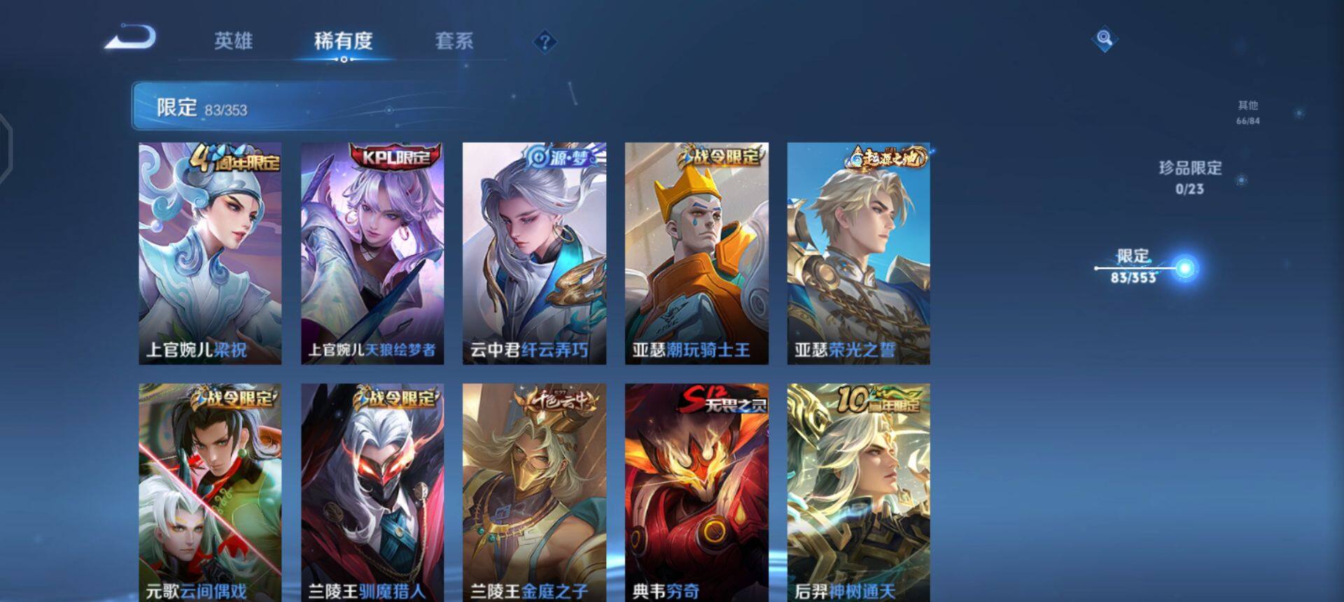 【传说皮肤】:后羿神树通天,云缨幻光神枪,鲁班七号寅虎瑞焰,虞姬启明星使,孙悟空零号赤焰,曜云鹰飞将,李信一念神