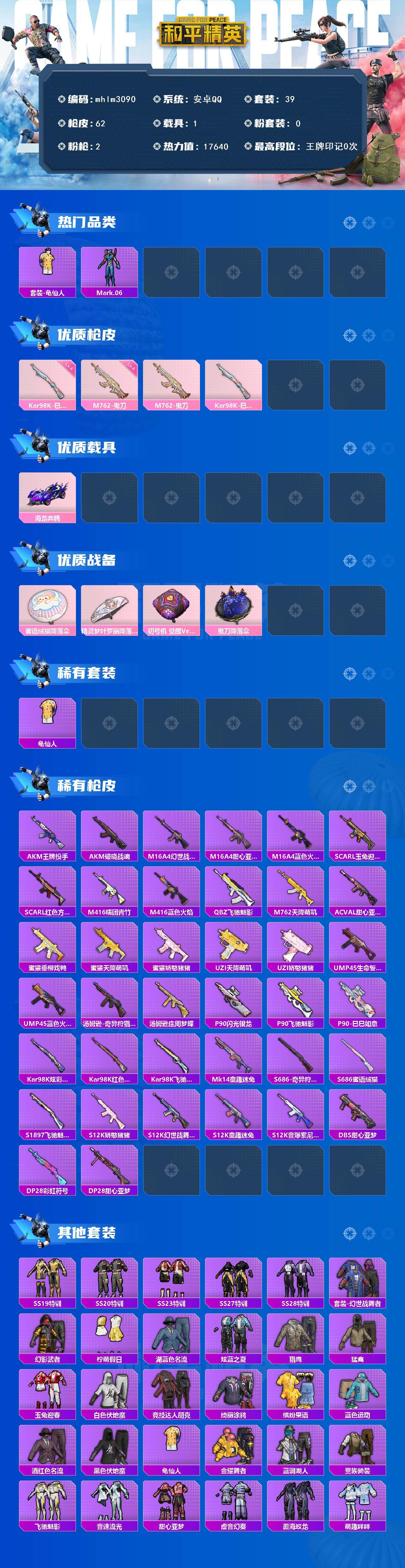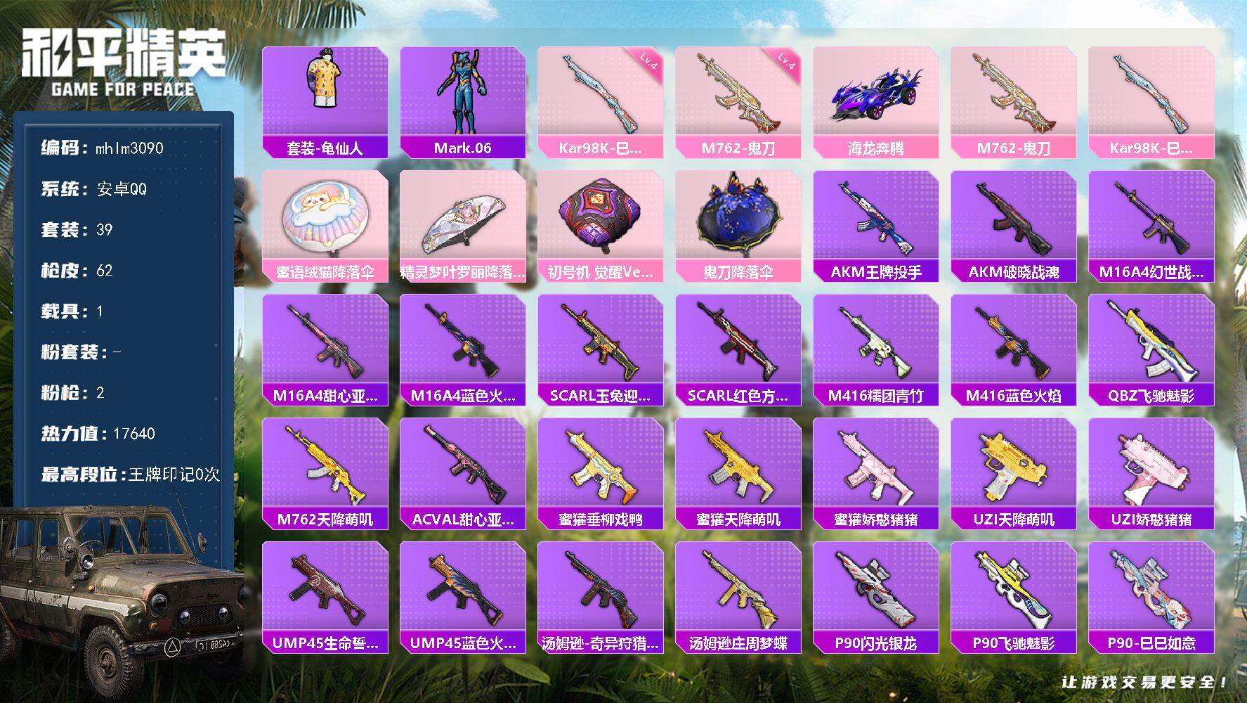 【mhlm3090】安卓 手Q-0粉装-2特效枪-1载具-0粉色飞行器-17640热力值-2王牌印记-39套装-62枪皮