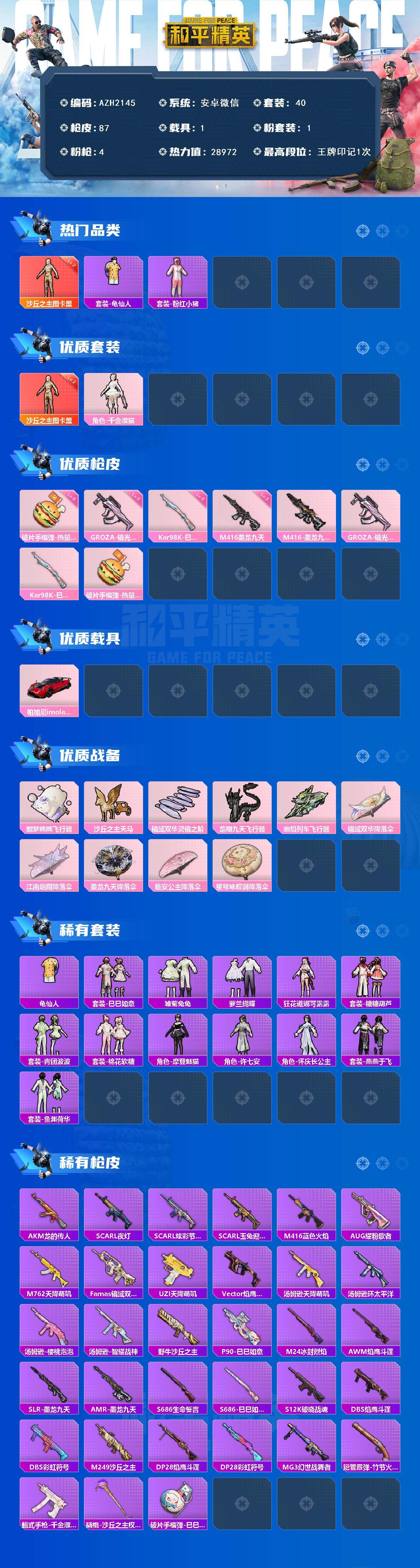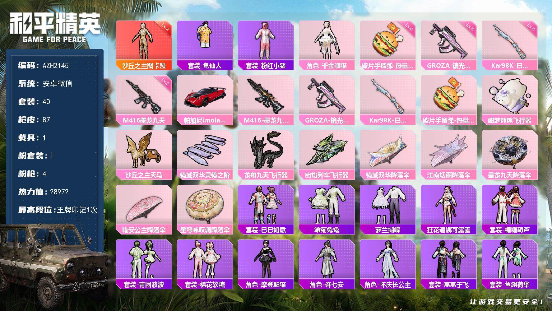 【AZH2145】安卓 微信【二级图卡盟 千金淑猫 三级墨龙九天M416六级手雷-热量炸弹 1载具】1神装-1粉装-4特效枪-1载具-5粉色飞行器-28972热力值-1王牌印记-40套装-87枪皮