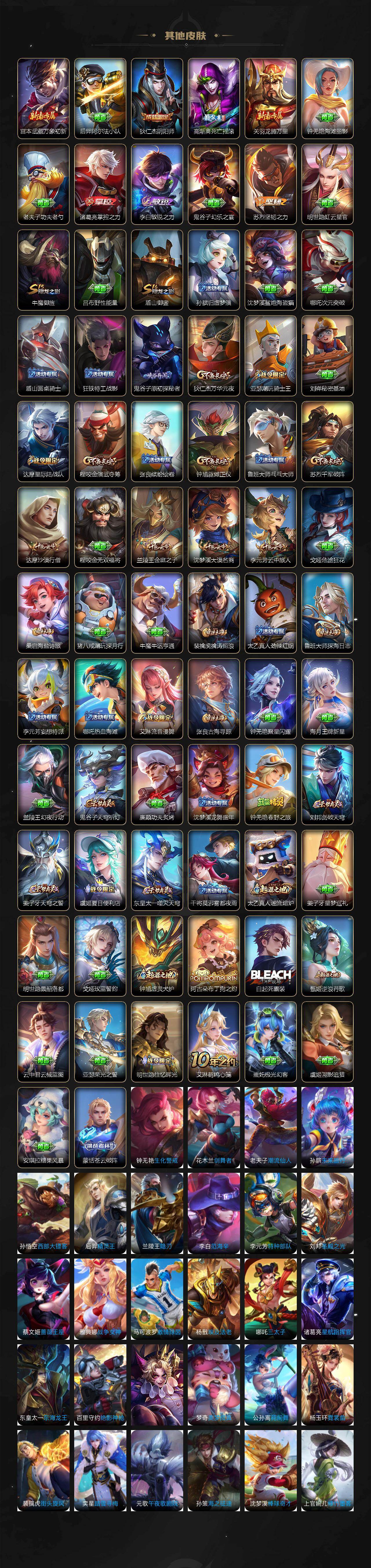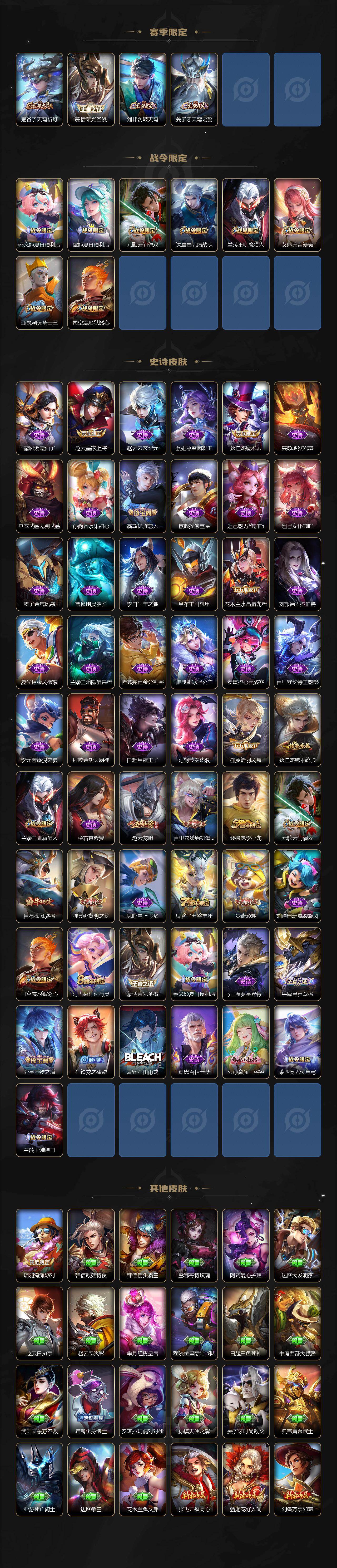 【传说皮肤】:后羿神树通天,云缨幻光神枪,桑启鸣野蒿,典韦战鼓燎原,兰陵王影龙天霄,马可波罗妄想实况,诸葛