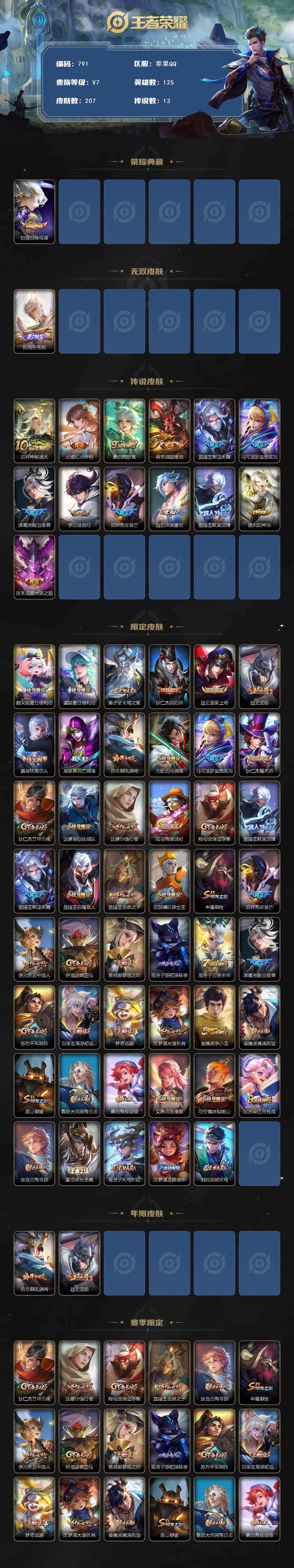 /大国标兰陵王 小国标钟无艳 哪吒 打野54段 金标橘右京 赵云1933322 王者荣耀账号 苹果Q-V7-最强王者段位-125英雄-207皮肤-1典藏皮肤-1无双-13传说-55史诗