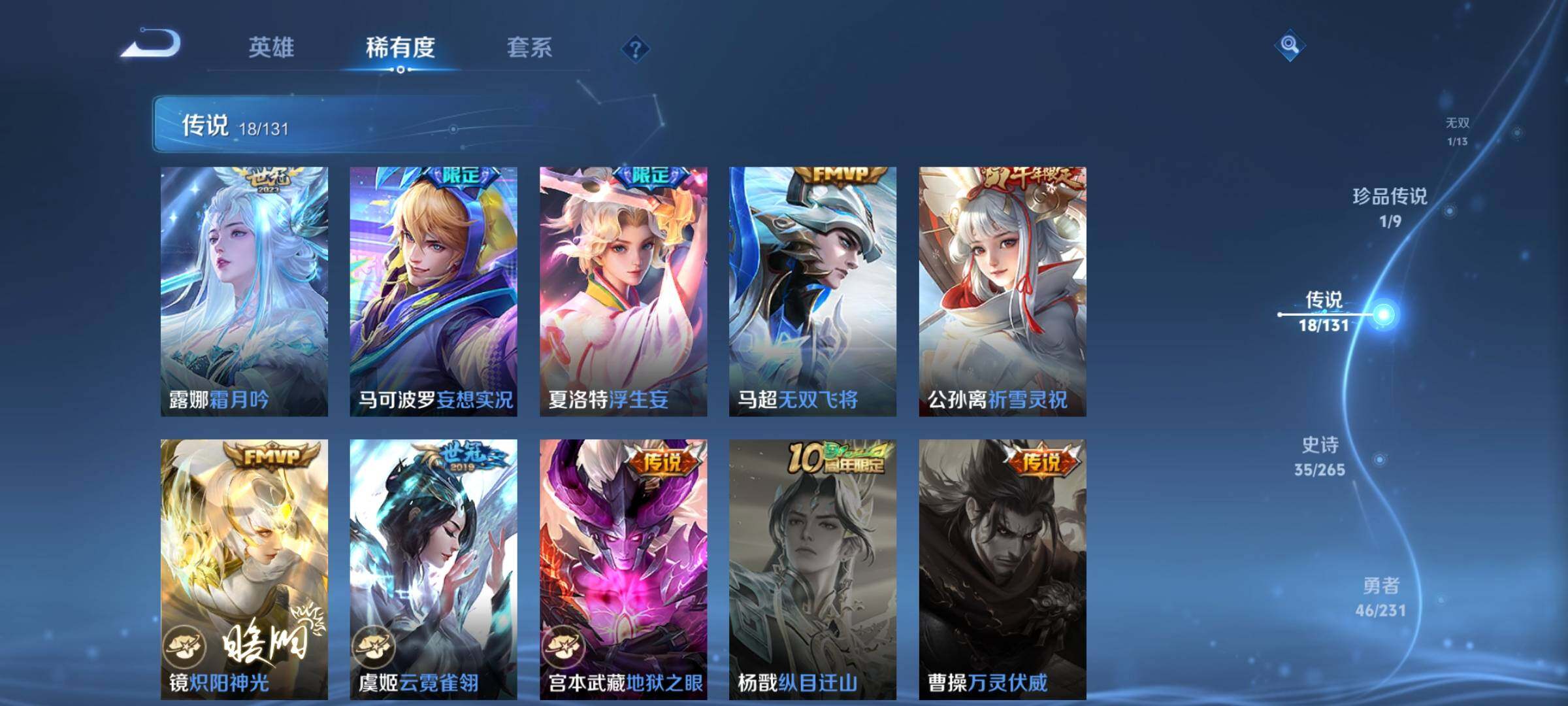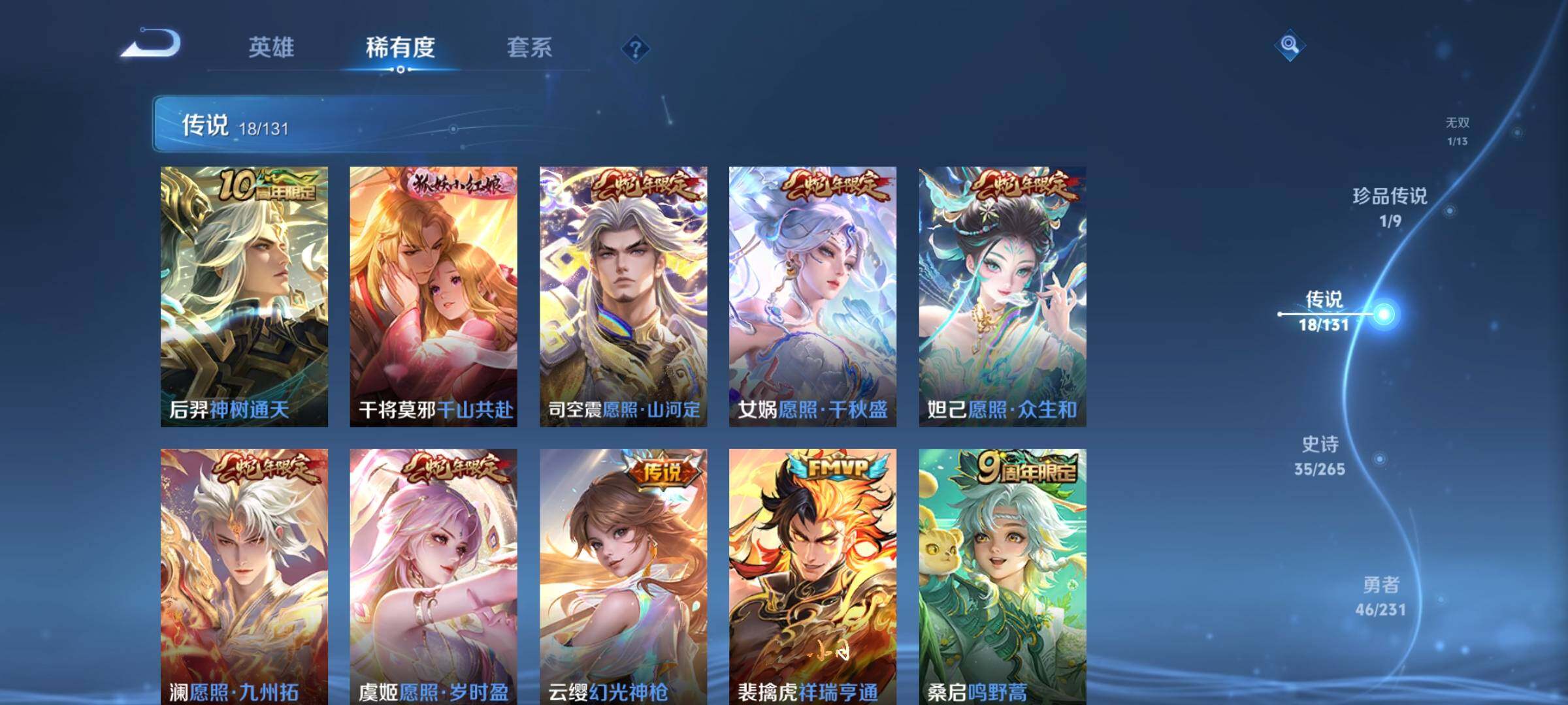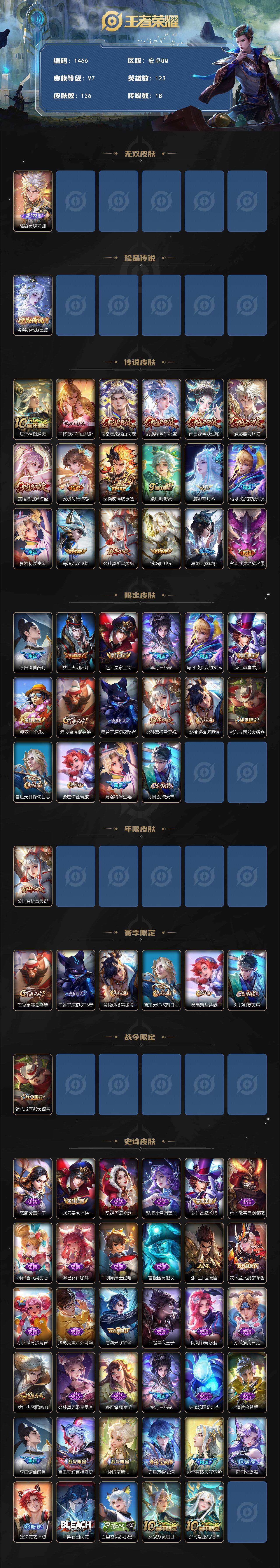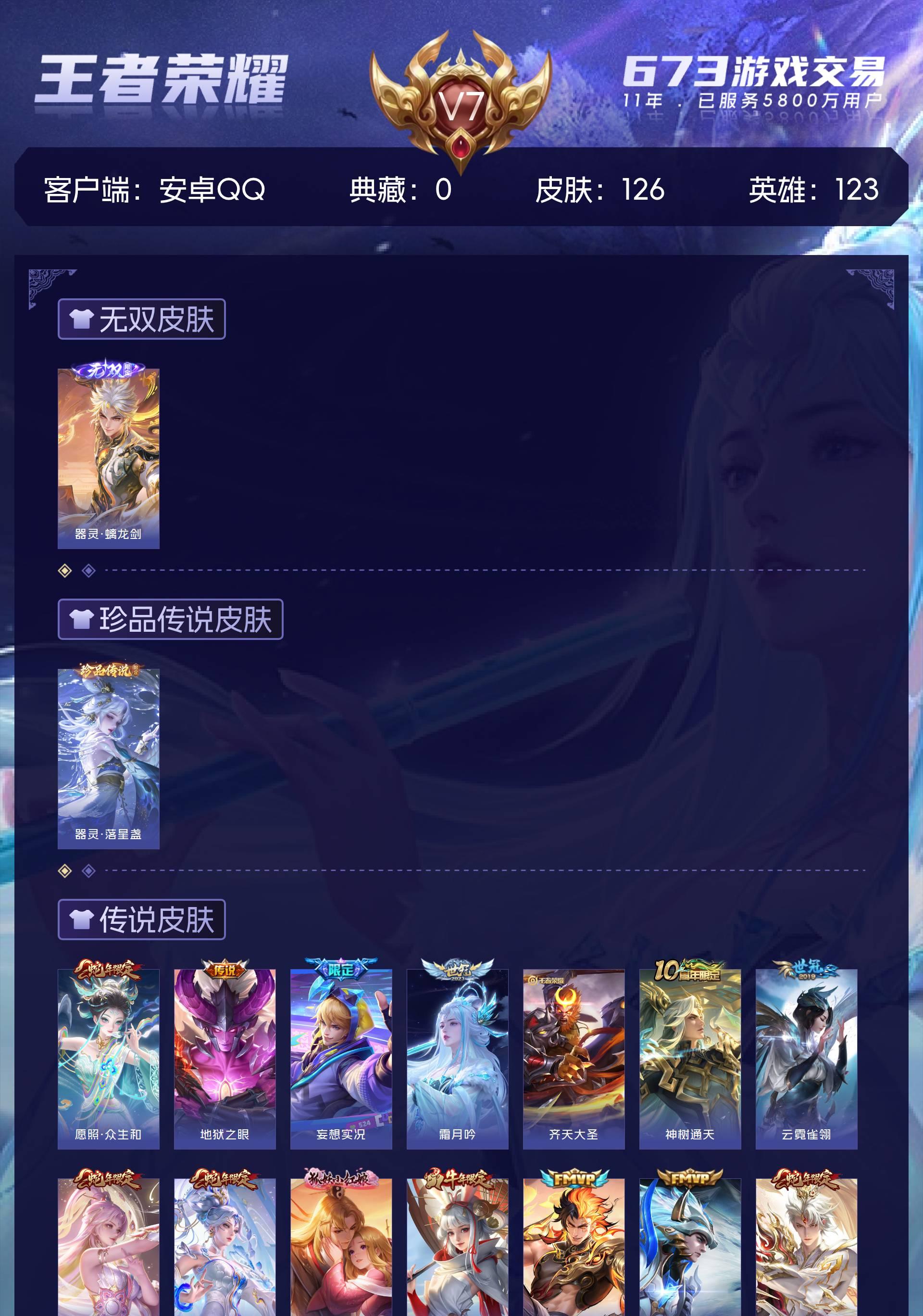 /【126皮1无双1珍品18传说 螭龙剑 落星盏 千山共赴 山河定 千秋盛 众生和 九州拓 岁时盈】安卓Q-V7-最强王者段位-123英雄-126皮肤-1无双-1珍品传说-18传说-35史诗