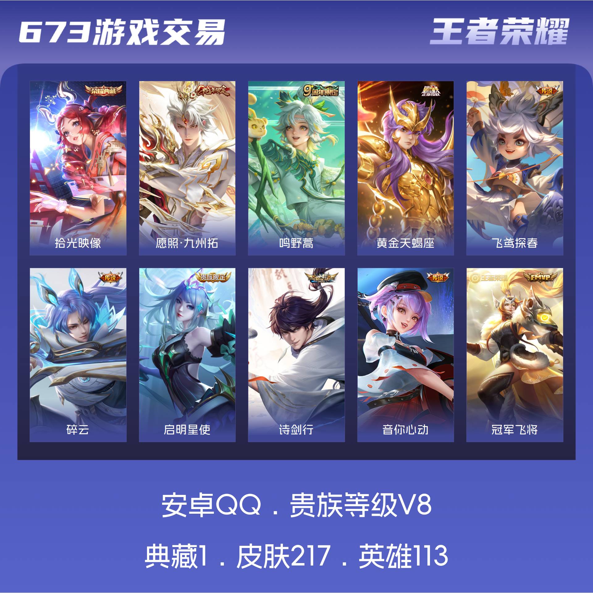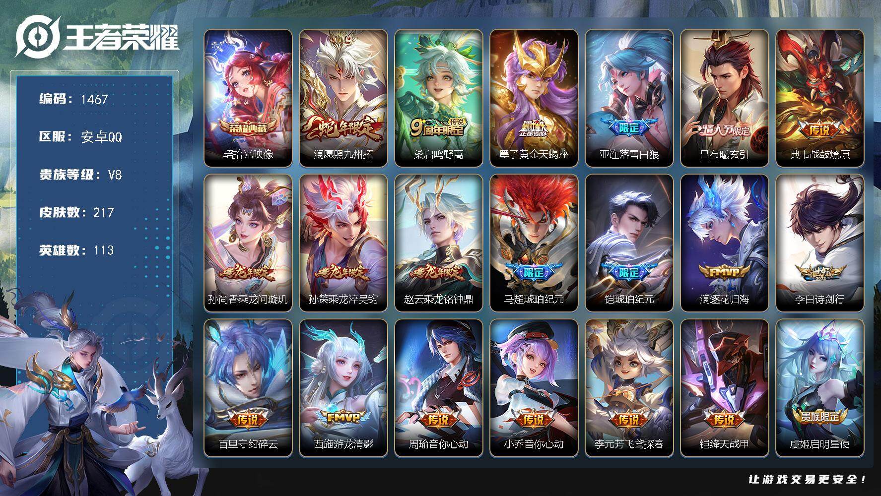 /【217皮1典藏27传说 拾光映像 愿照九州拓 黄金天蝎座 落雪白狼 琥珀纪元 琥珀纪元 诗剑行 游龙清影】安卓Q-V8-永恒钻石V段位-113英雄-217皮肤-1典藏皮肤-27传说-49史诗