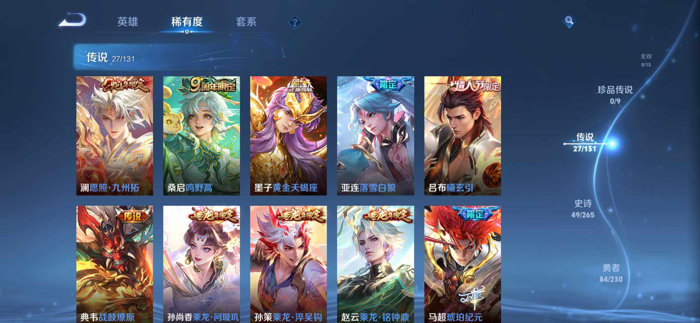 【传说皮肤】:澜愿照九州拓,桑启鸣野蒿,墨子黄金天蝎座,亚连落雪白狼,吕布曦玄引,典韦战鼓燎原,孙尚香乘龙问璇玑,孙策乘