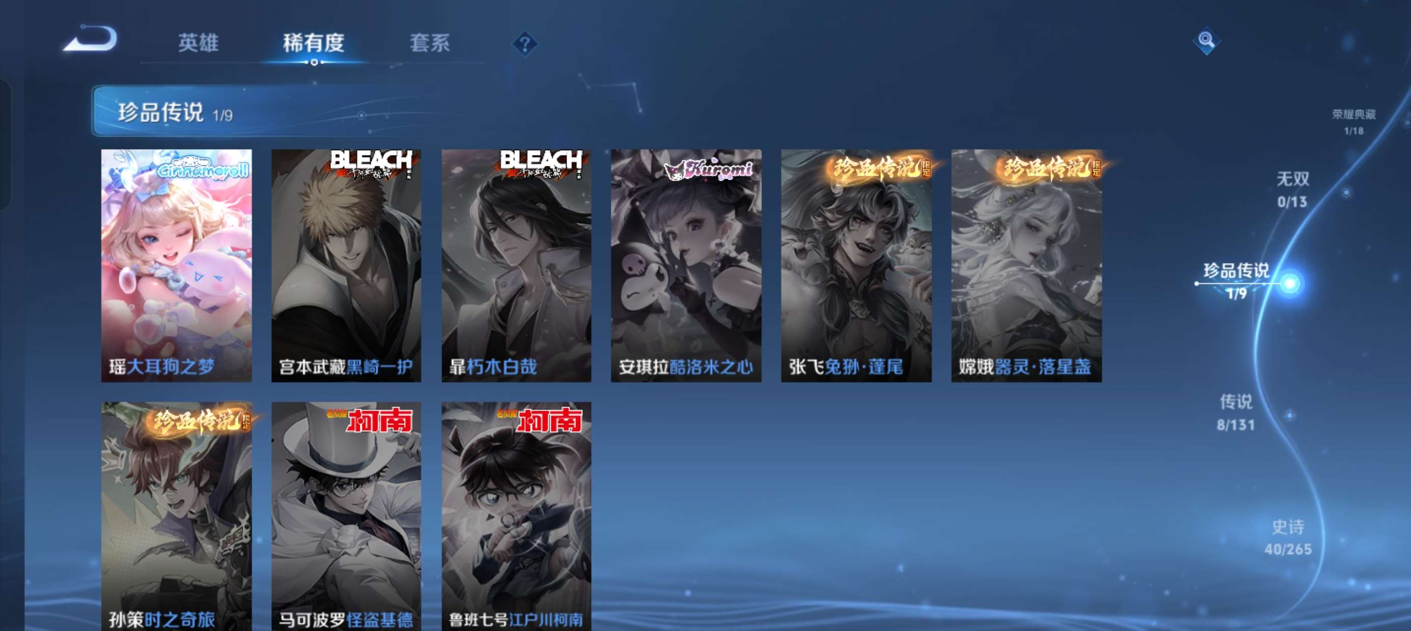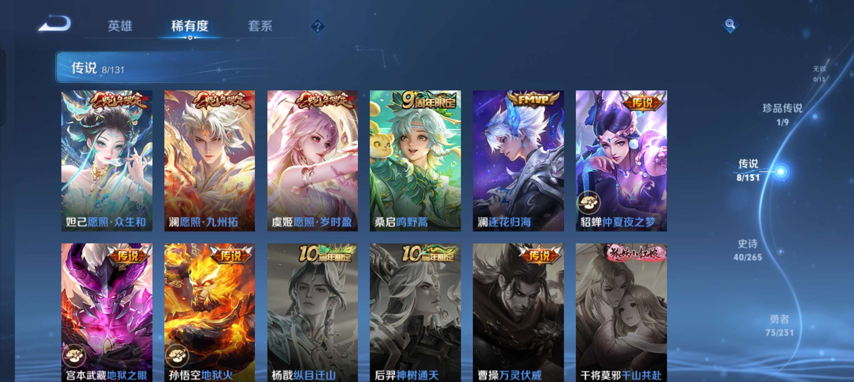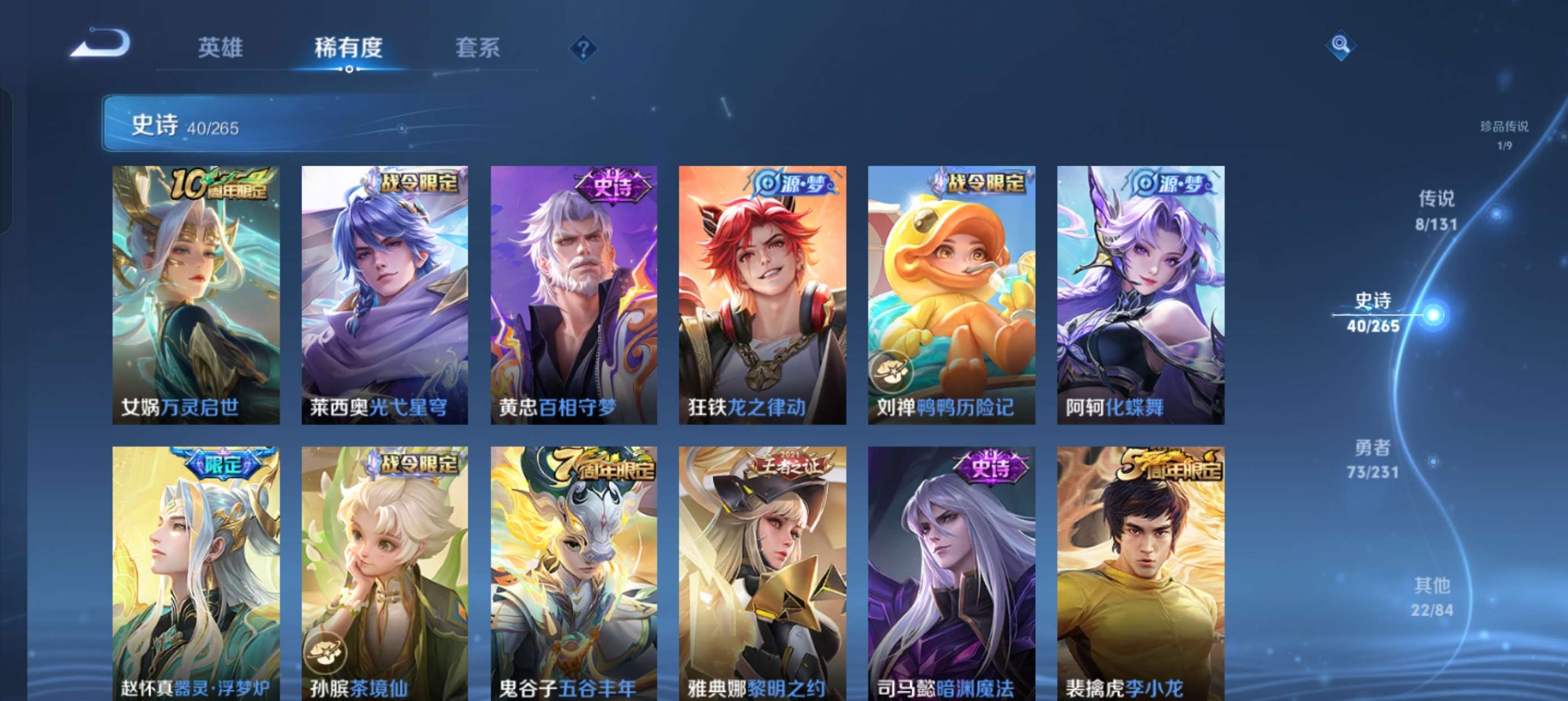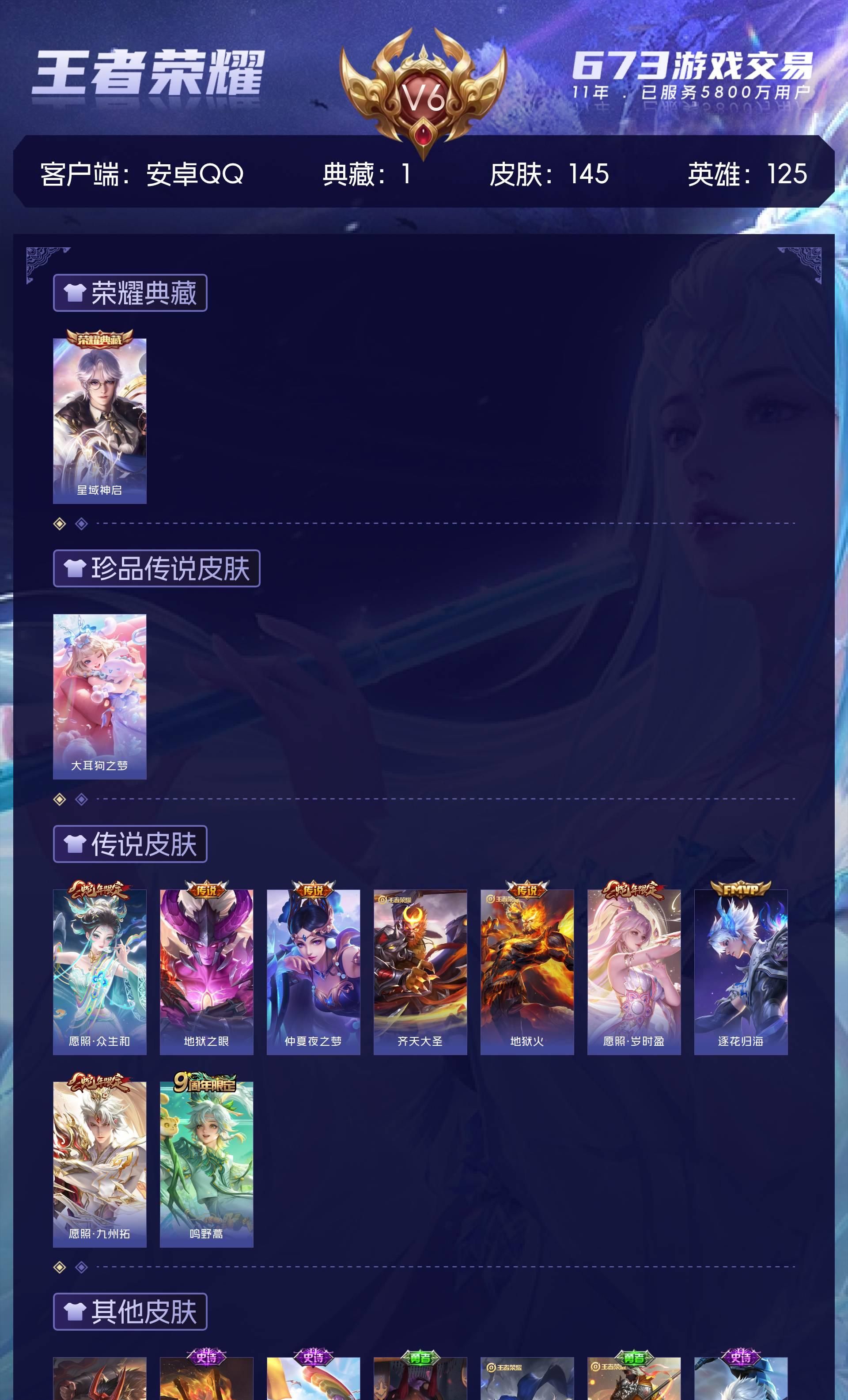V6 皮肤145 英雄125 绝世王者 荣耀典藏1 珍品传说1 星传说2 传说9 其他皮肤141