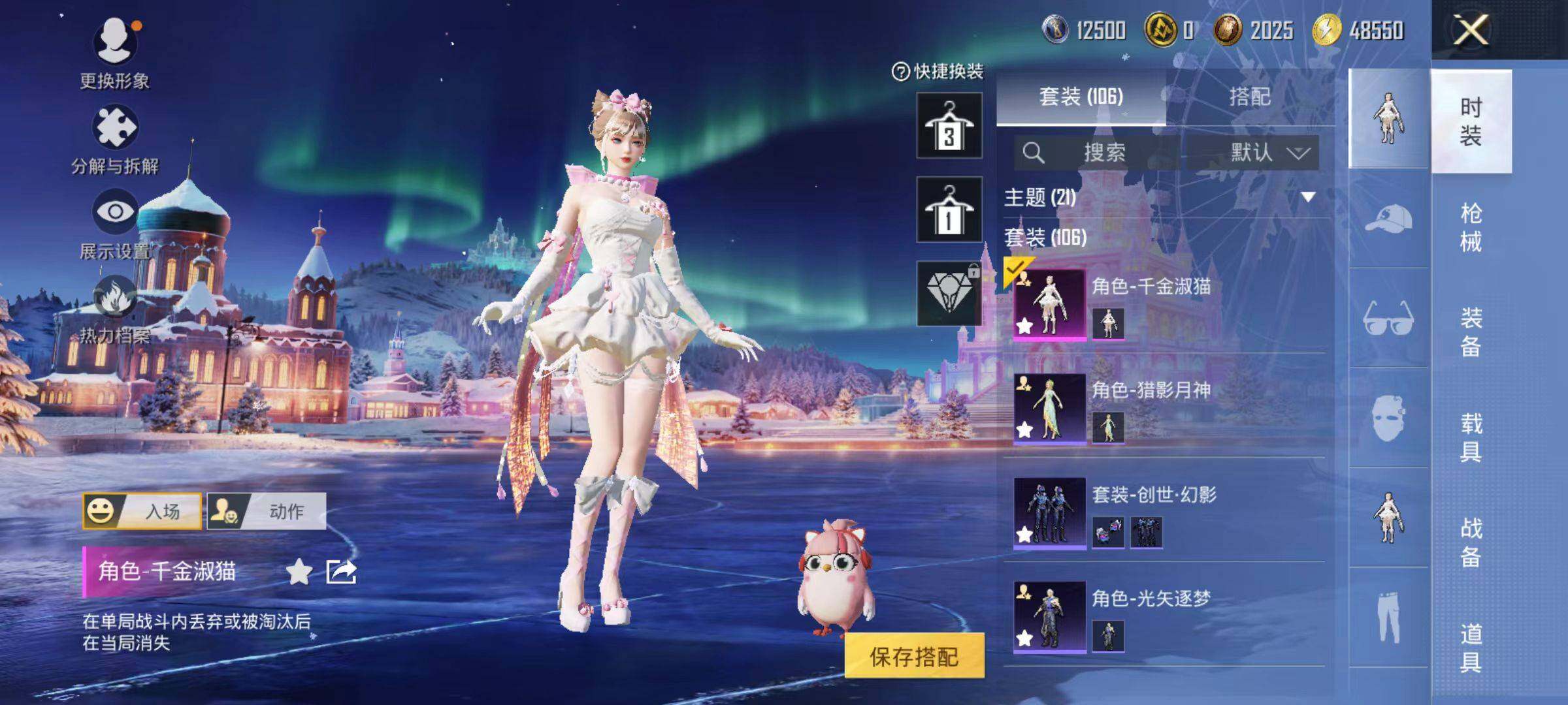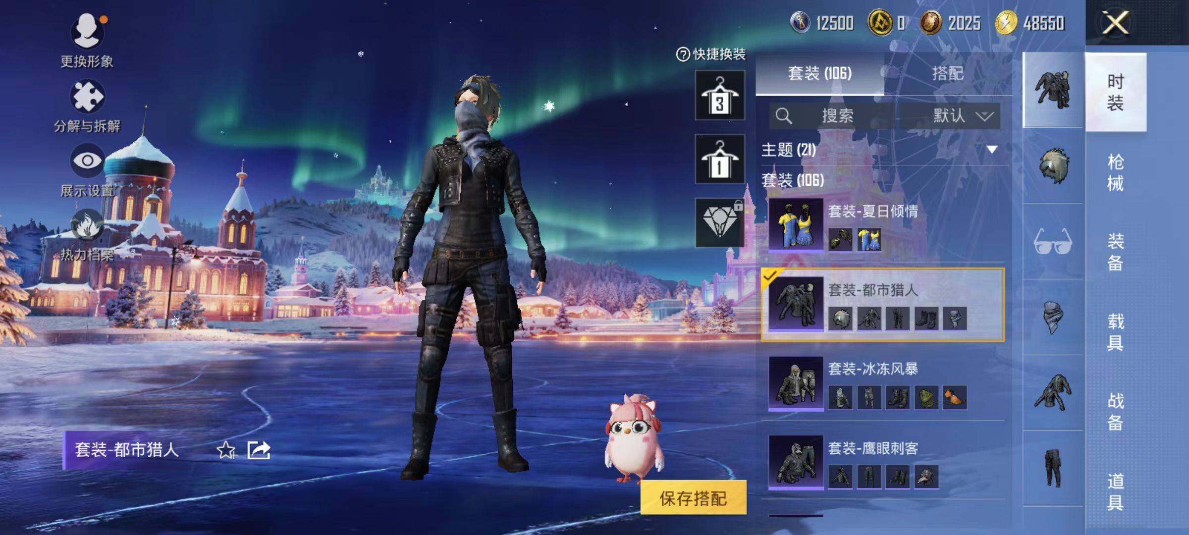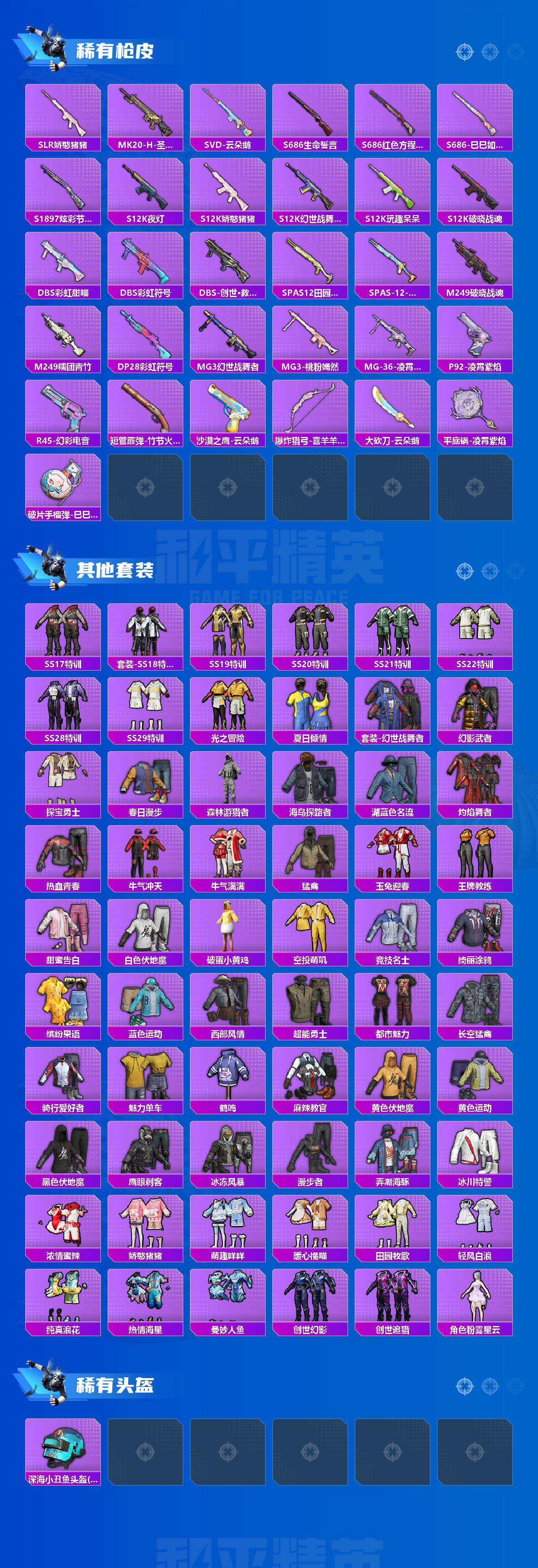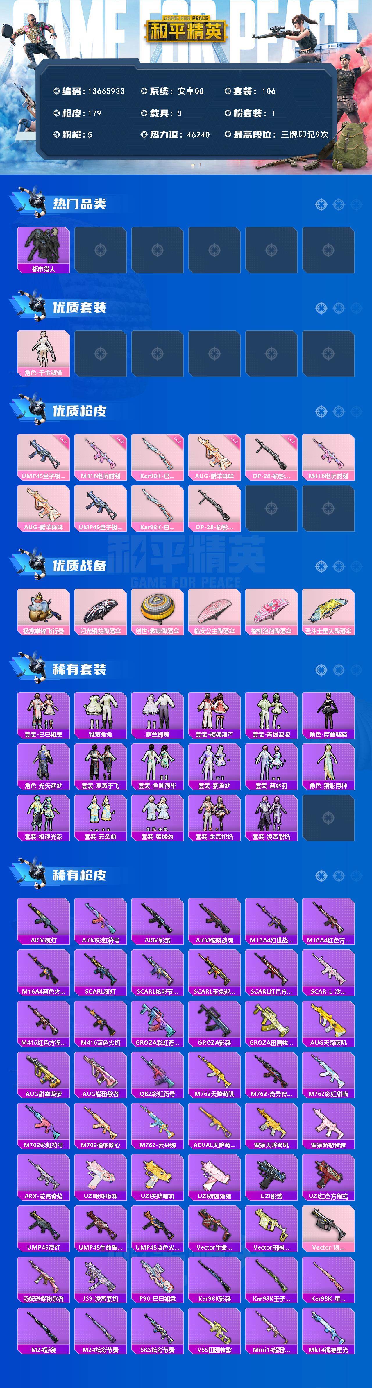 106套装/枪械5/装备190/战备131/王牌印记9/热力值46240/五级M416-电玩时刻/五级AUG-暖羊咩咩/五级UMP45-量子极限/五级Kar98K-巳巳如意/五级DP-28-豹影疾电/都市猎人/角色-千金淑猫/M416-电玩时刻/AUG-暖羊咩咩/UMP45-量子极限/Kar98K-巳巳如意/DP-28-豹影疾电/极意拳锋飞行器/闪光银龙降落伞/创世·救赎降落伞/临安公主降落伞/