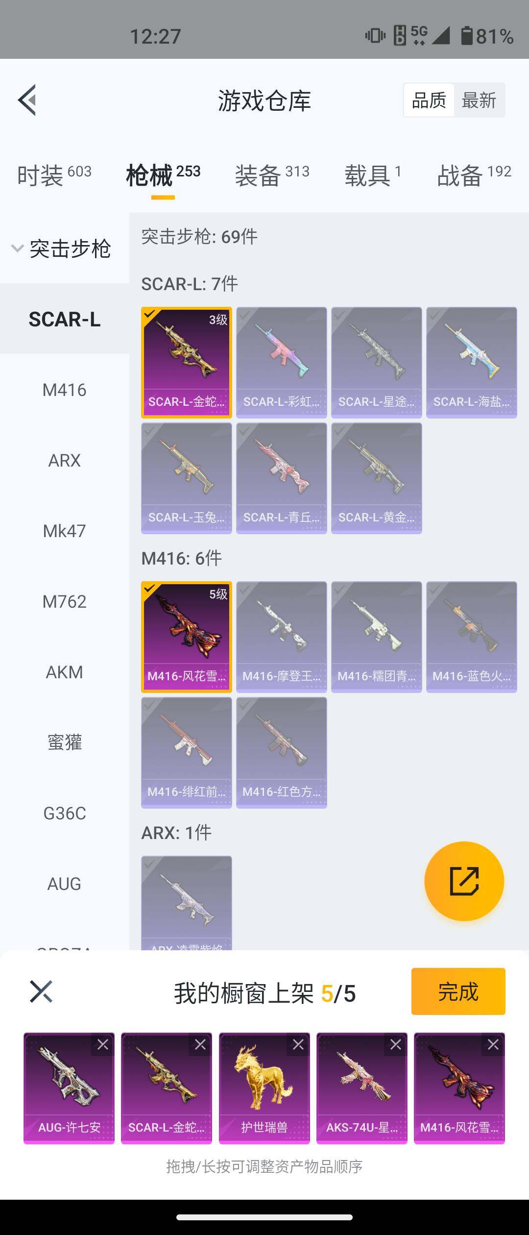 【粉色枪皮等级】:SCAR-L-金蛇镇世(三级),M416-风花雪月(五级),GROZ